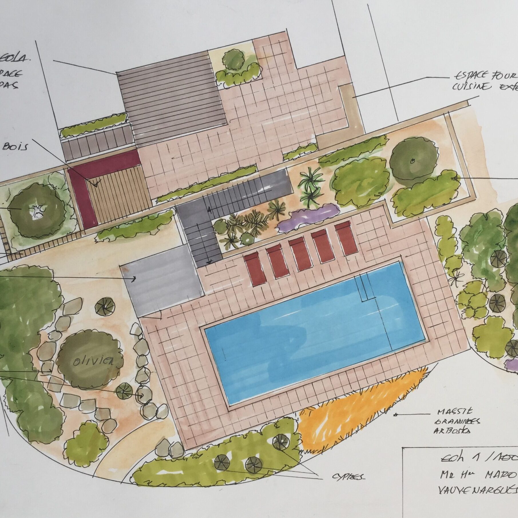 Nous vous guidons vers des solutions d’aménagement de jardins et conception de terrasses, pour vous permettre de vous projeter dans votre projet,  nous vous proposons une étude personnalisée réalisé par Patrick Bossa créateur de terrasses, jardins, espace piscine en Provence