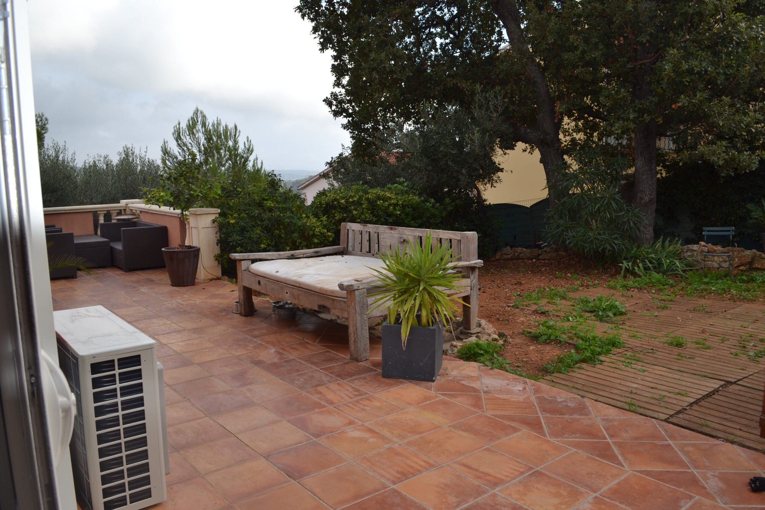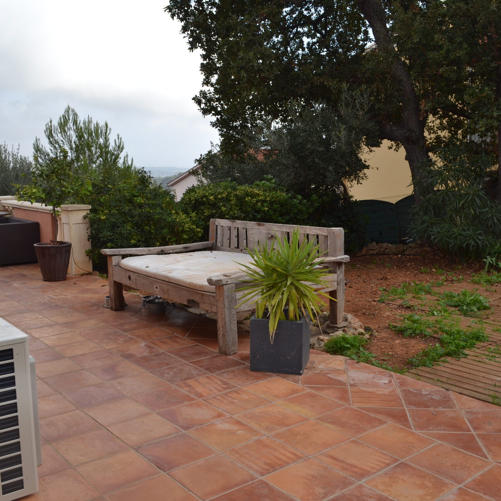 L’olivier existant dans le prolongement du parking, est encadré par un bac en traverses de bois de 40 cm de hauteur.