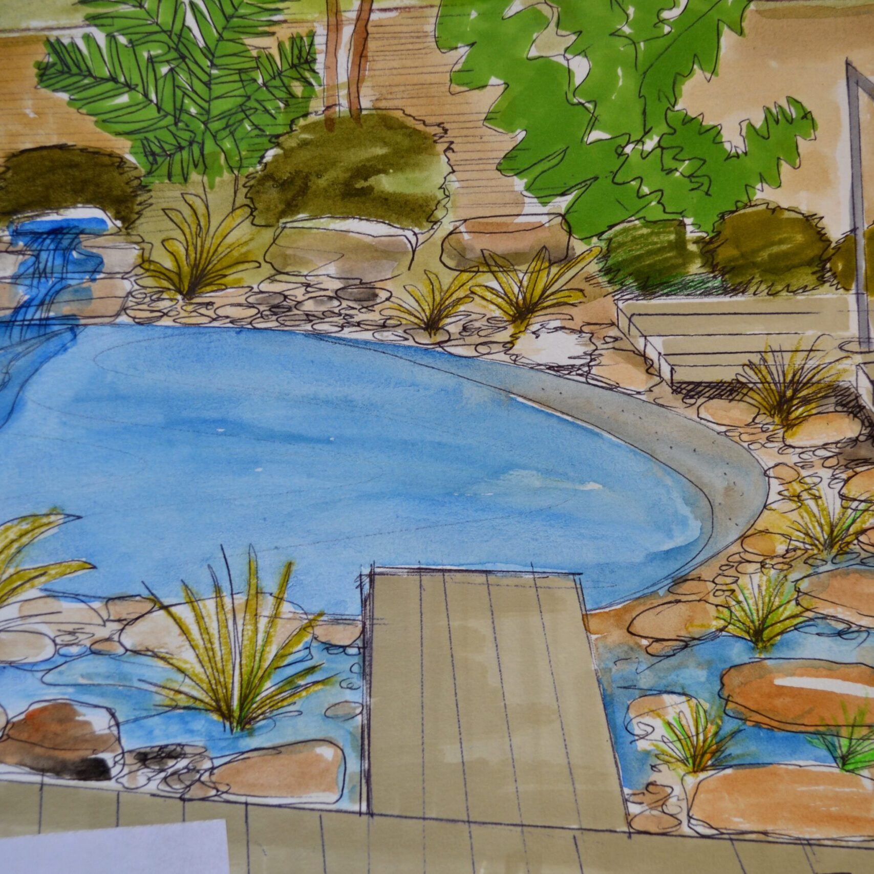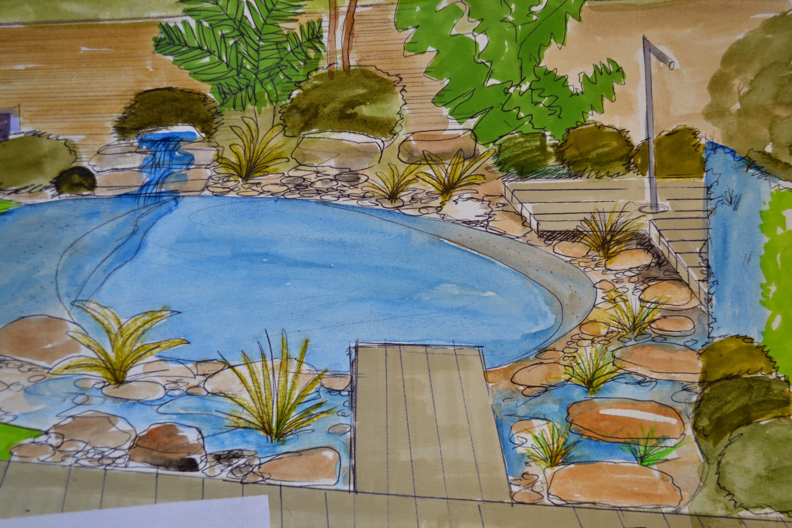 L’eau du mur d’eau s’écoule dans le bassin de baignade devant la terrasse bois, des roches, des galets, des papyrus et plantes de berge.