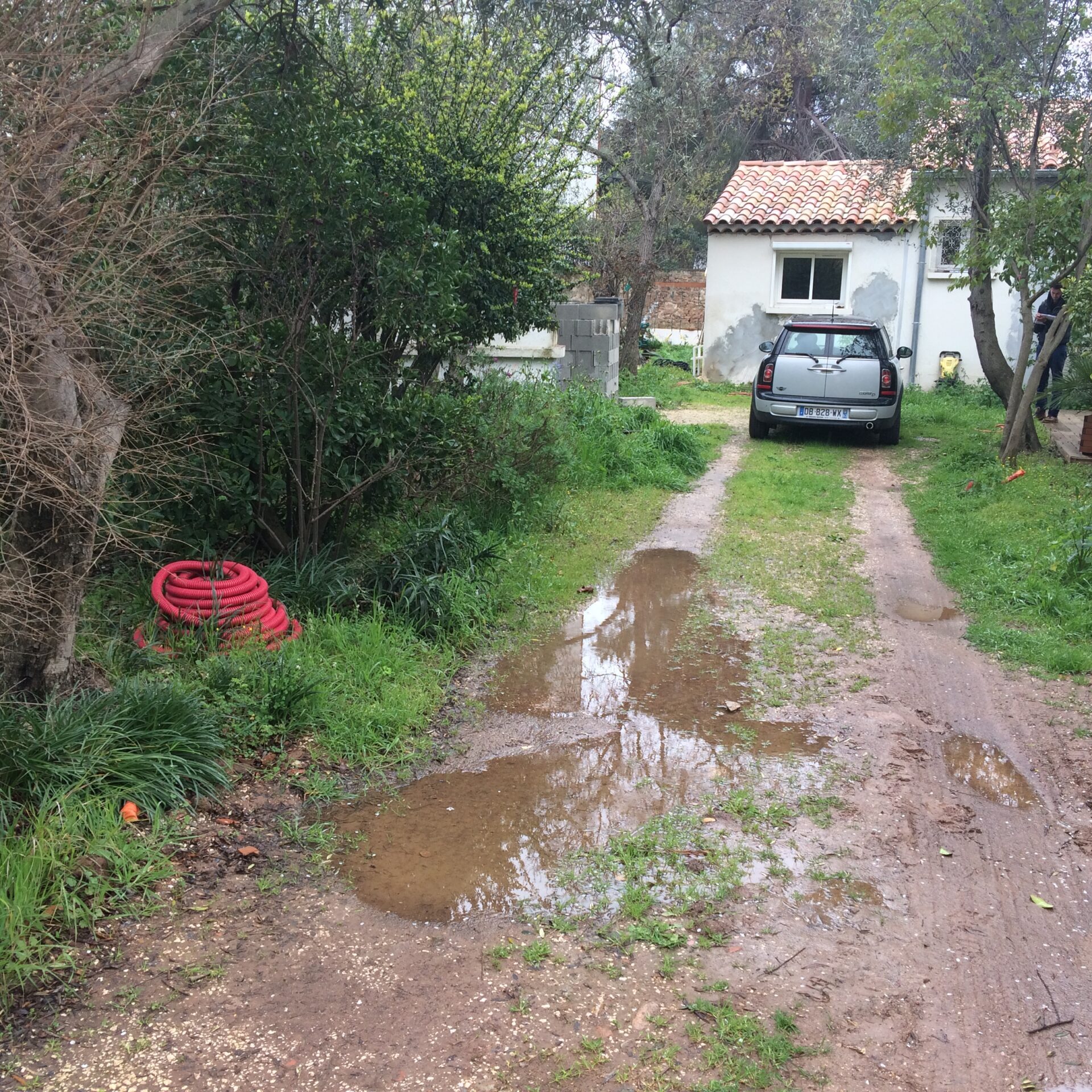 L’allée voitures en courbes, sur la gauche un jardin sec, de roches et galets, sur la droite, une étroite bande de gazon Zoyzia, la passerelle de bois du chemin vers le jardin de Toscane.