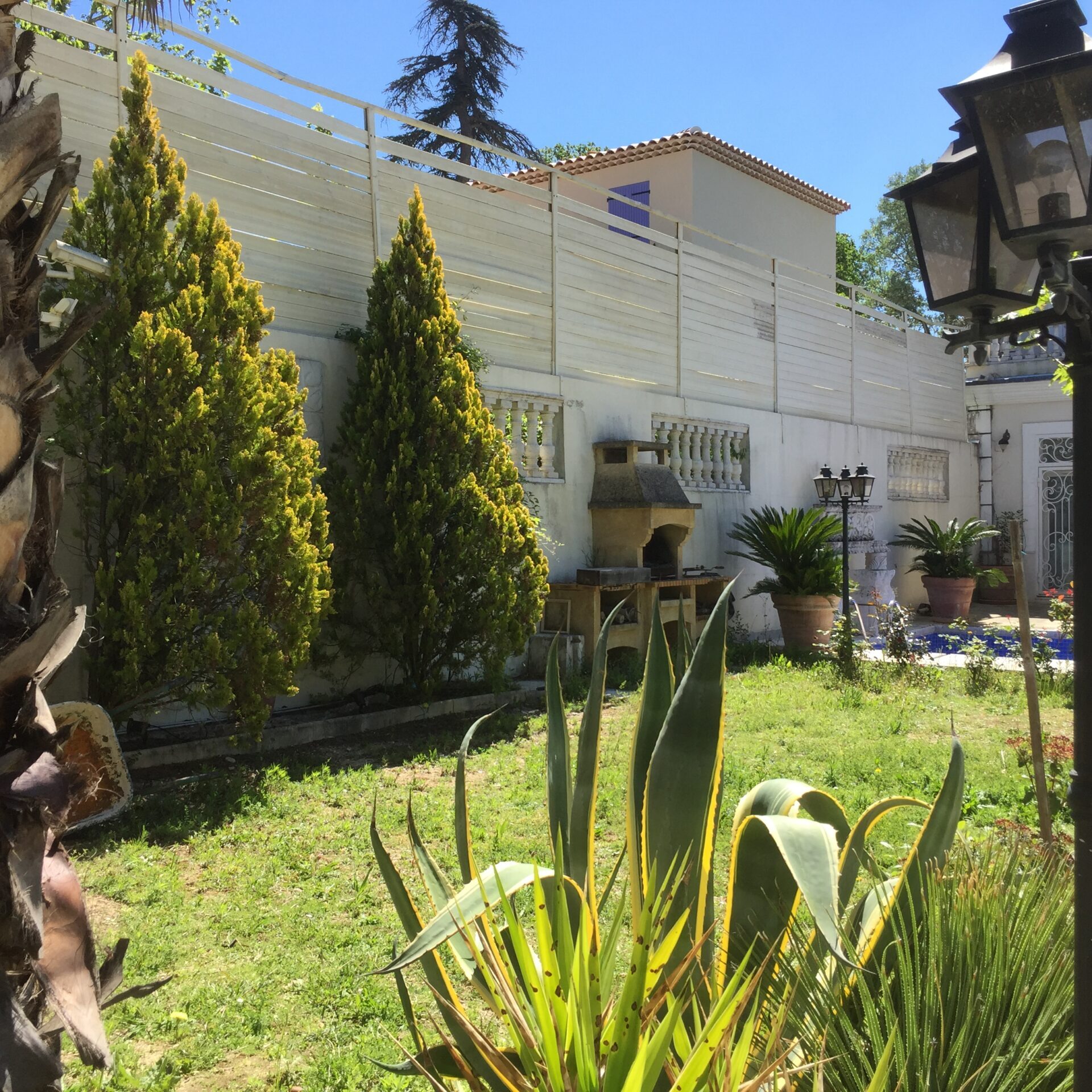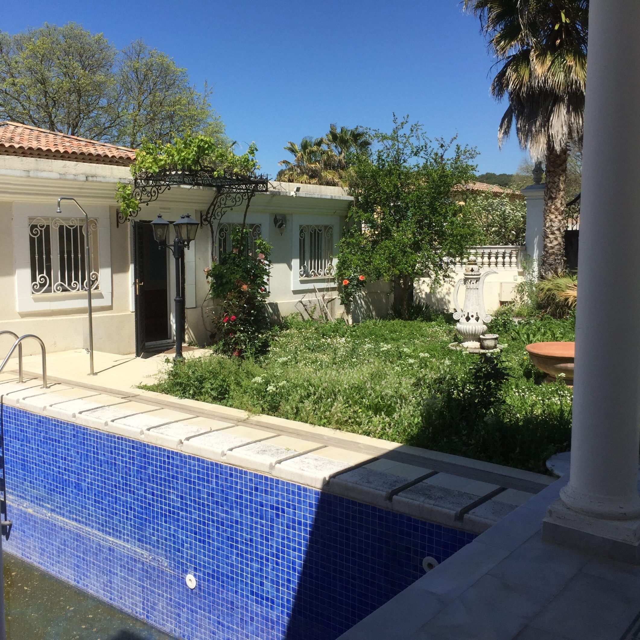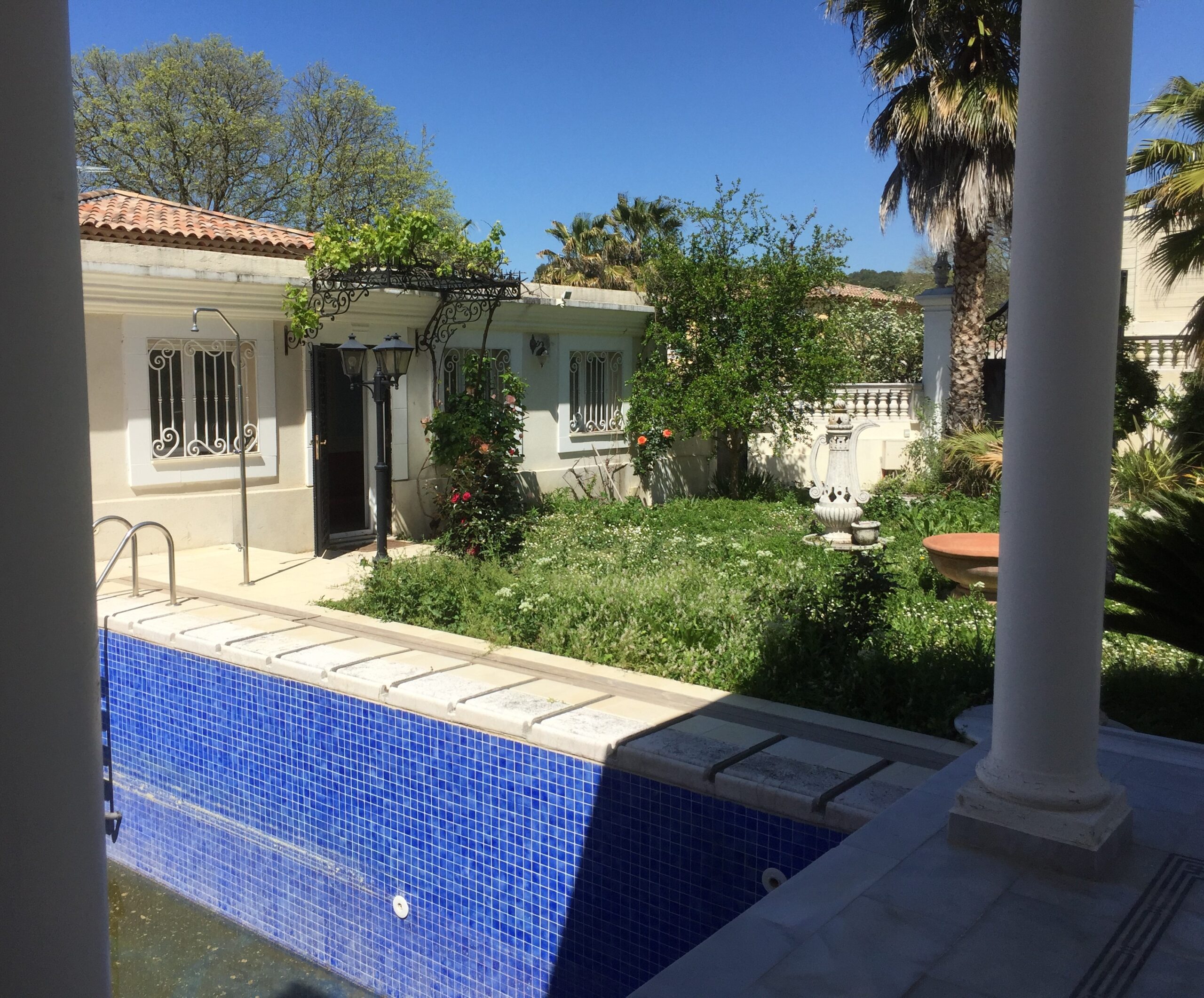 La piscine miroir de 9 x 4,2 parallèle à l’allée centrale, les plages en bois exotique, les chaises longues sous les treilles de plantes grimpantes, jasmins, rosiers anciens.