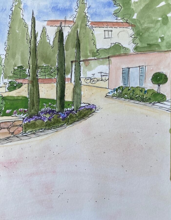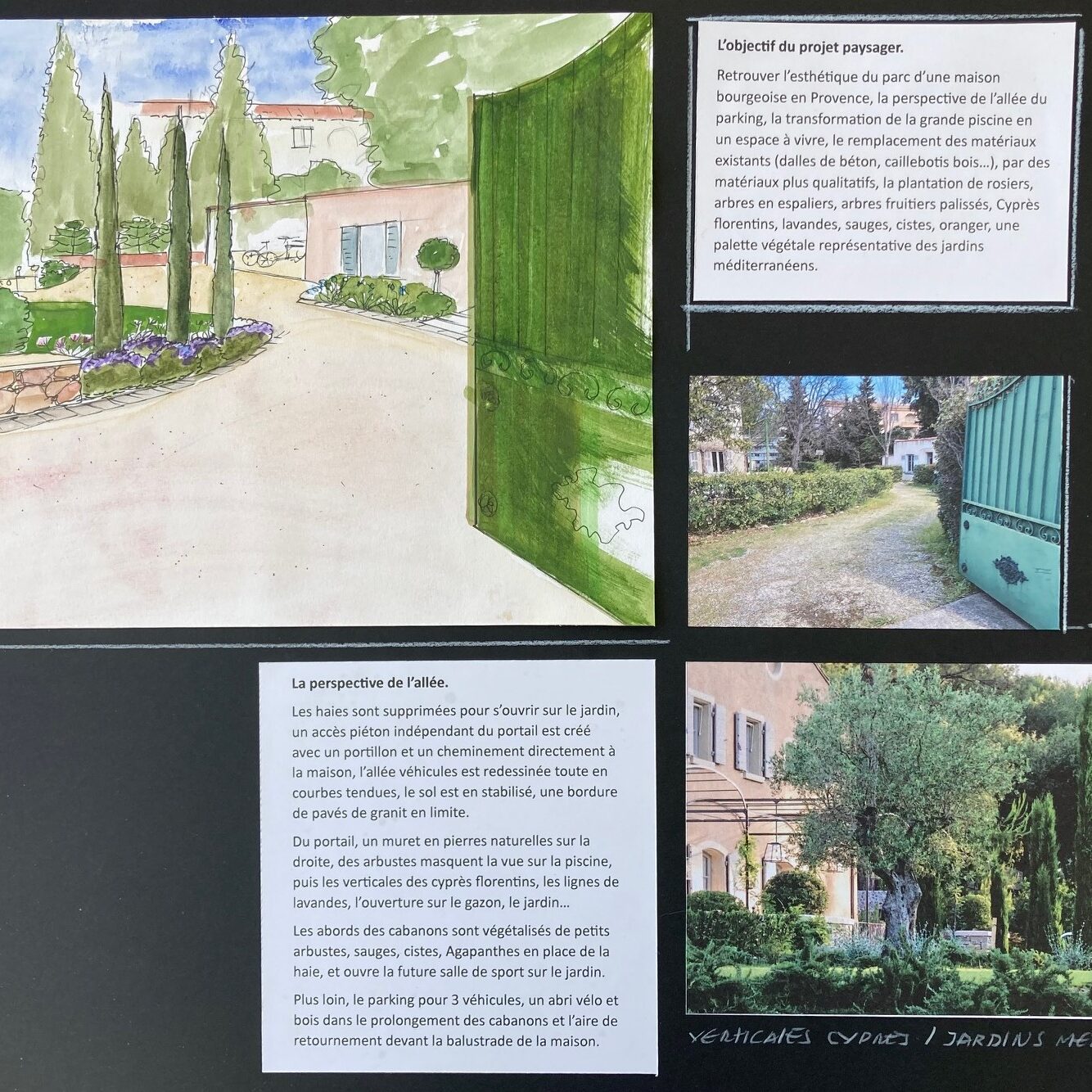 Du portail, un muret de pierres naturelles, des arbustes masquent la vue sur la piscine, puis les verticales des cyprès  florentins, les lignes des lavandes, l’ouverture sur le gazon, le jardins…