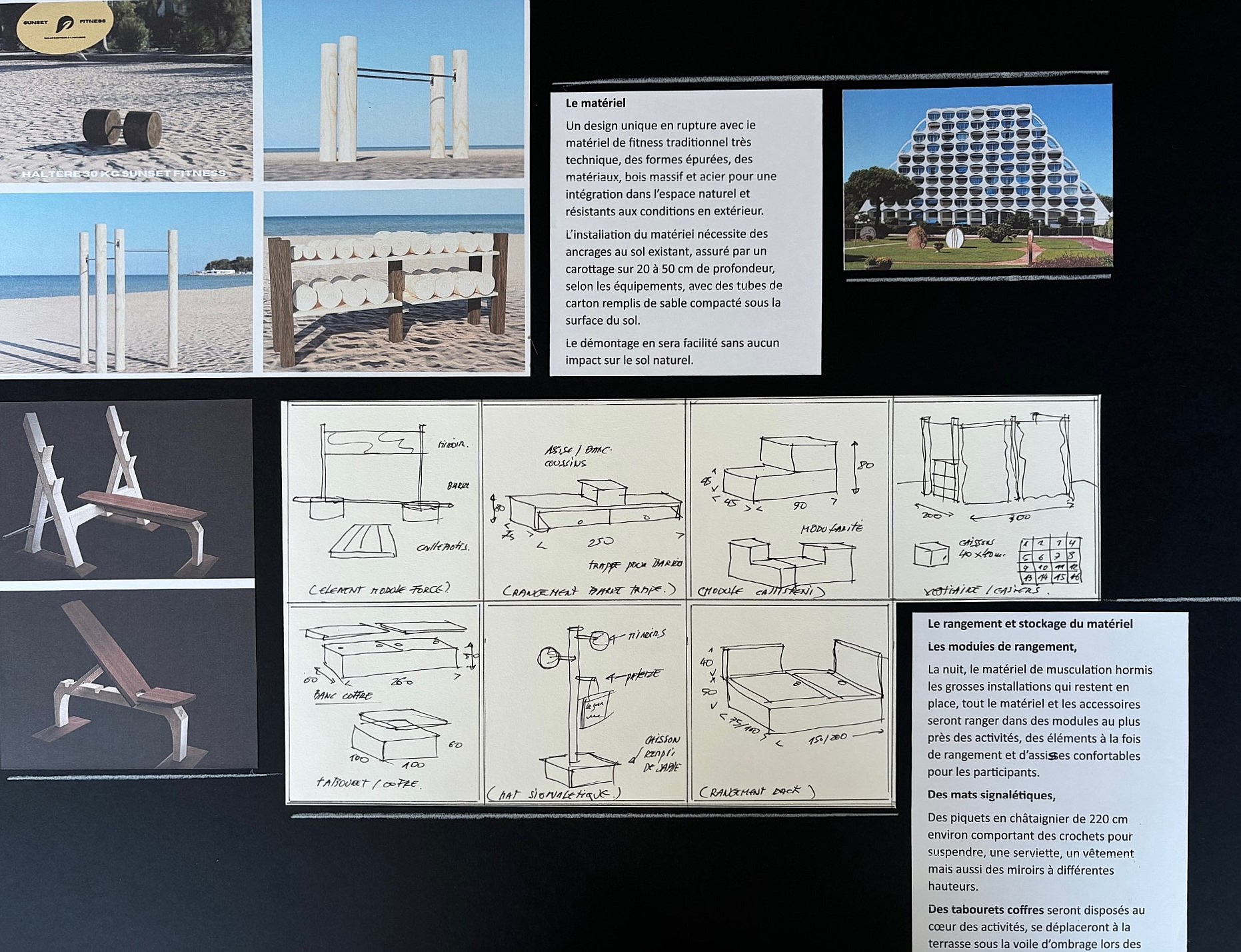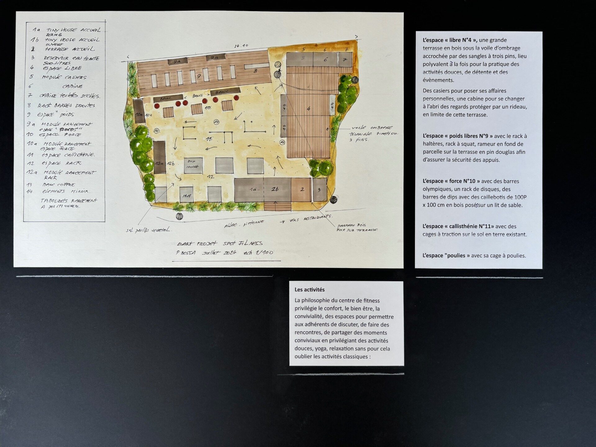 La nuit, le matériel de musculation hormis les grosses installations qui restent en place, tout le matériel et les accessoires seront ranger dans des modules au plus près des activités.
