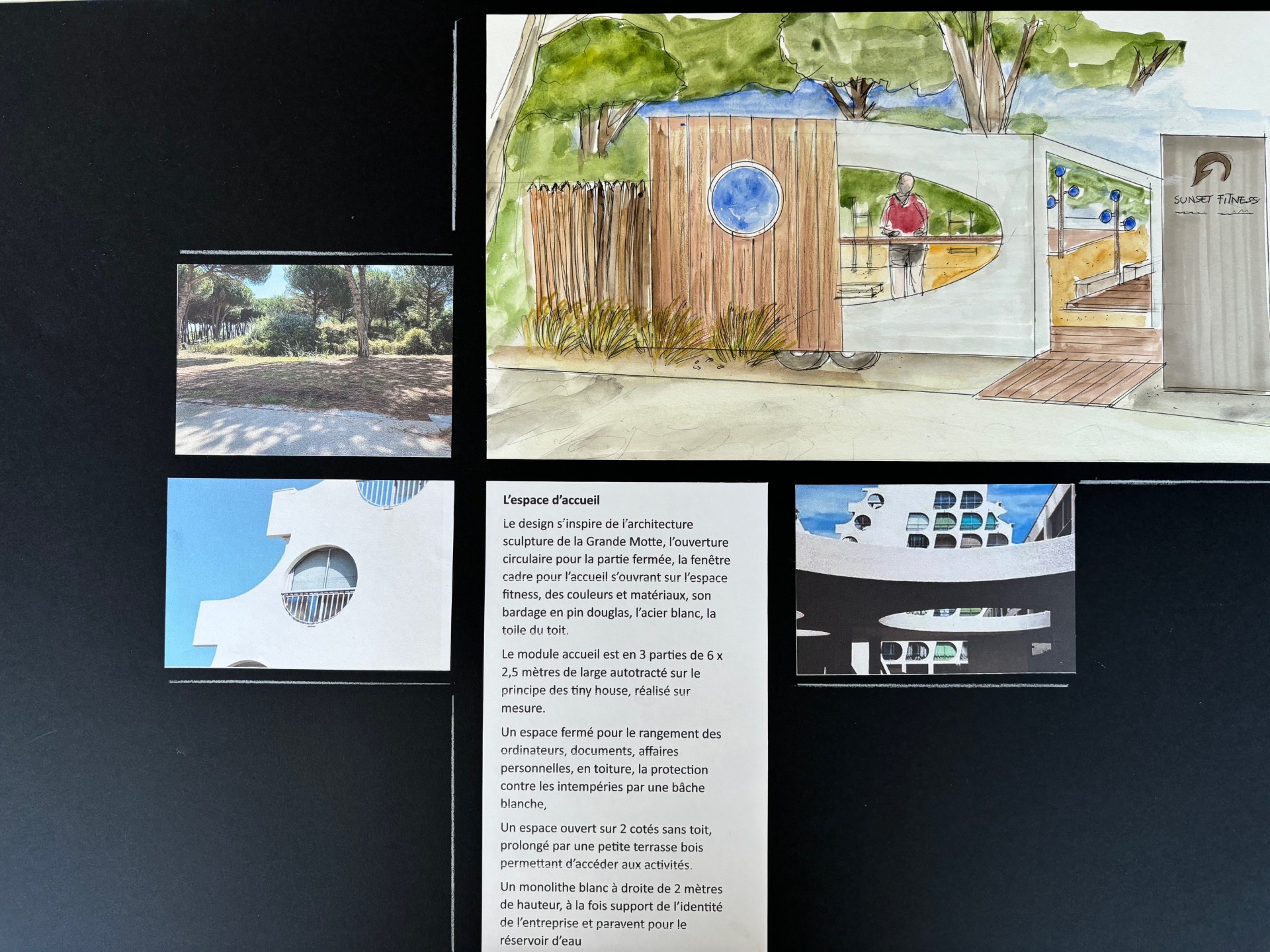 Le design du module autotracté de l’accueil s’inspire de l’architecture sculpture de la Grande Motte, l’ouverture circulaire pour la partie fermée, la fenêtre cadre pour l’accueil s’ouvrant sur l’espace fitness, deux matériaux : le bardage en pin douglas et l’acier blanc.