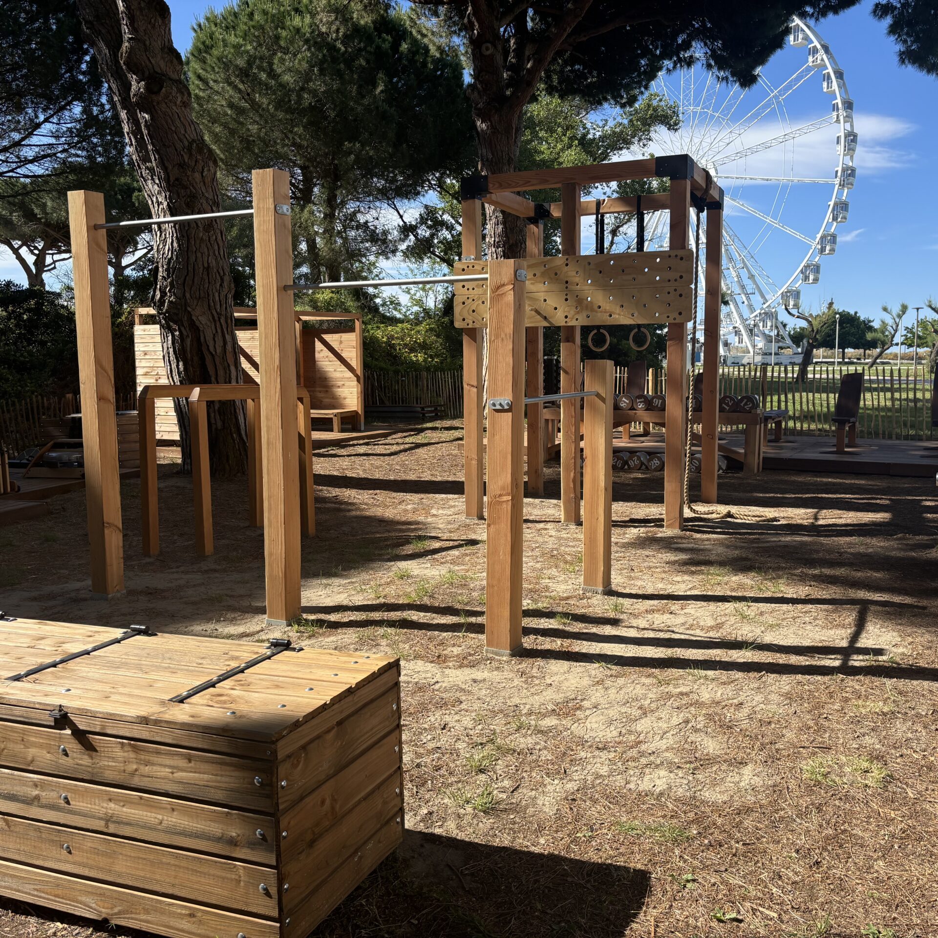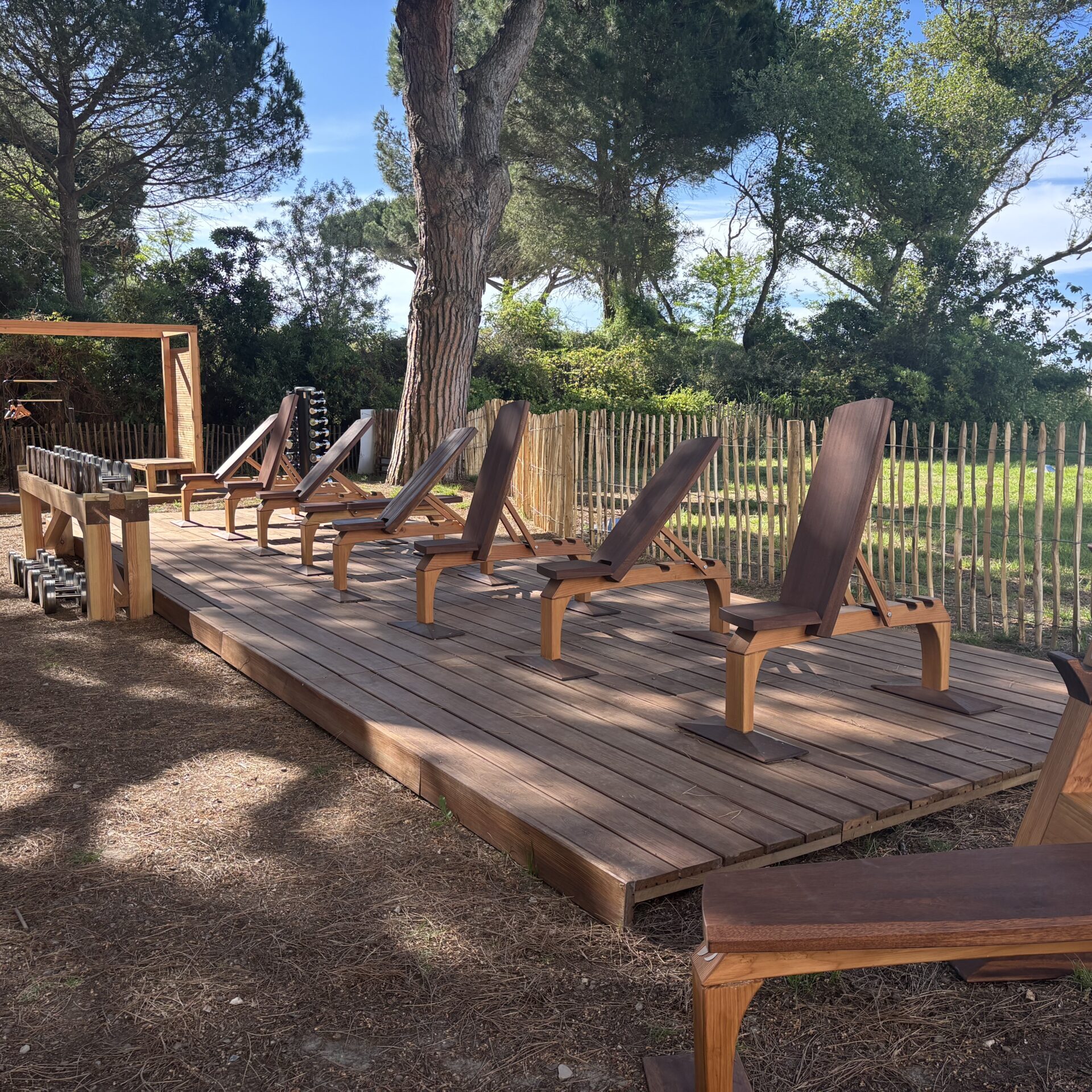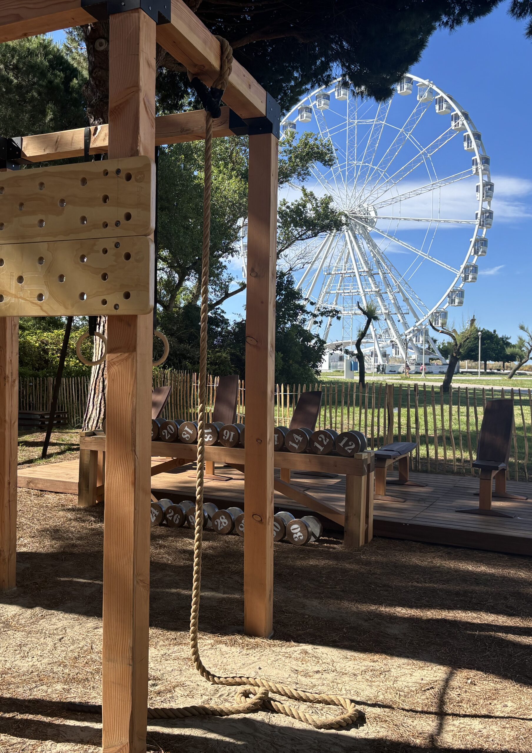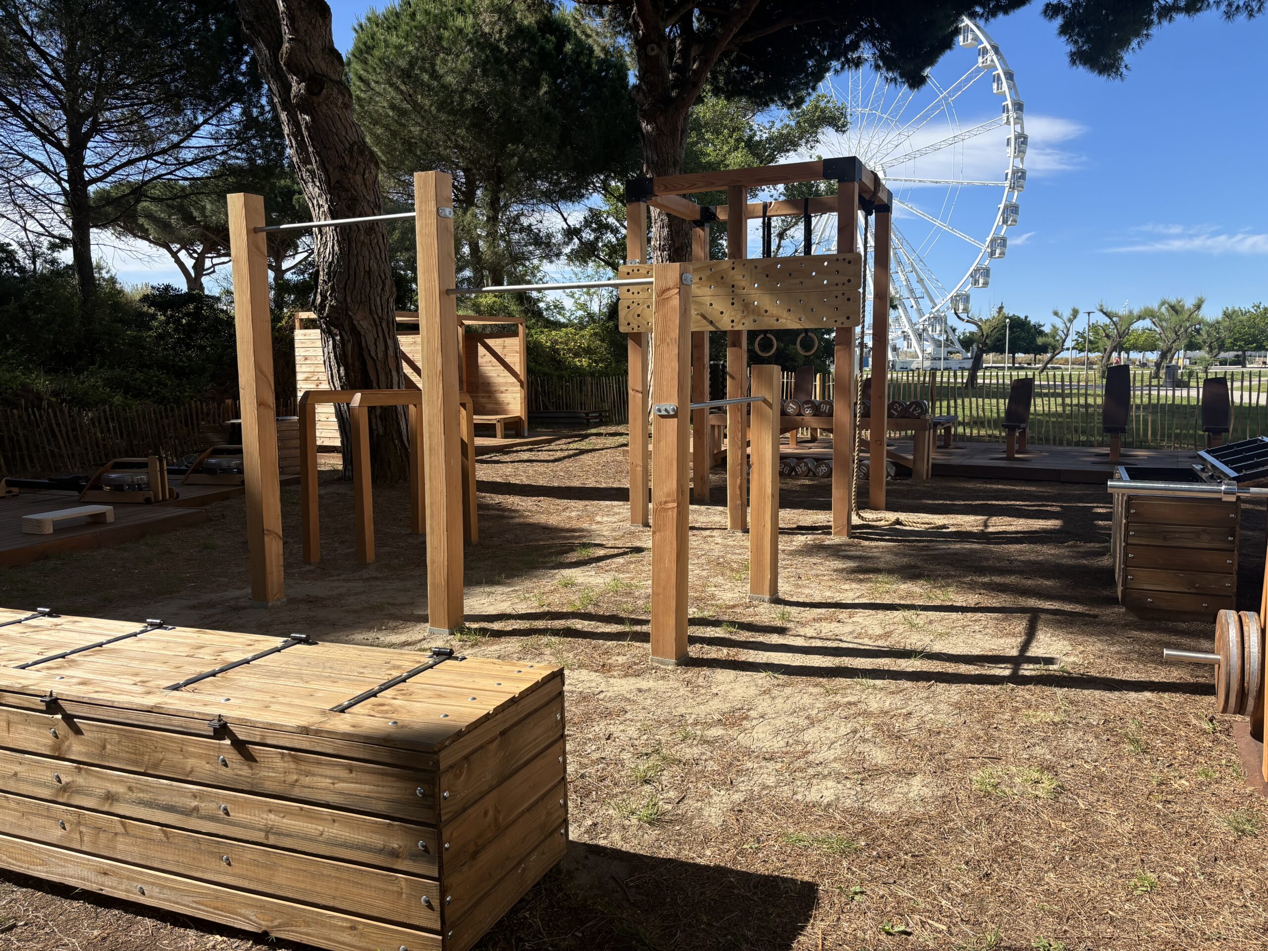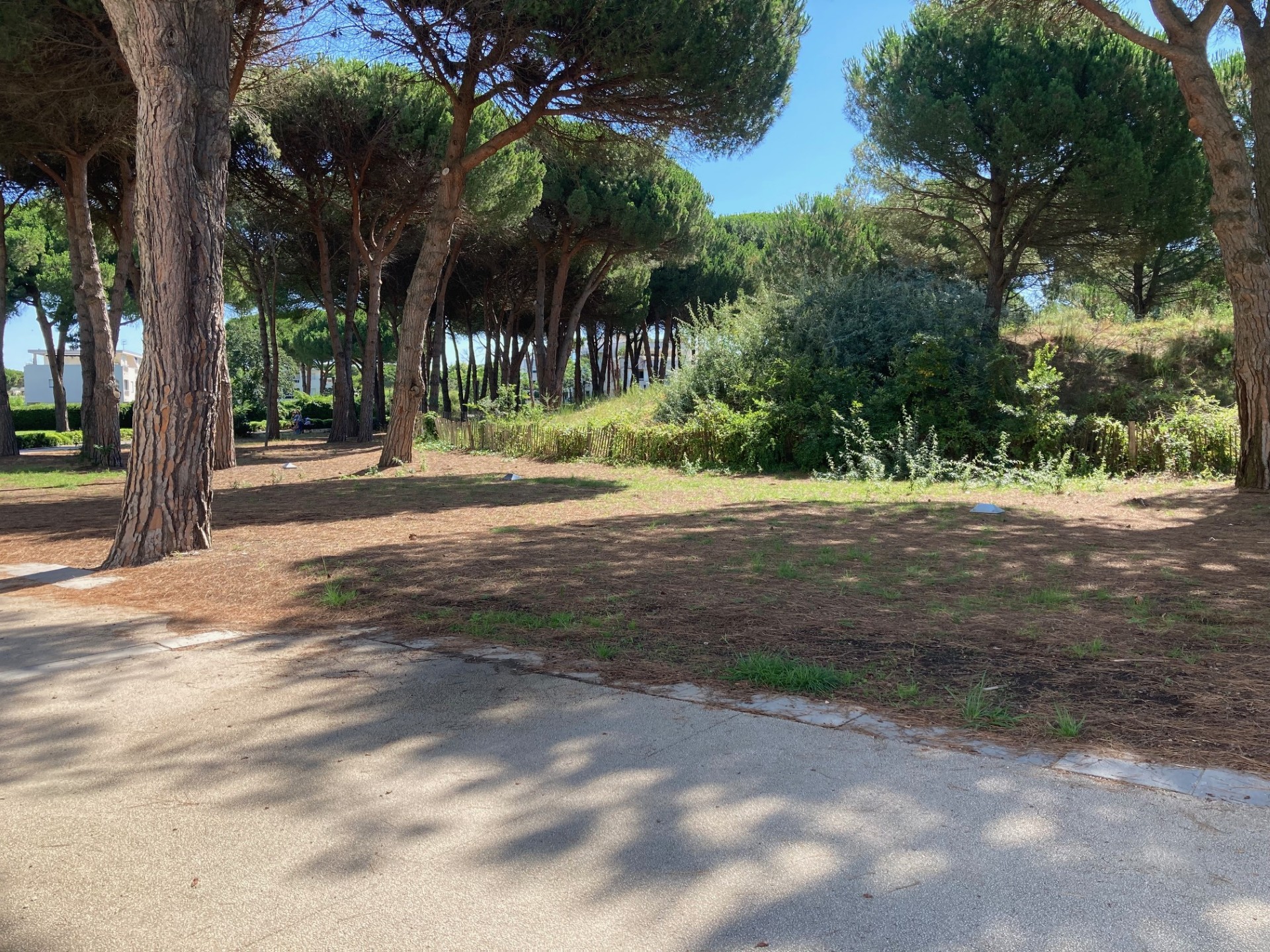 L’aménagement d’une zone de fitness sur une zone naturelle, en limite d’une bute témoin de la végétalisation originelle de la Grande Motte sous les pins.