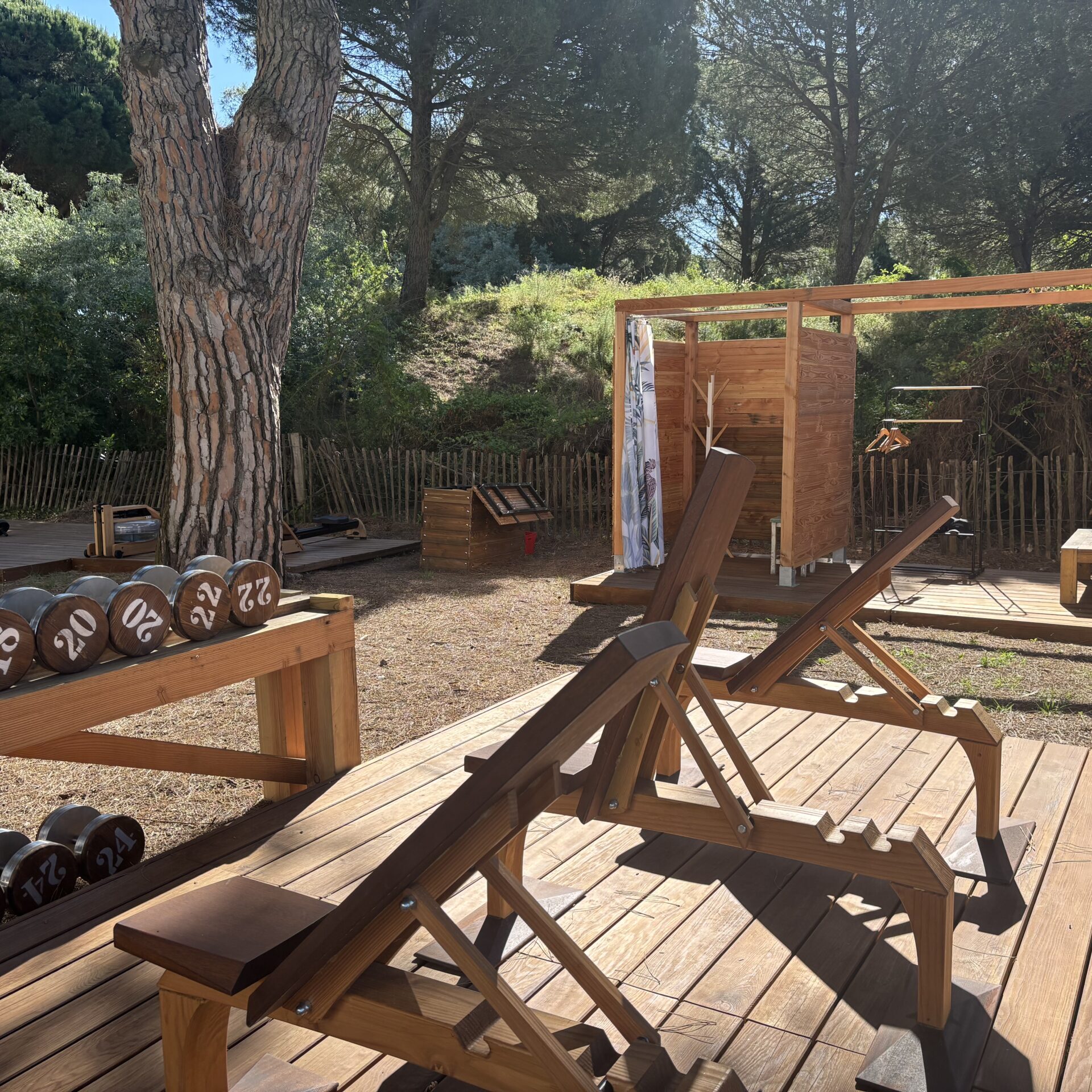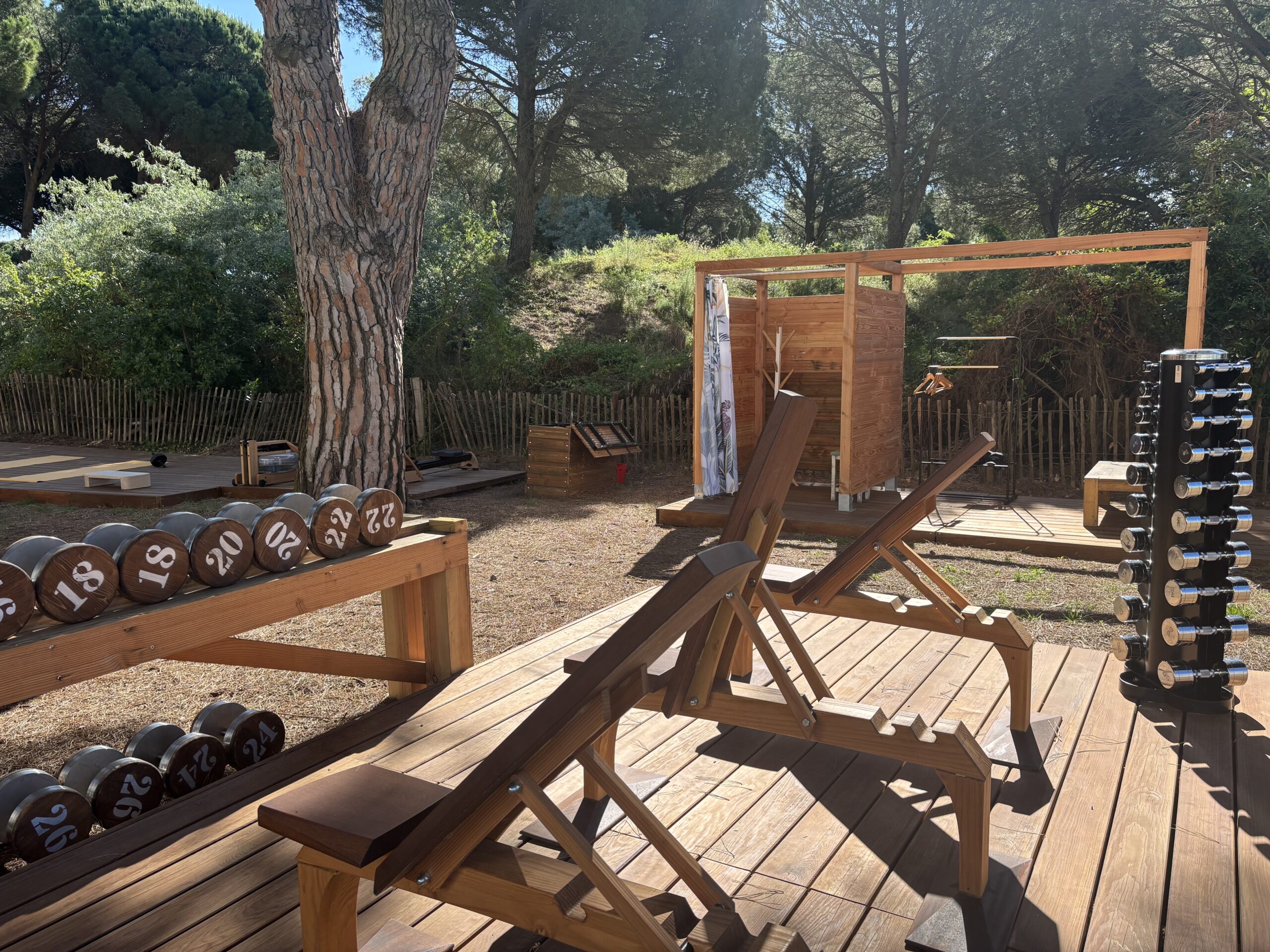 Des casiers pour poser ses affaires personnelles, une cabine pour se changer à l’abri des regards protéger par un rideau, en limite de cette terrasse.