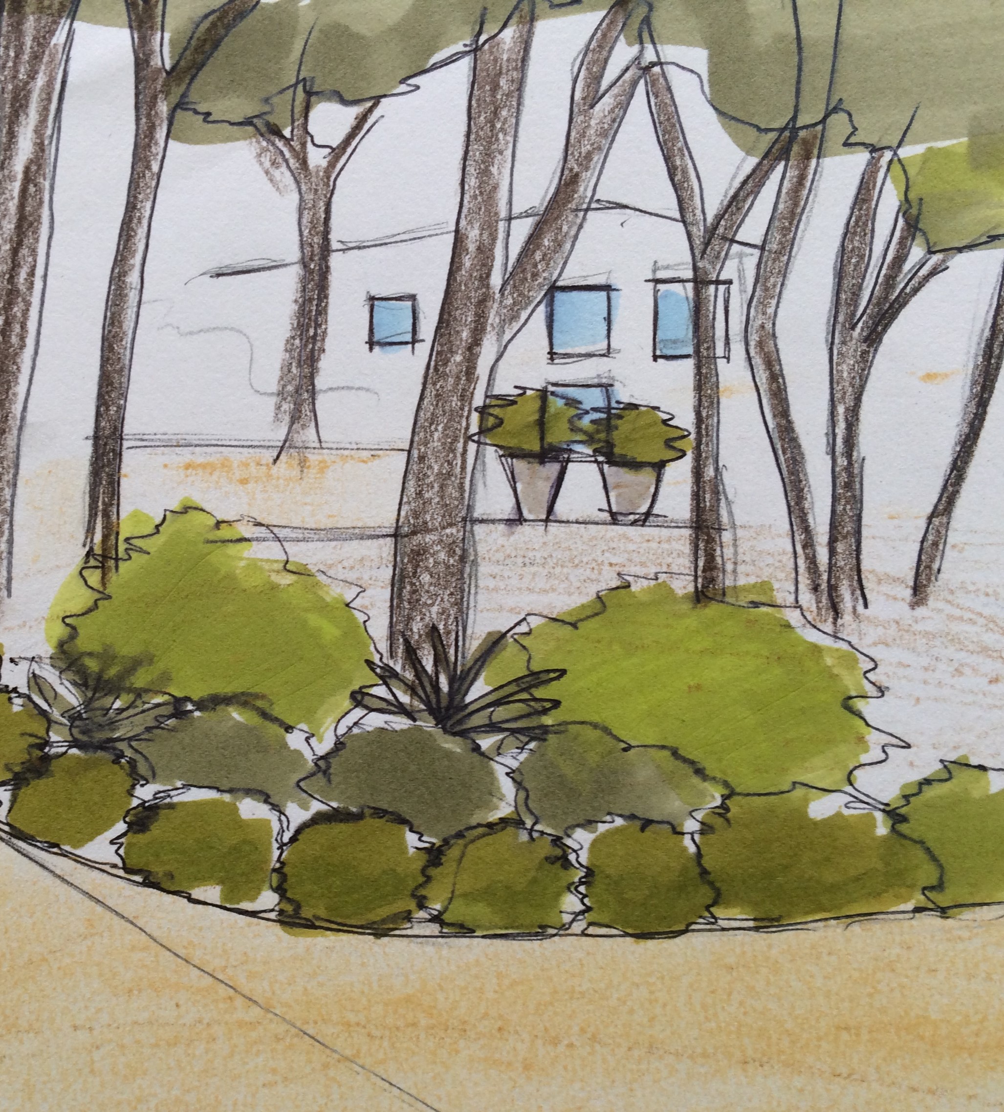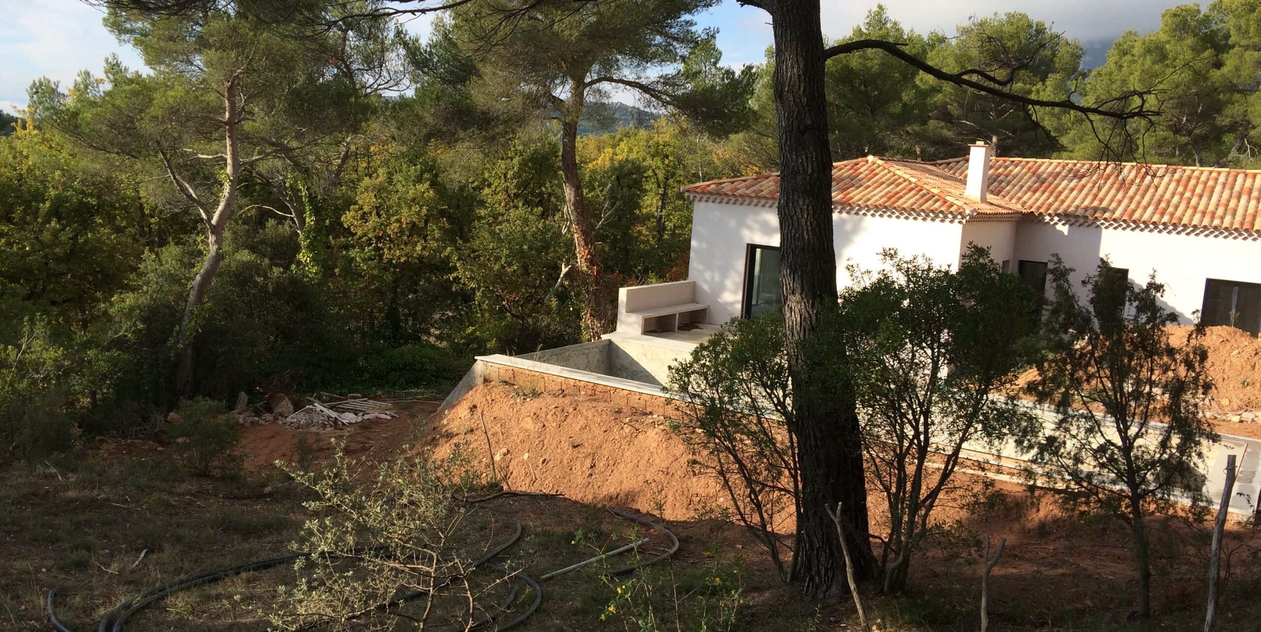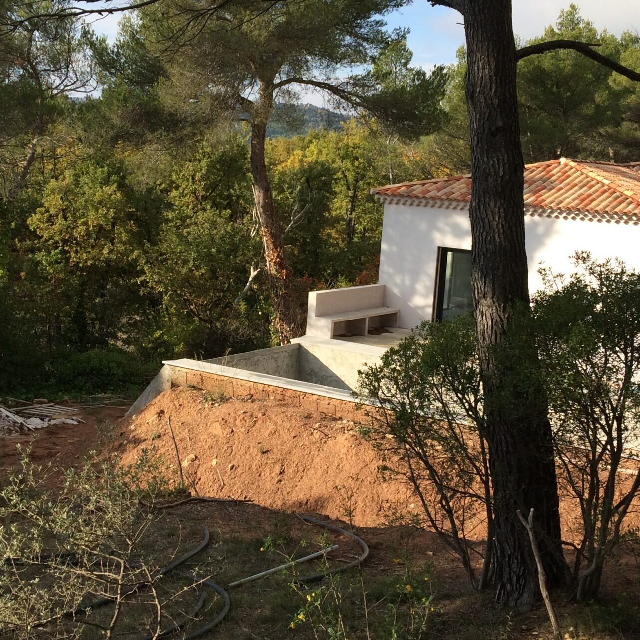 Quelques pins sont abattus pour prévenir des incendies et dégager l’espace, les talus se transforment en deux restanques, un muret de soutènement en gabions de pierre récupérées sur le terrain.