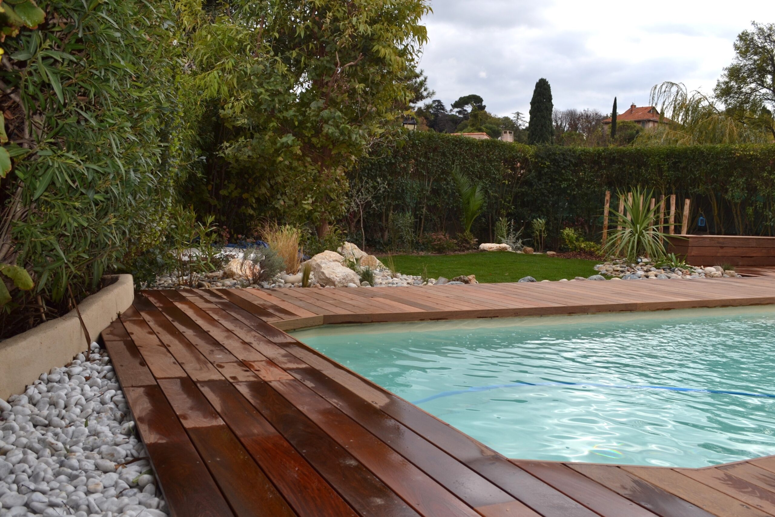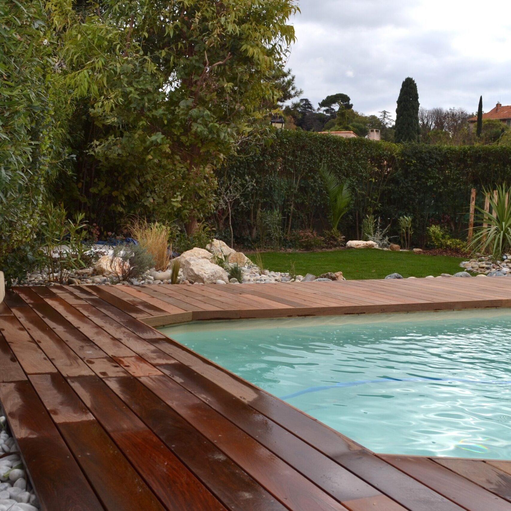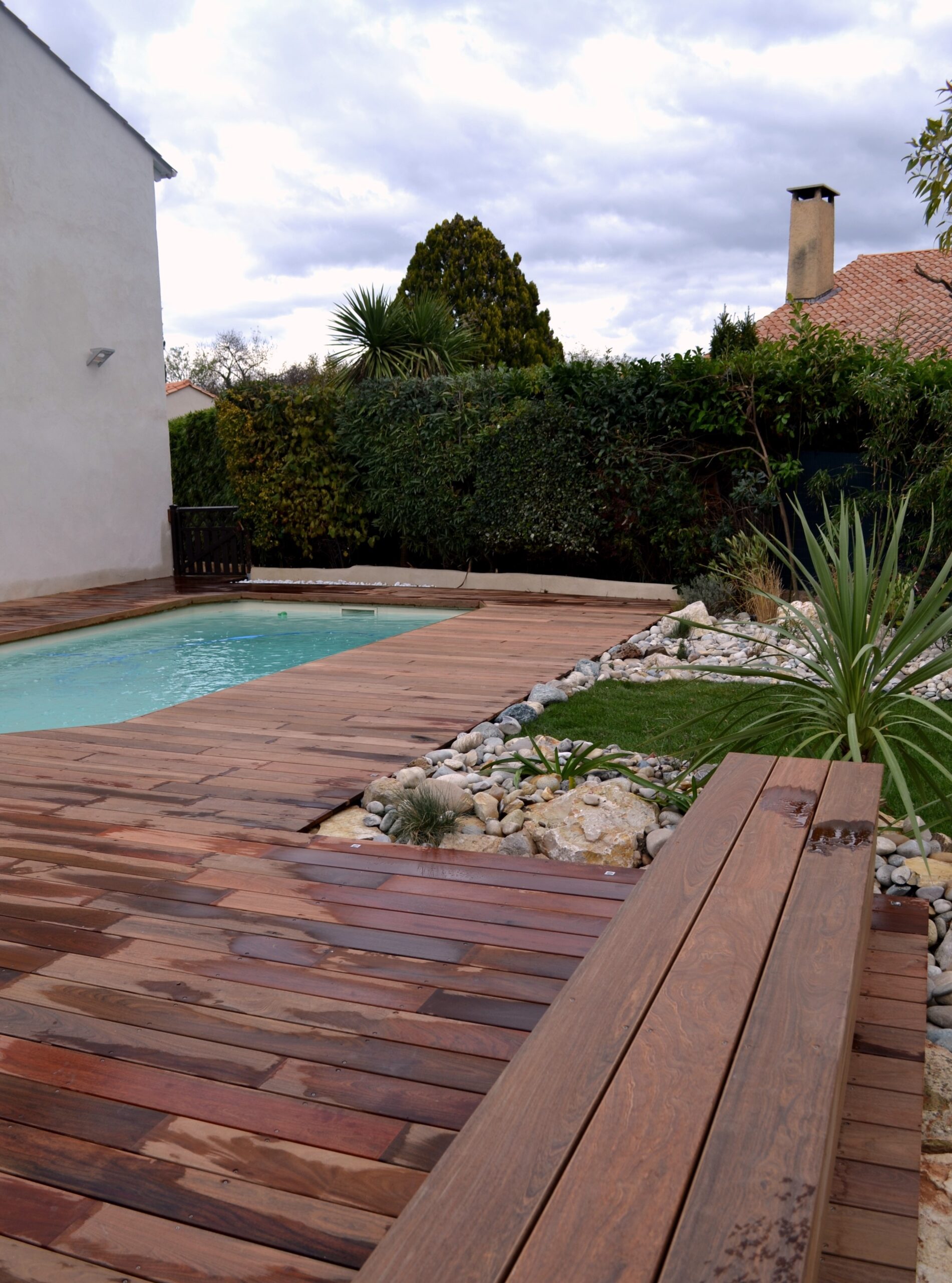 La terrasse en bois exotique de la piscine épousant les formes de la piscine, un espace salon, le solarium, une banquette.