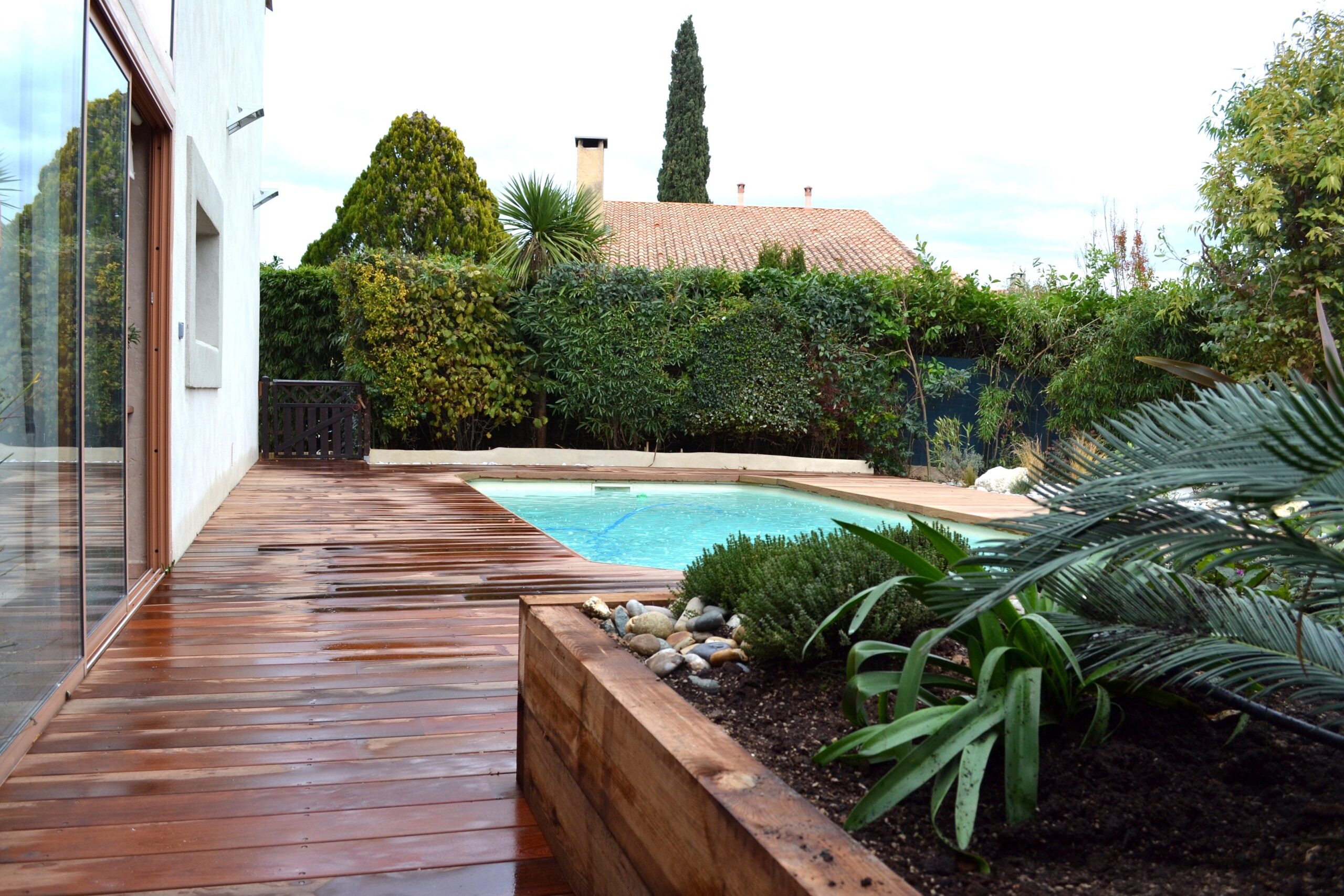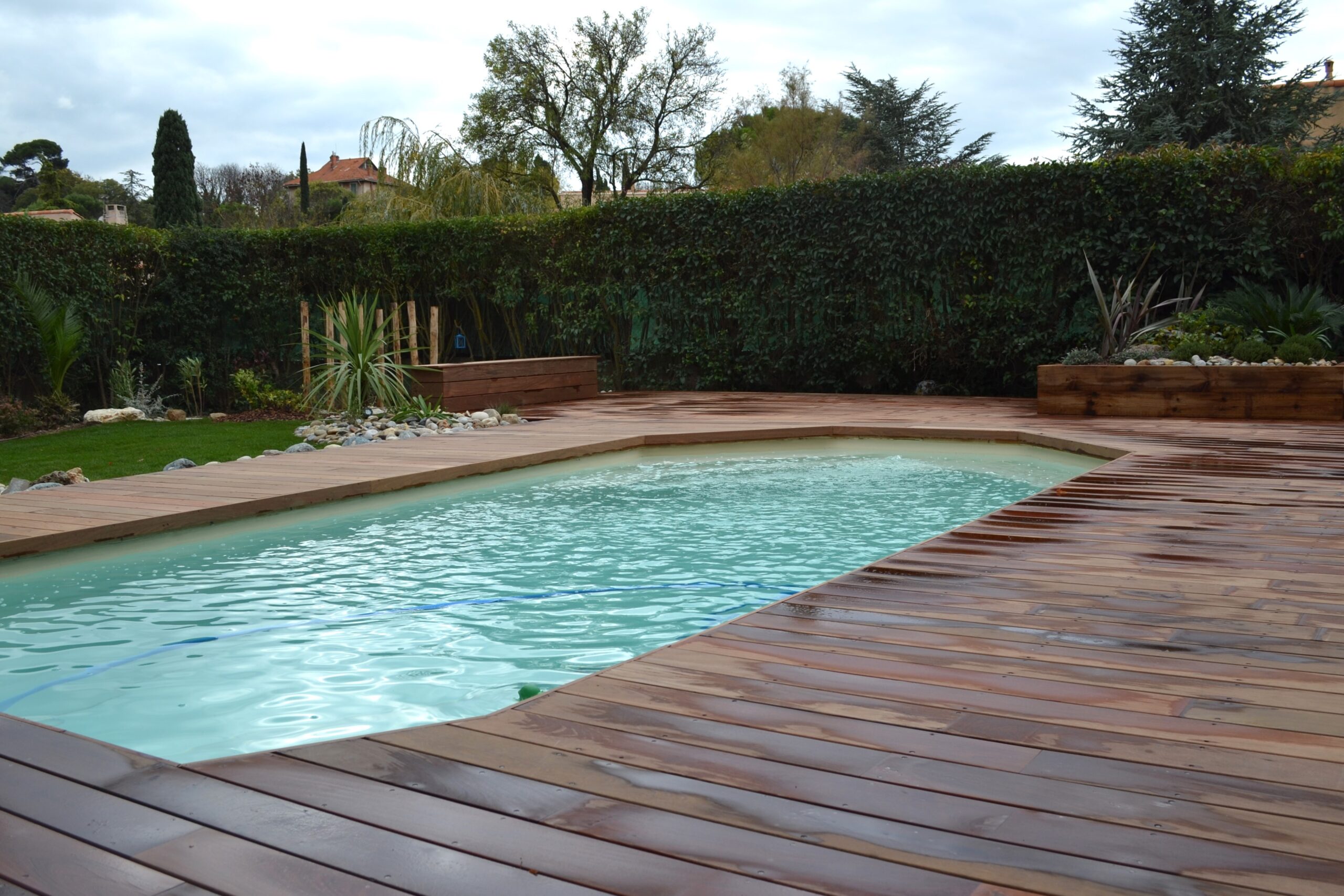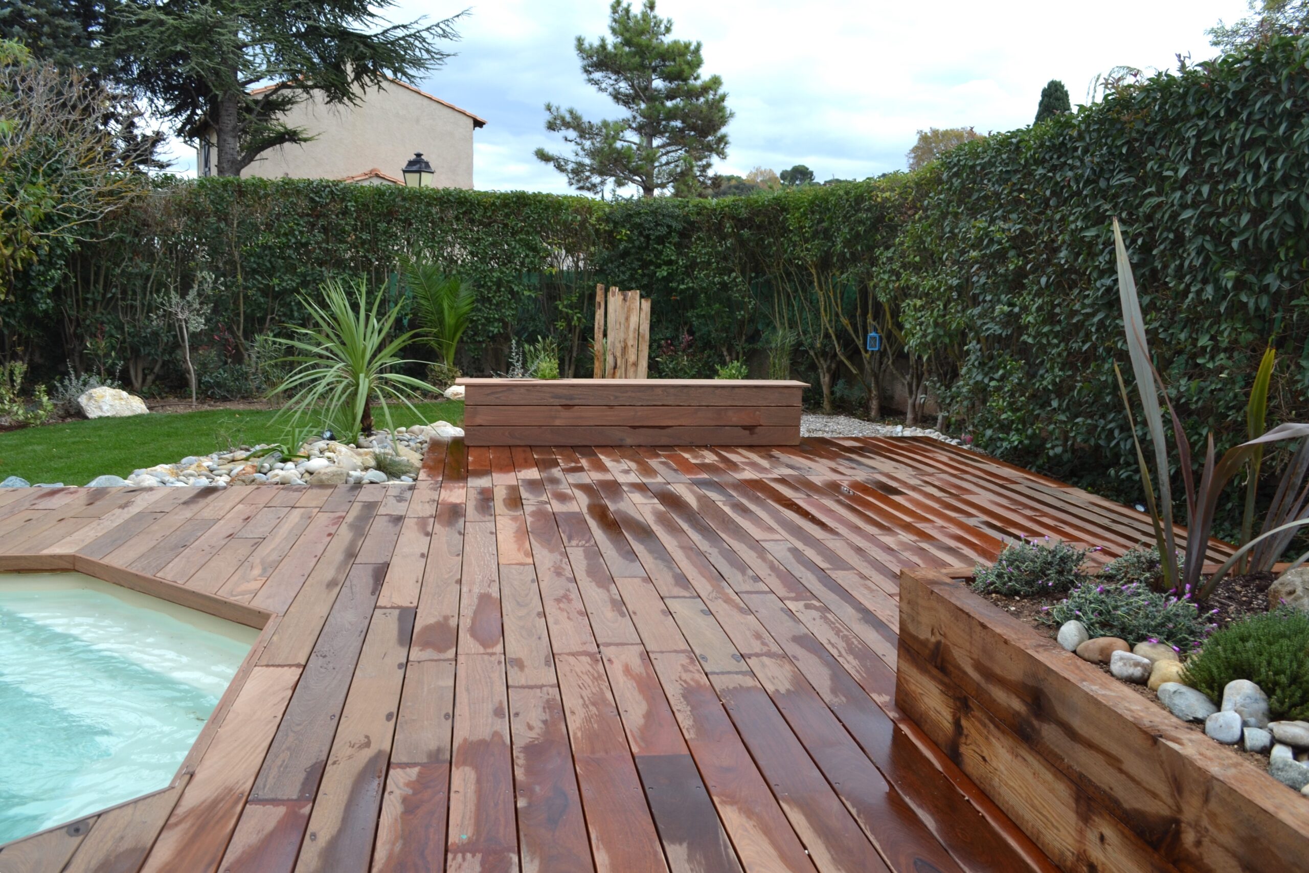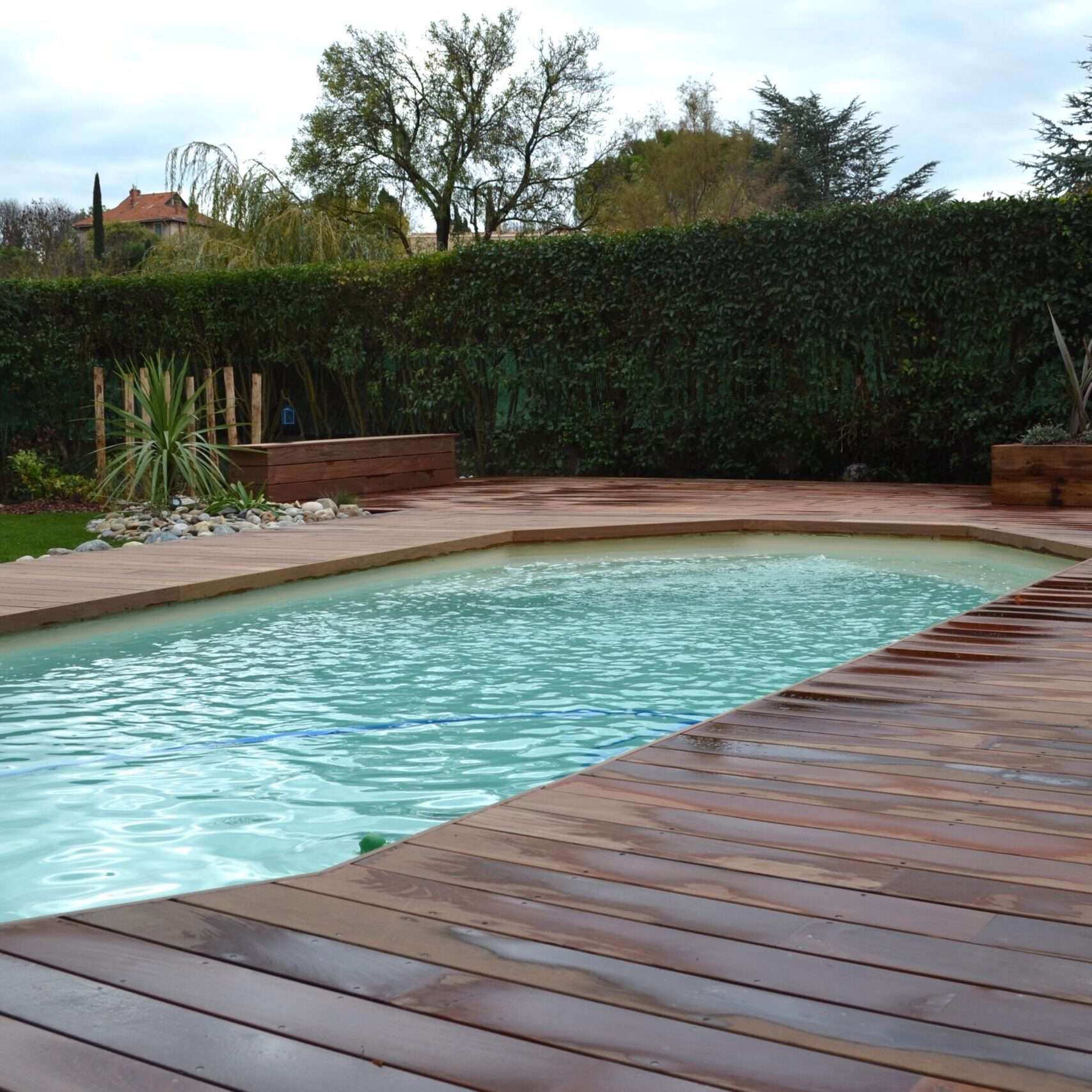 La terrasse en bois exotique de la piscine épousant les formes de la piscine, un espace salon, le solarium, une banquette.