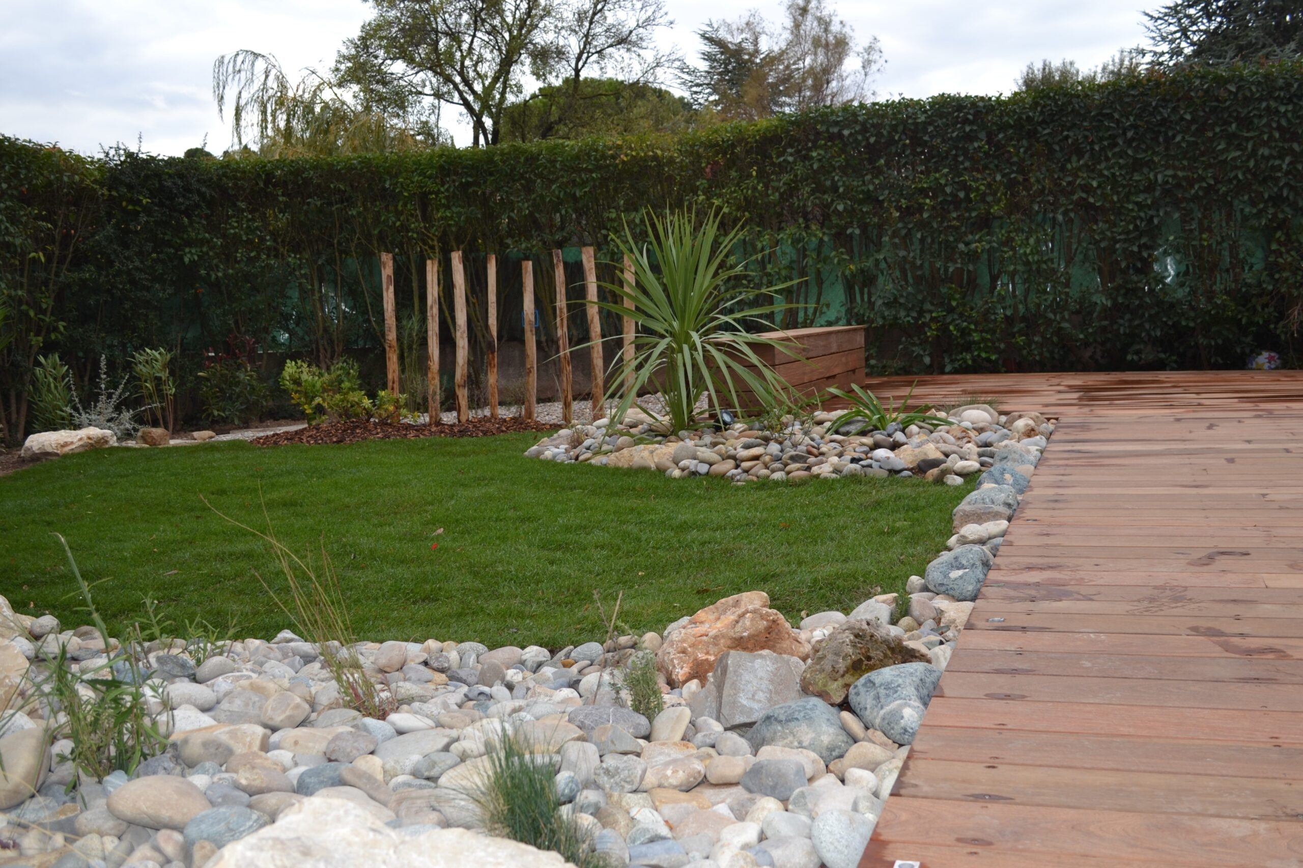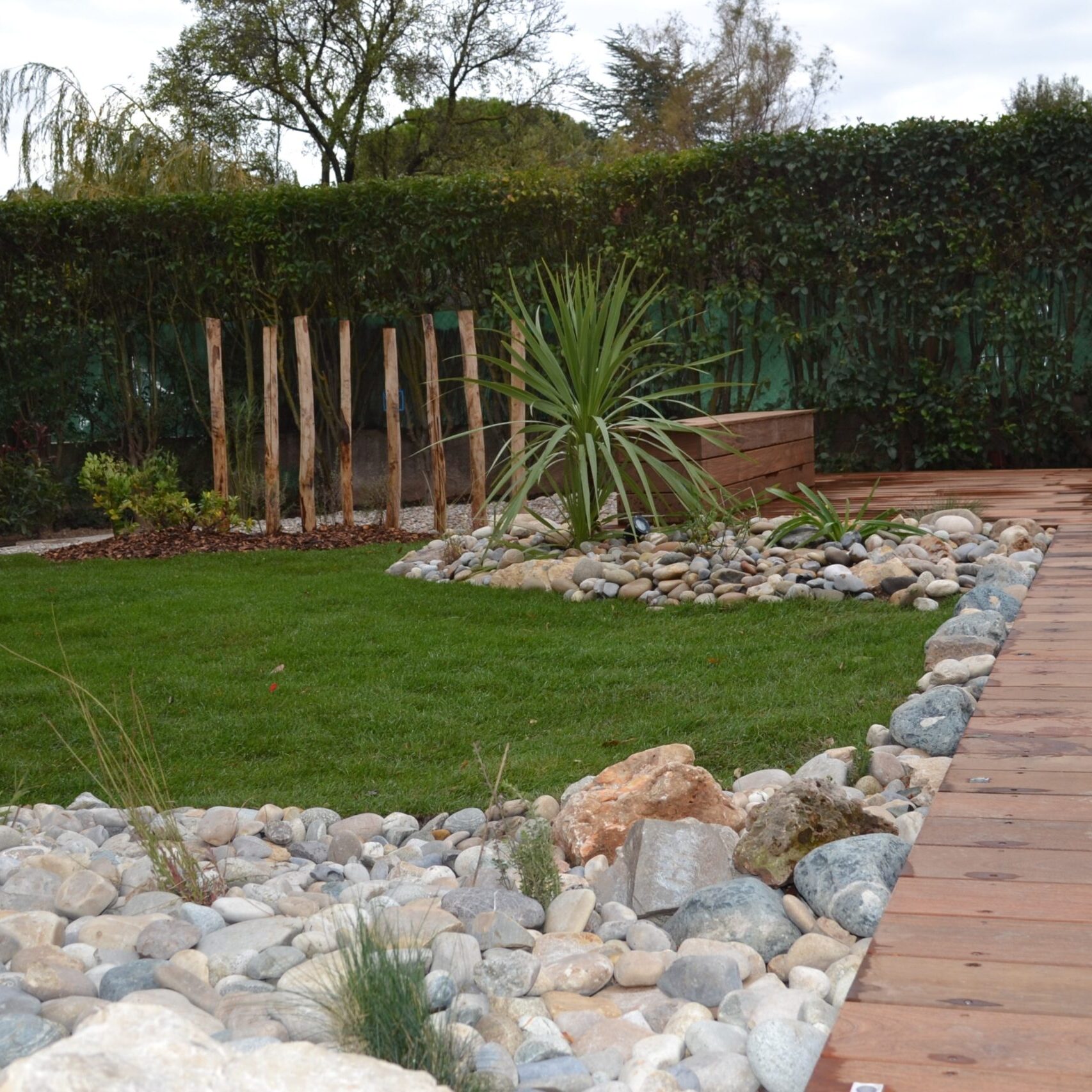 Un décor minéral avec roches et gravillons, , des piquets de châtaignier, de petits arbustes apportant une touche naturelle et harmonieuse.