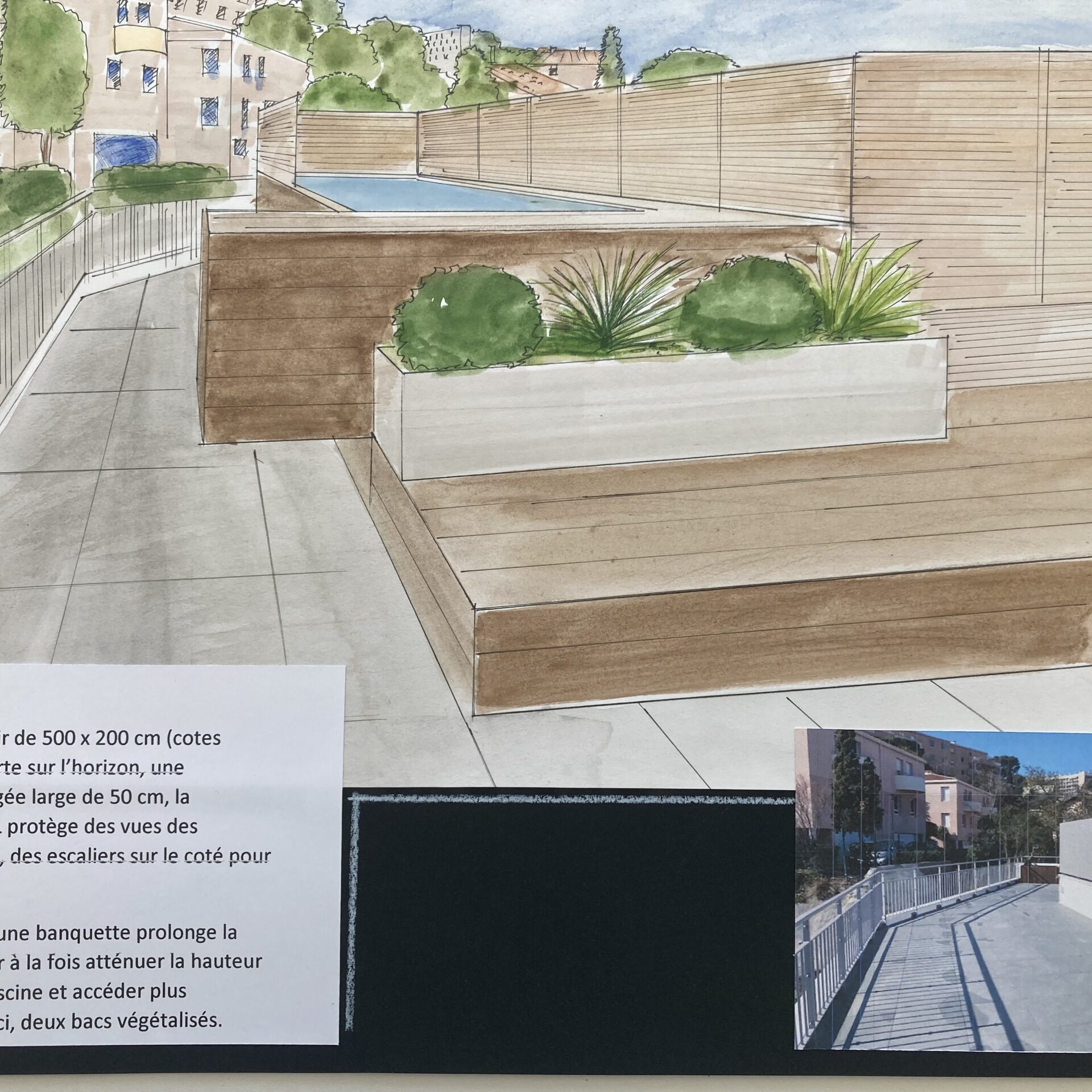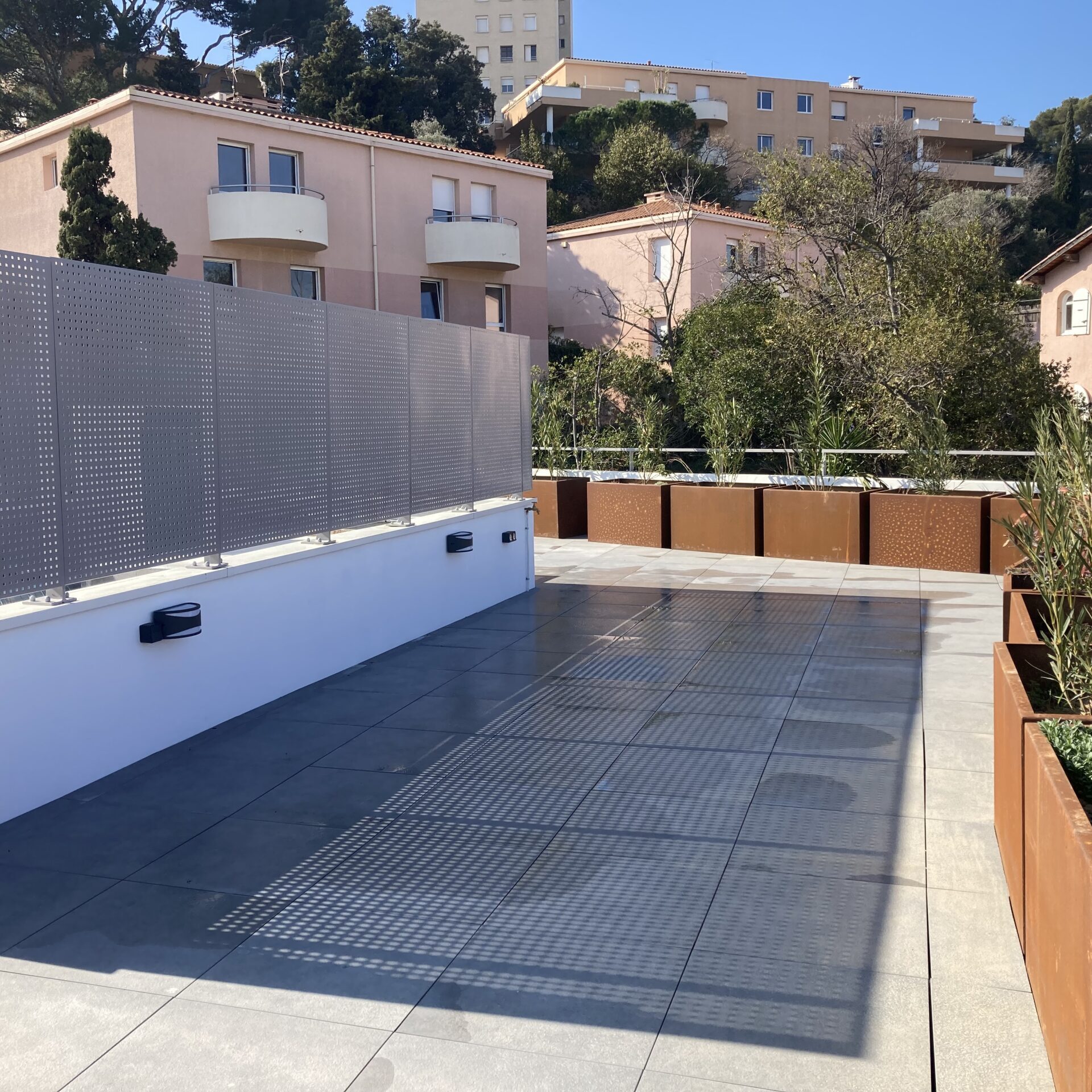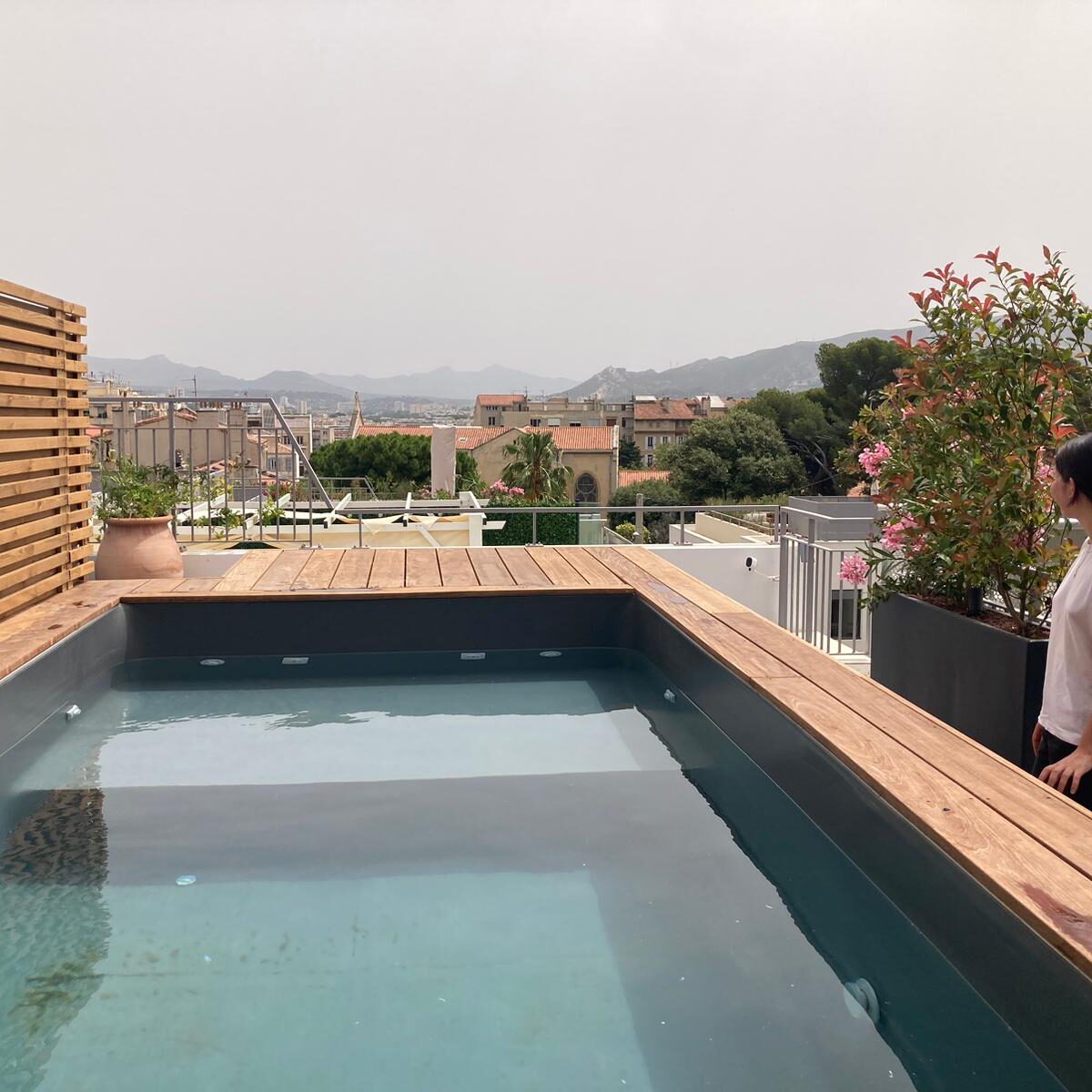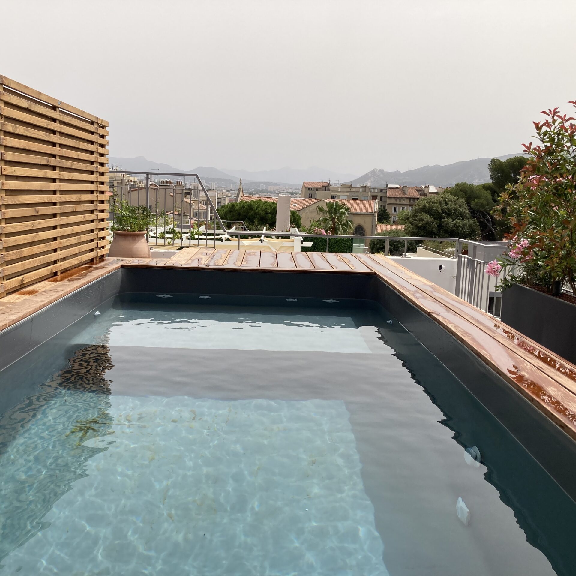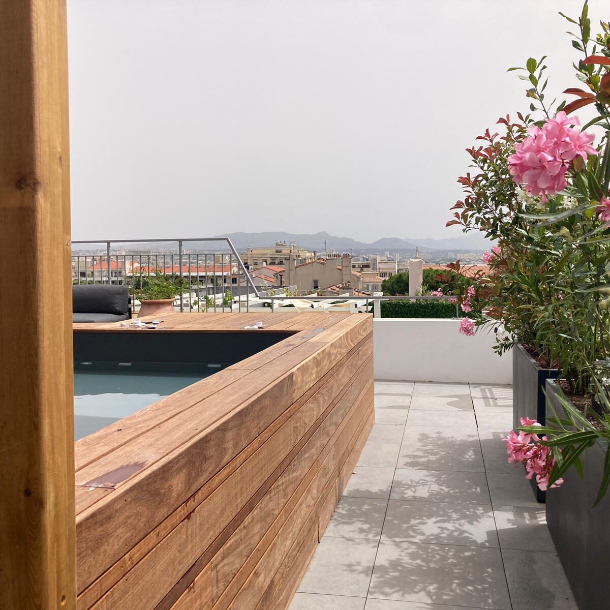 La terrasse panoramique d’une résidence récente dans le 8EME arrondissement de Marseille, accessible de l’appartement du dessous, les clients souhaitaient aménager cet espace avec une cuisine d’été, un espace repas protégé du soleil, un spa de nage, qui a nécessité lors de la construction, le renforcement de la dalle béton par le promoteur.
