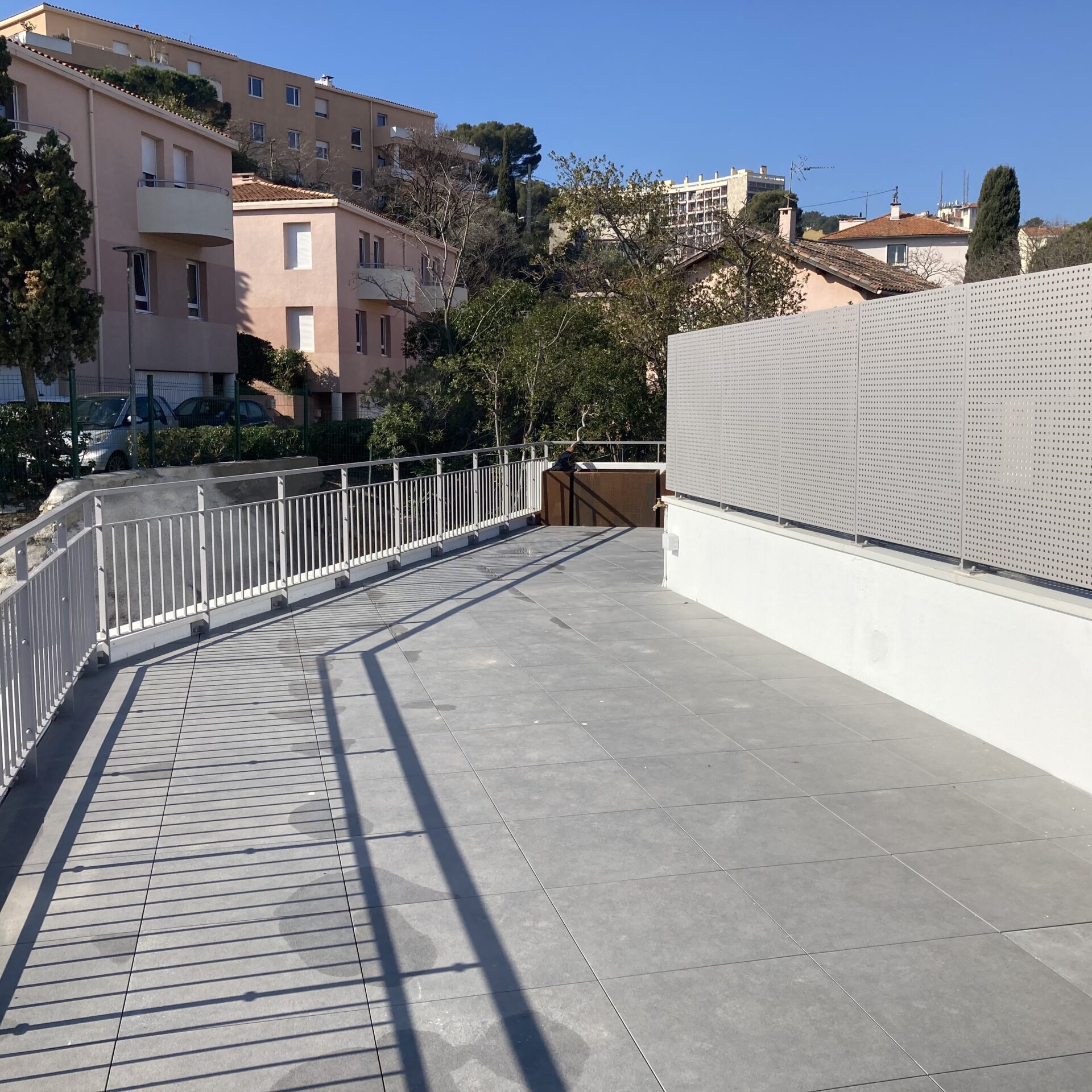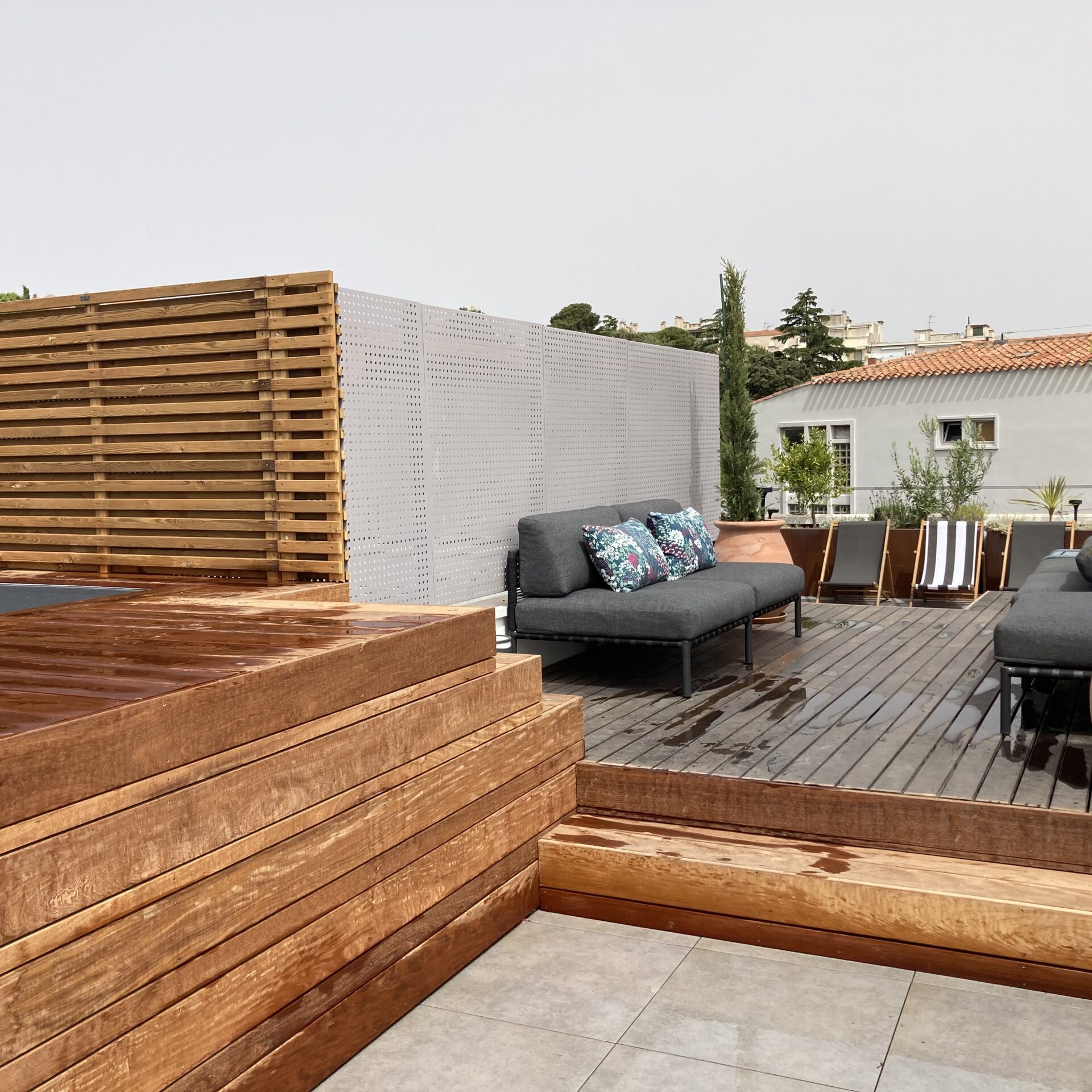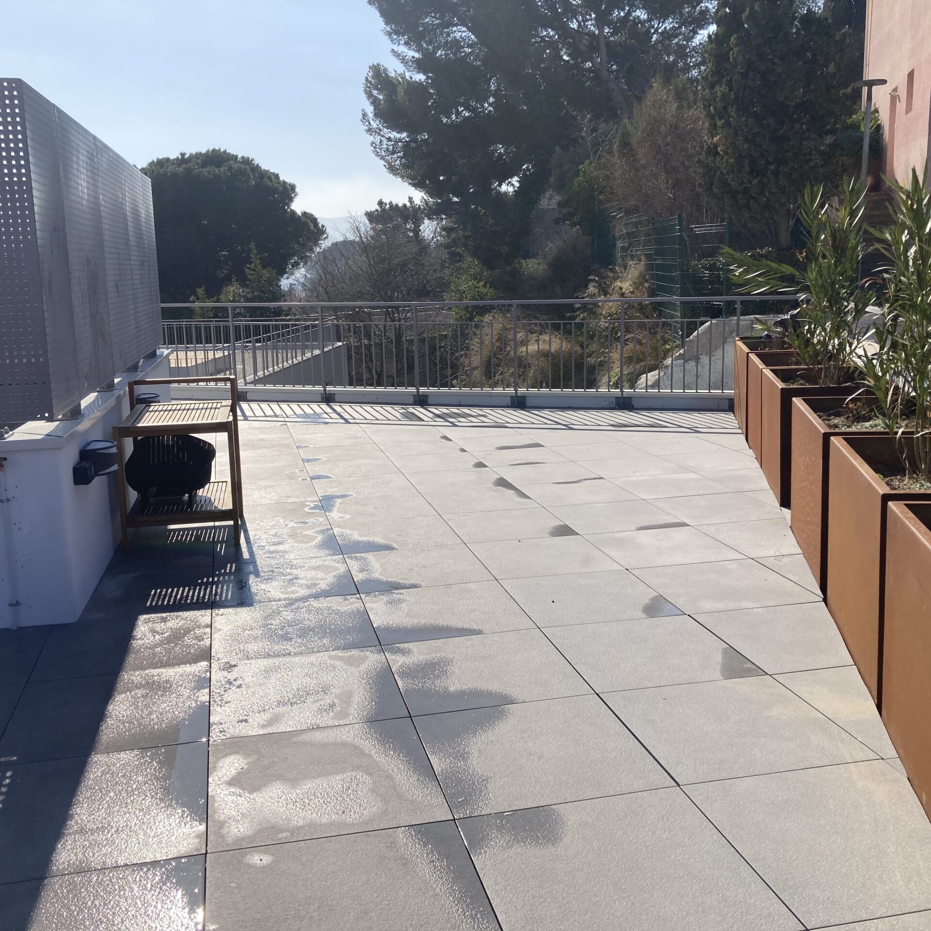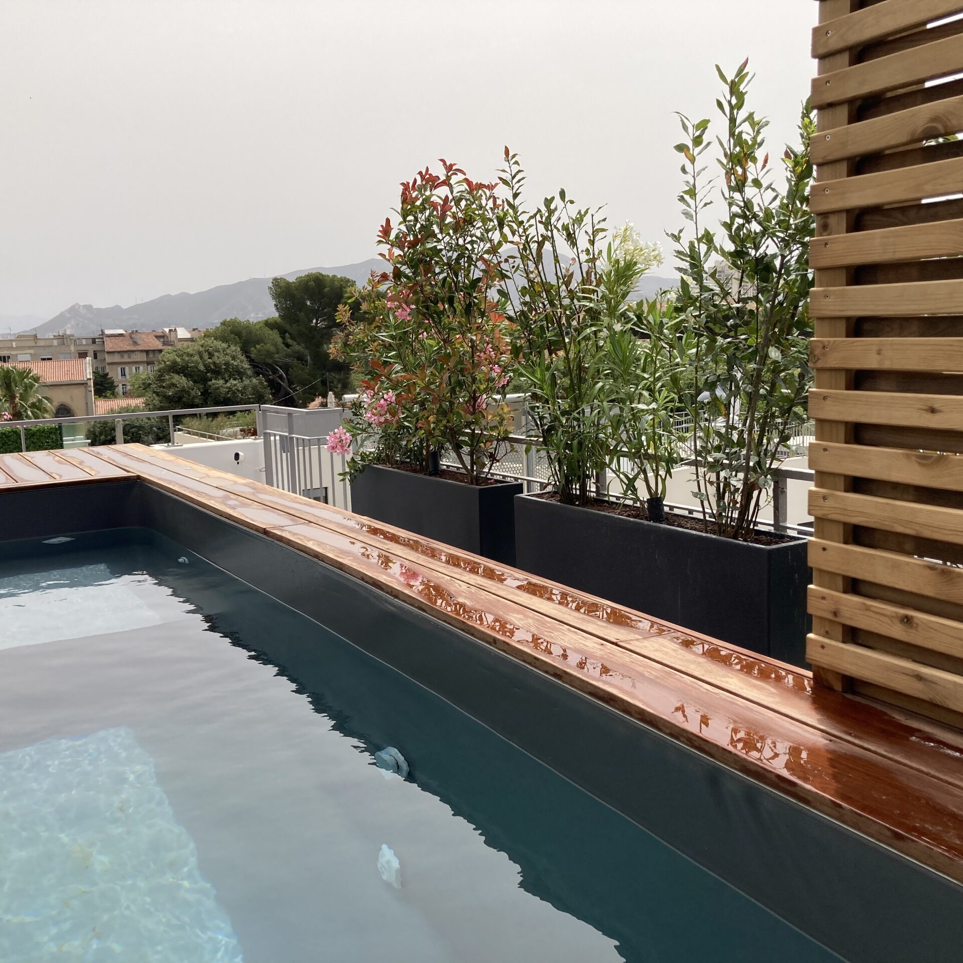 La terrasse panoramique d’une résidence récente dans le 8EME arrondissement de Marseille, accessible de l’appartement du dessous, les clients souhaitaient aménager cet espace avec une cuisine d’été, un espace repas protégé du soleil, un spa de nage, qui a nécessité lors de la construction, le renforcement de la dalle béton par le promoteur.