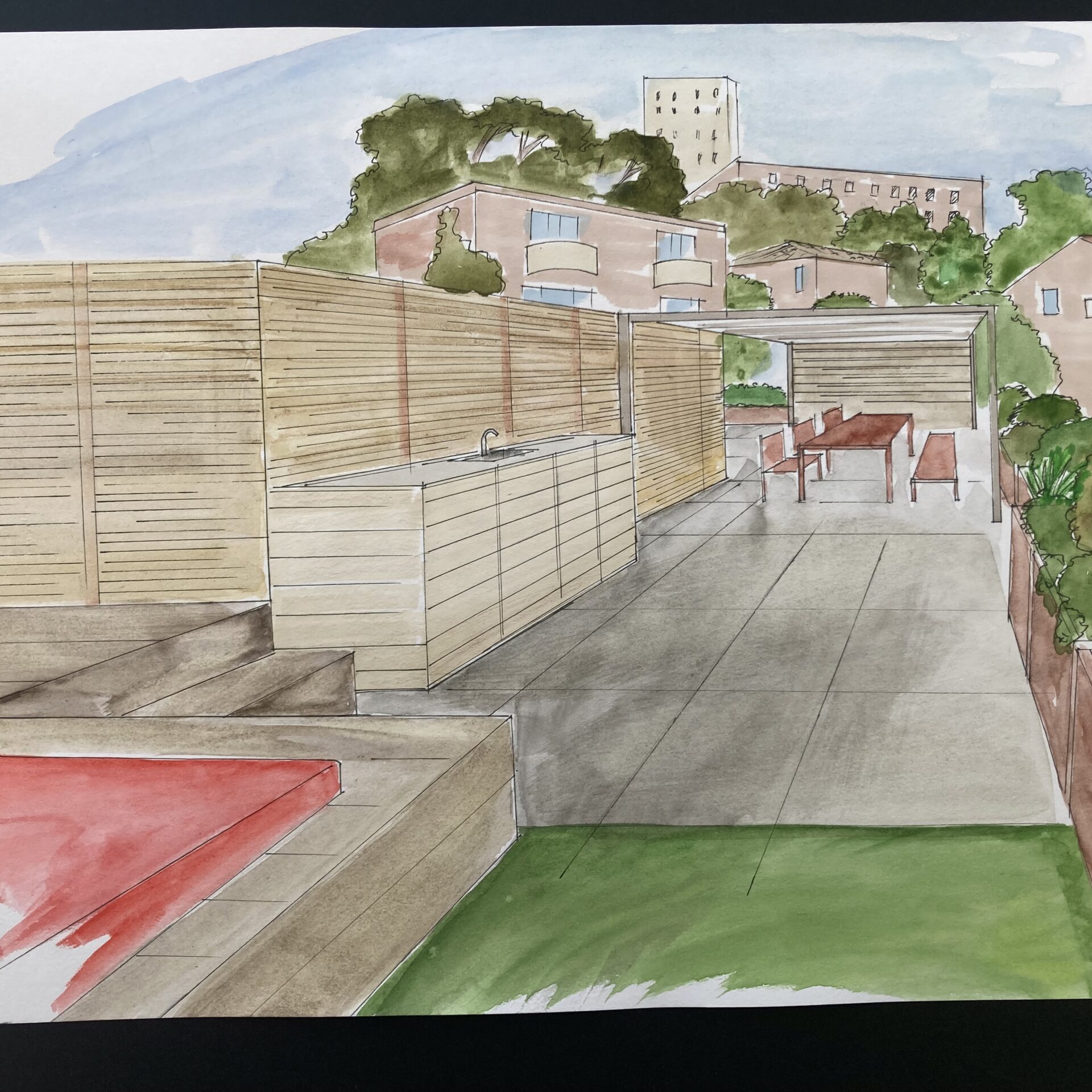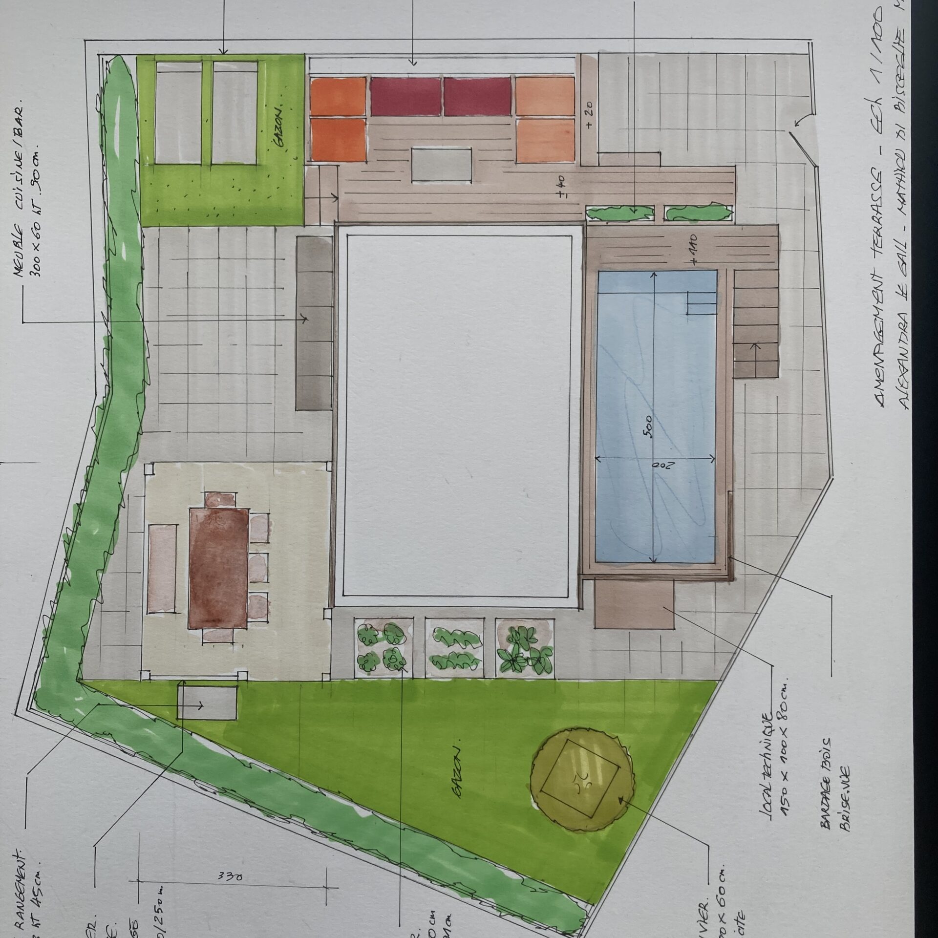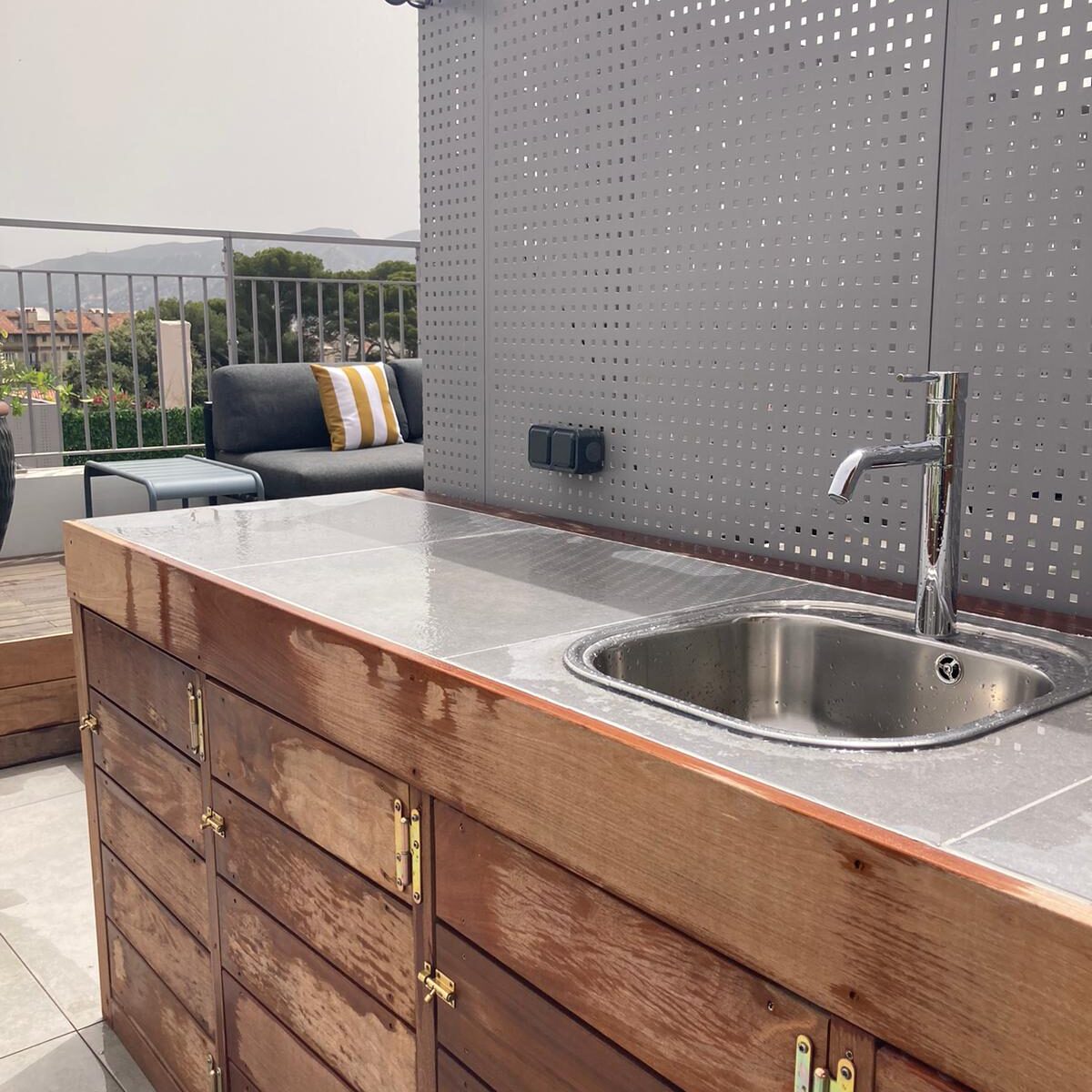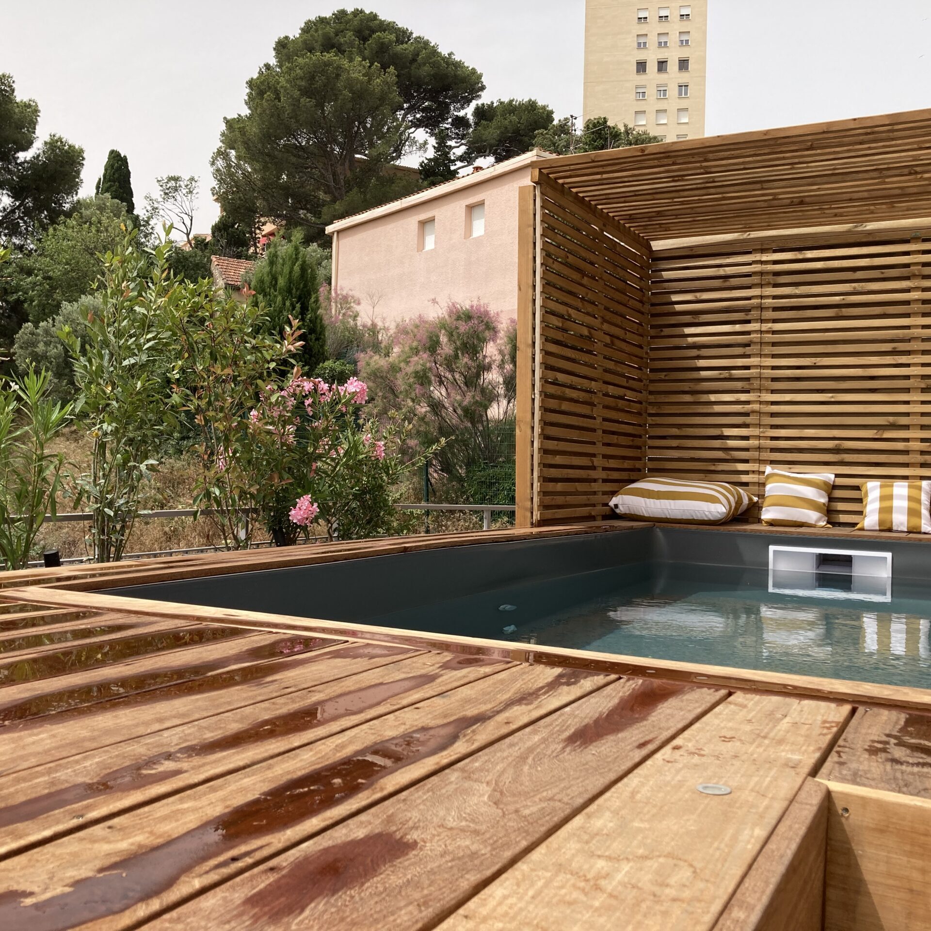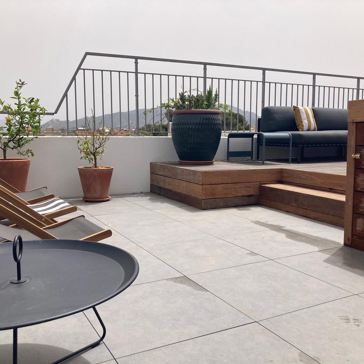 La terrasse panoramique d’une résidence récente dans le 8EME arrondissement de Marseille, accessible de l’appartement du dessous, les clients souhaitaient aménager cet espace avec une cuisine d’été, un espace repas protégé du soleil, un spa de nage, qui a nécessité lors de la construction, le renforcement de la dalle béton par le promoteur.