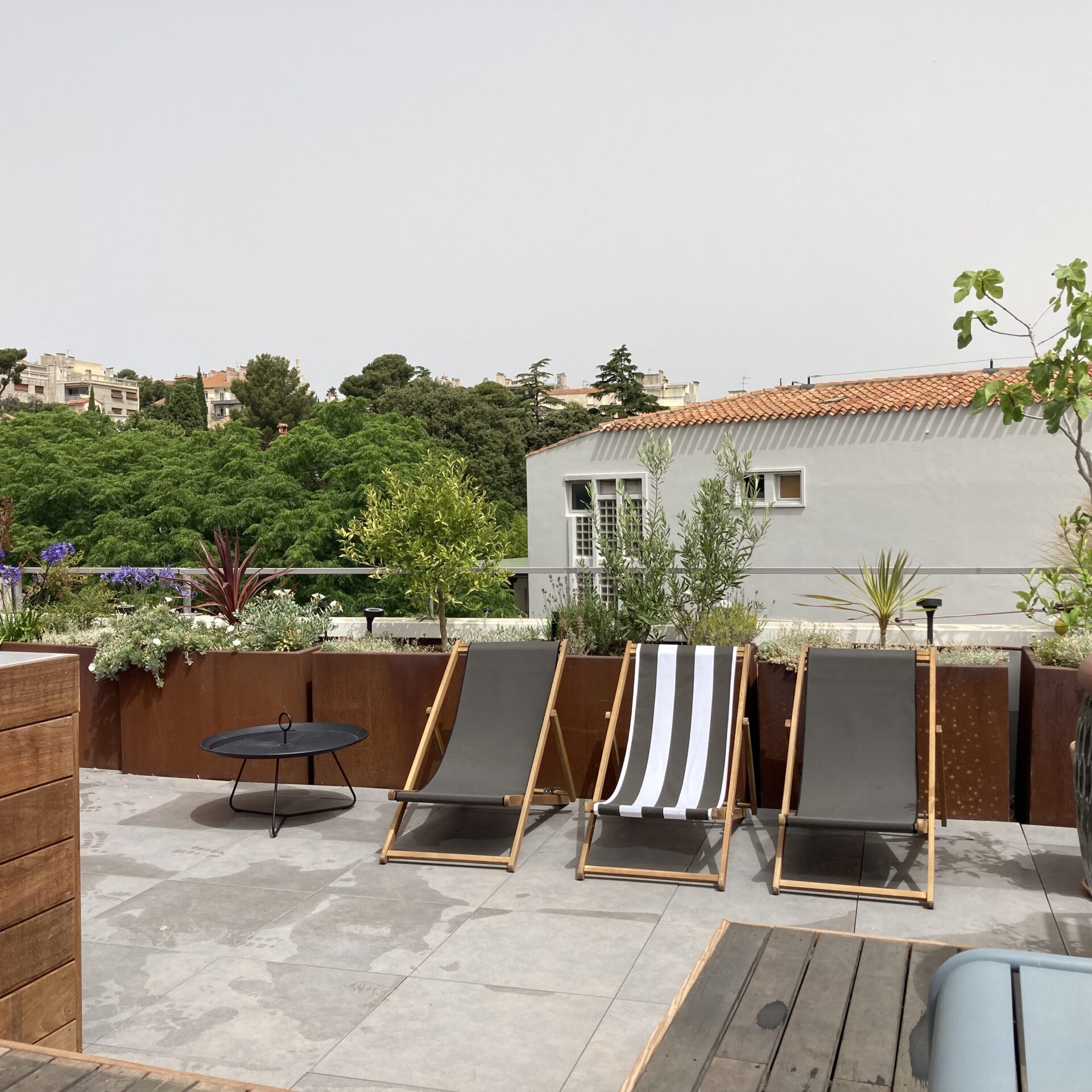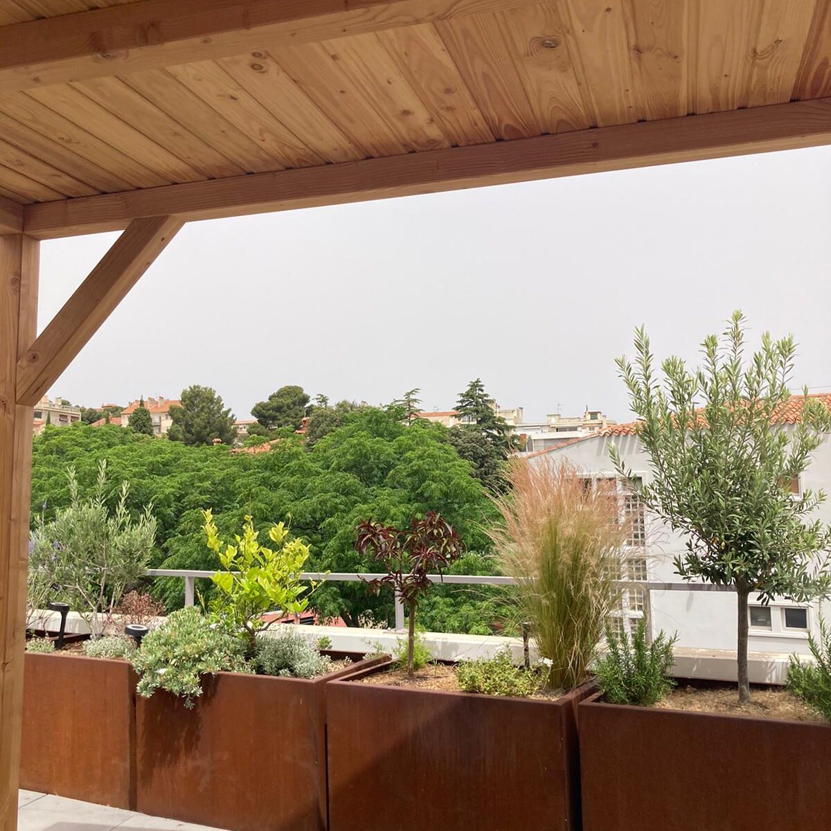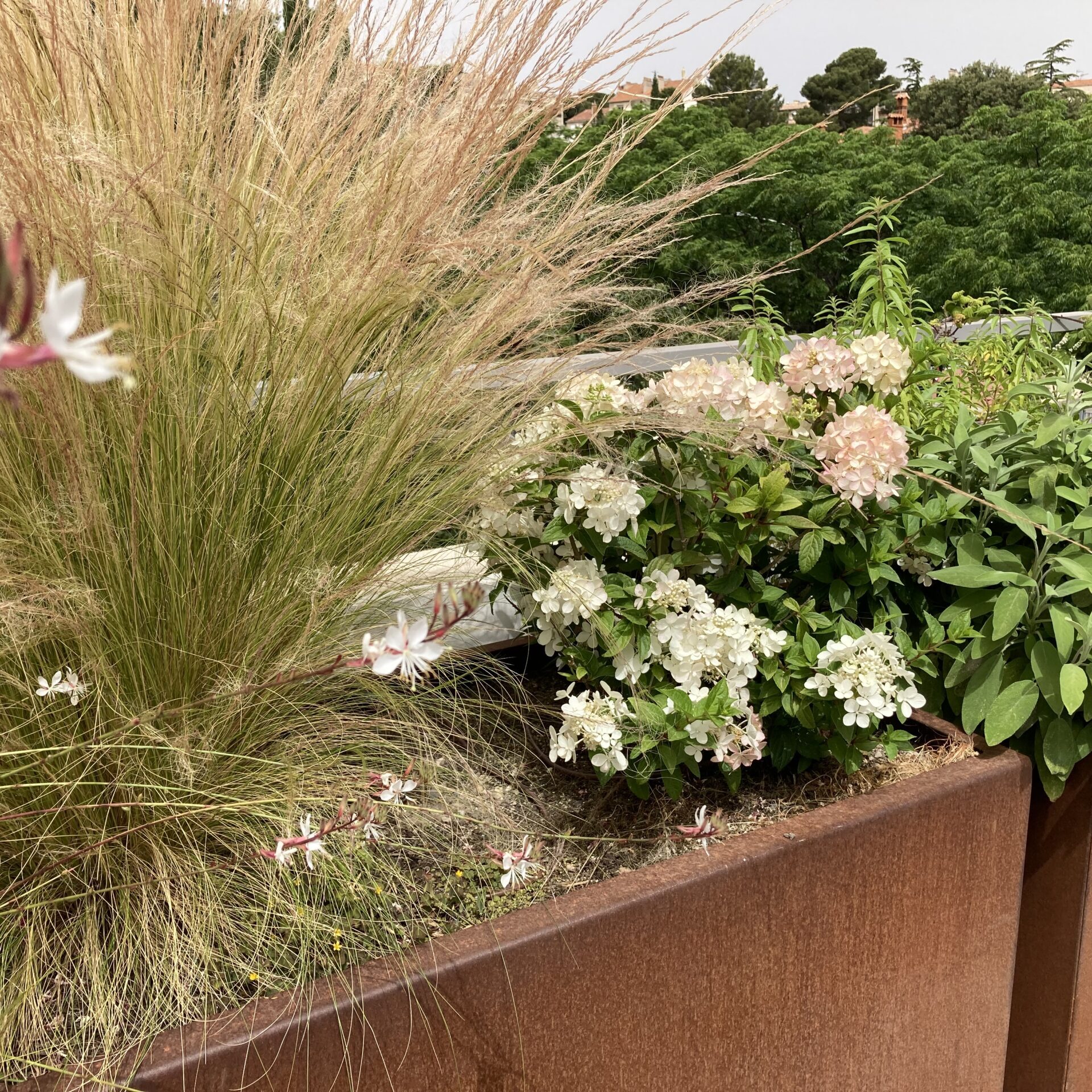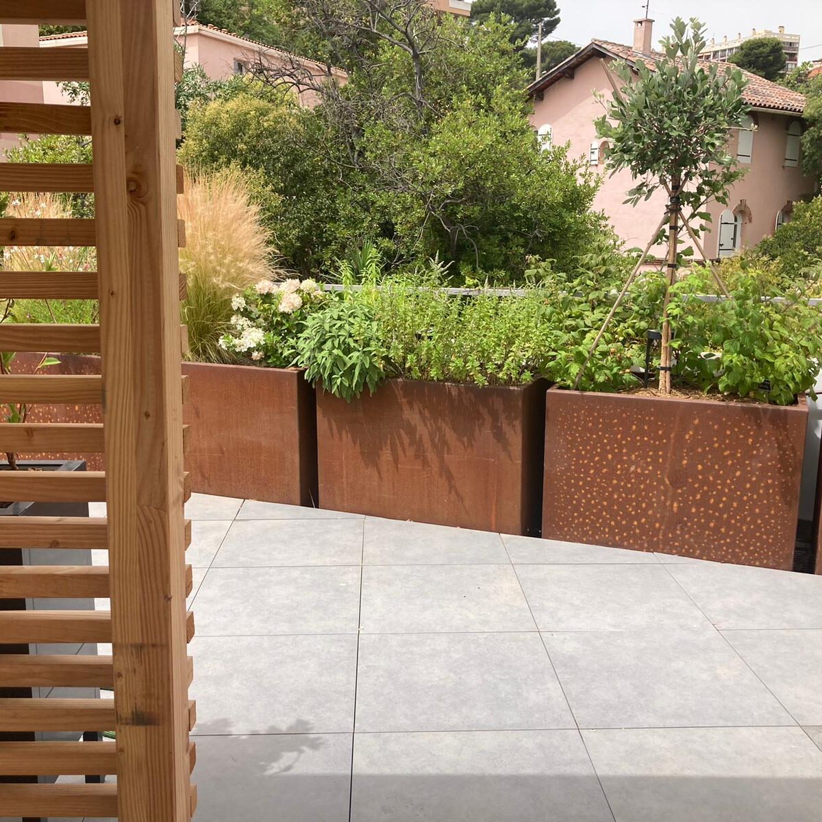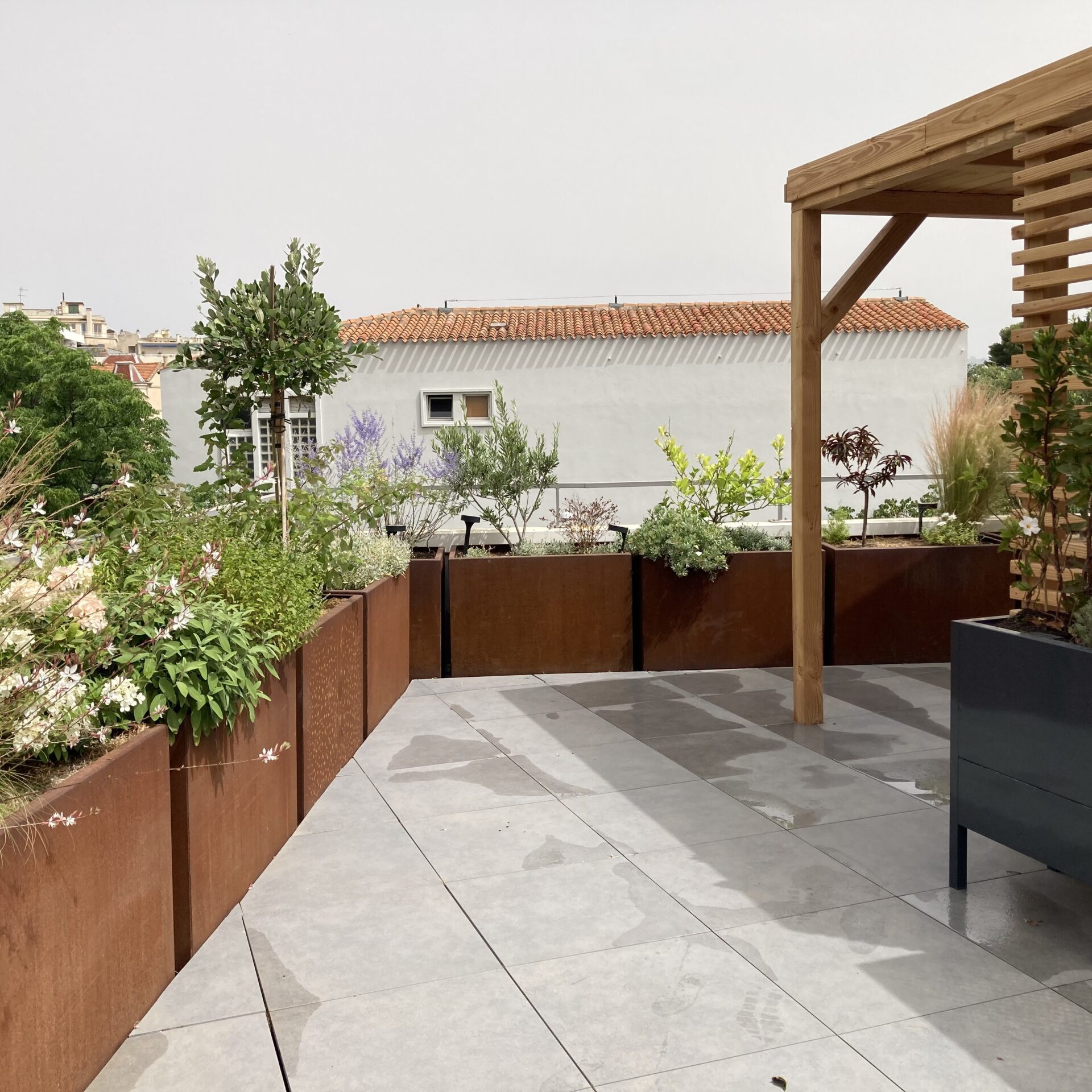 Des bacs en acier Corten sur tout le pourtour de terrasse, une végétation méditerranéenne qui a fait l’objet d’une attention particulière pour offrir un étagement des floraisons, des hauteurs différences, des plantes adaptées au vent et au soleil estival.