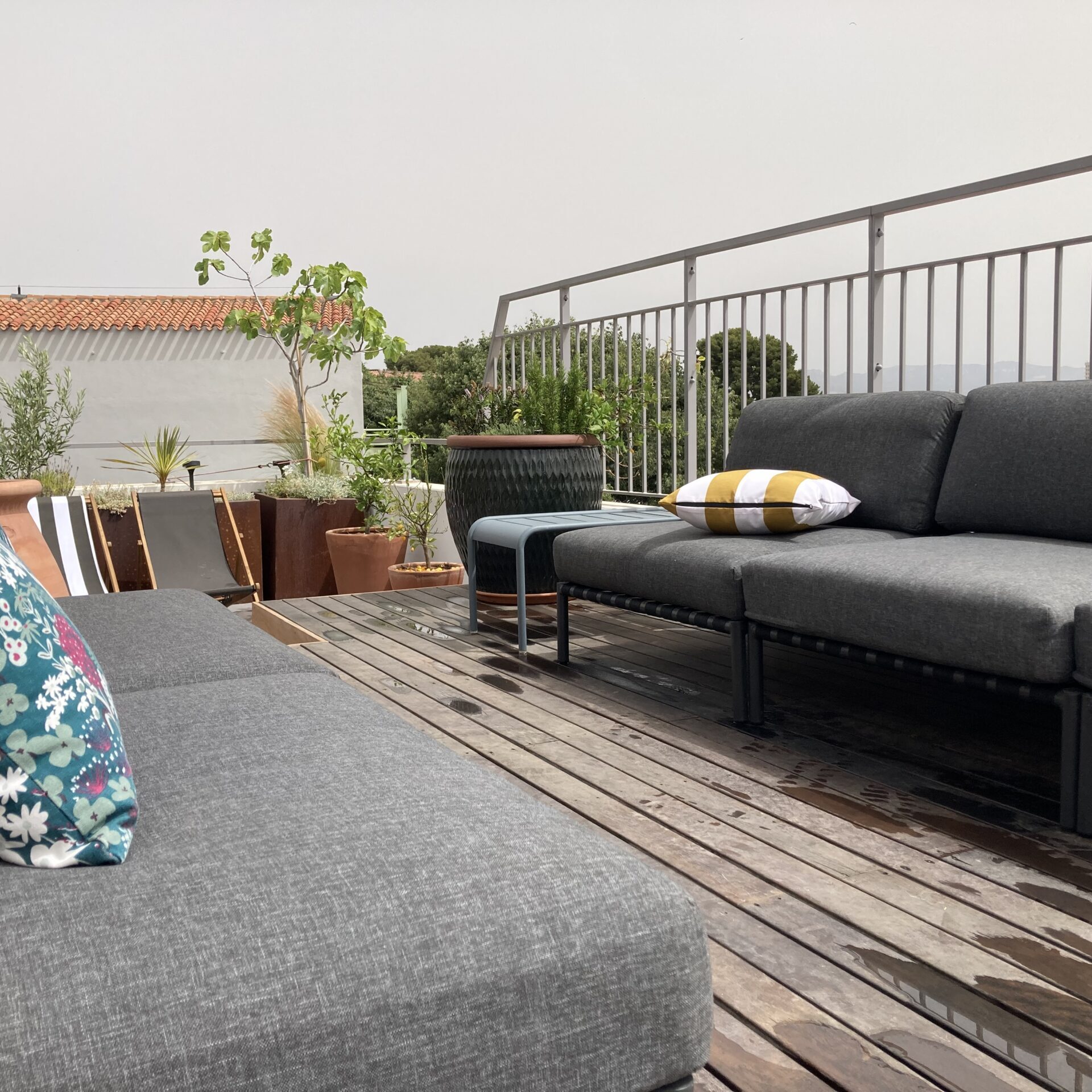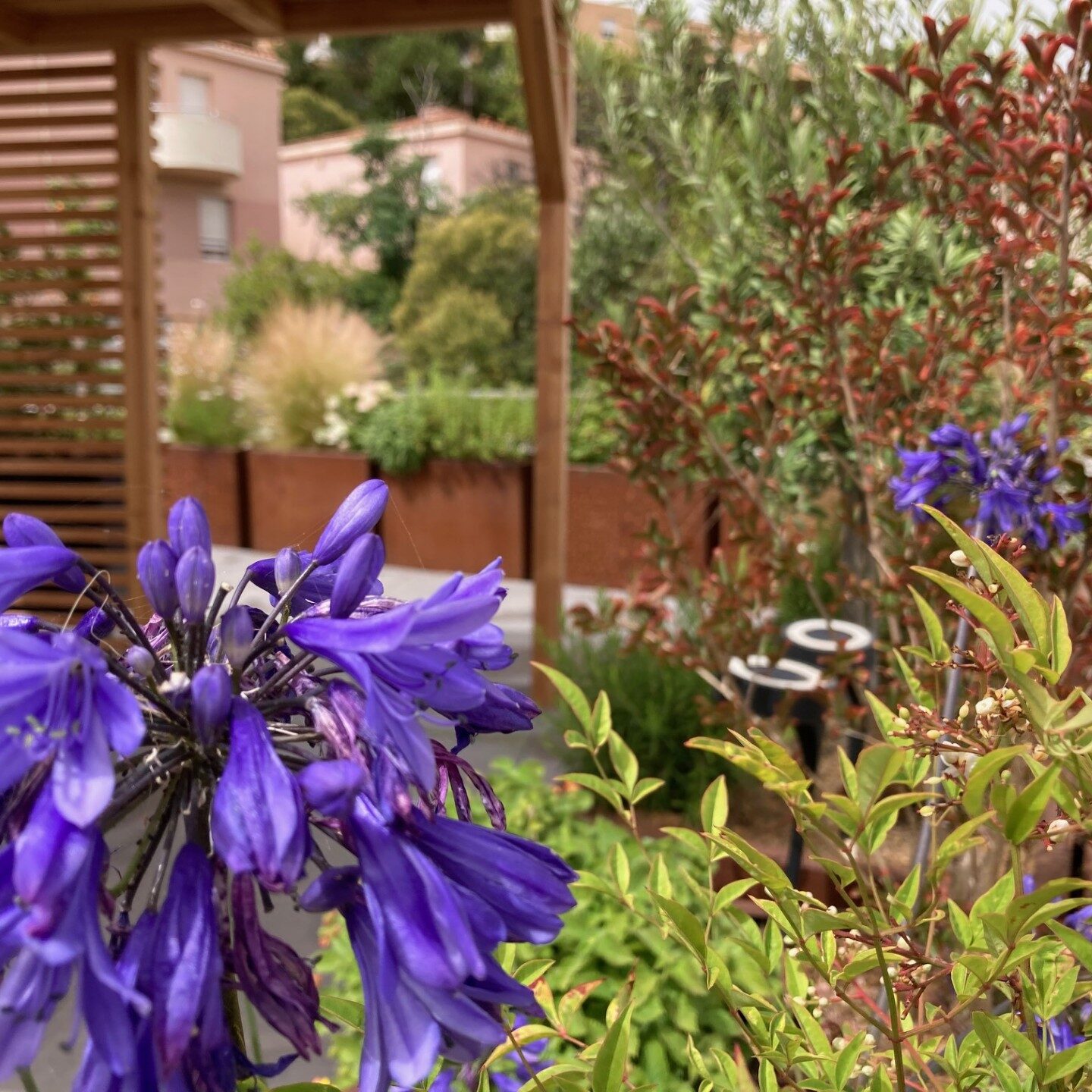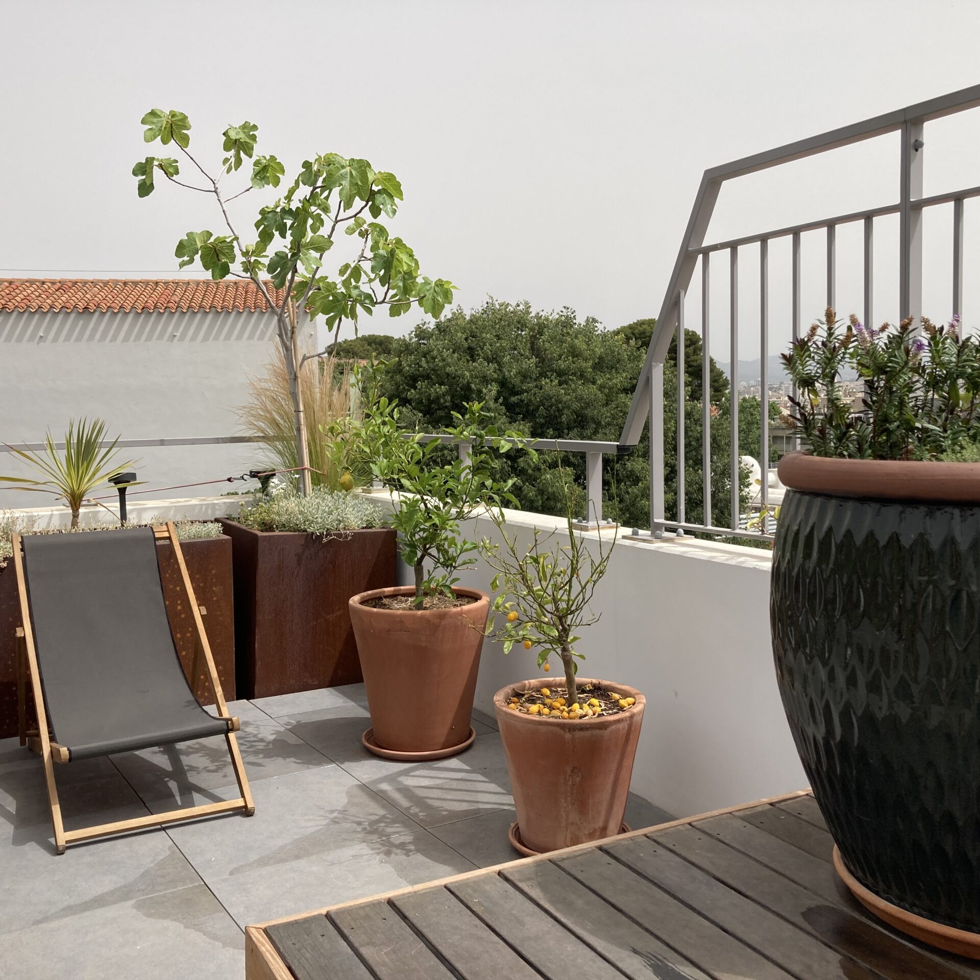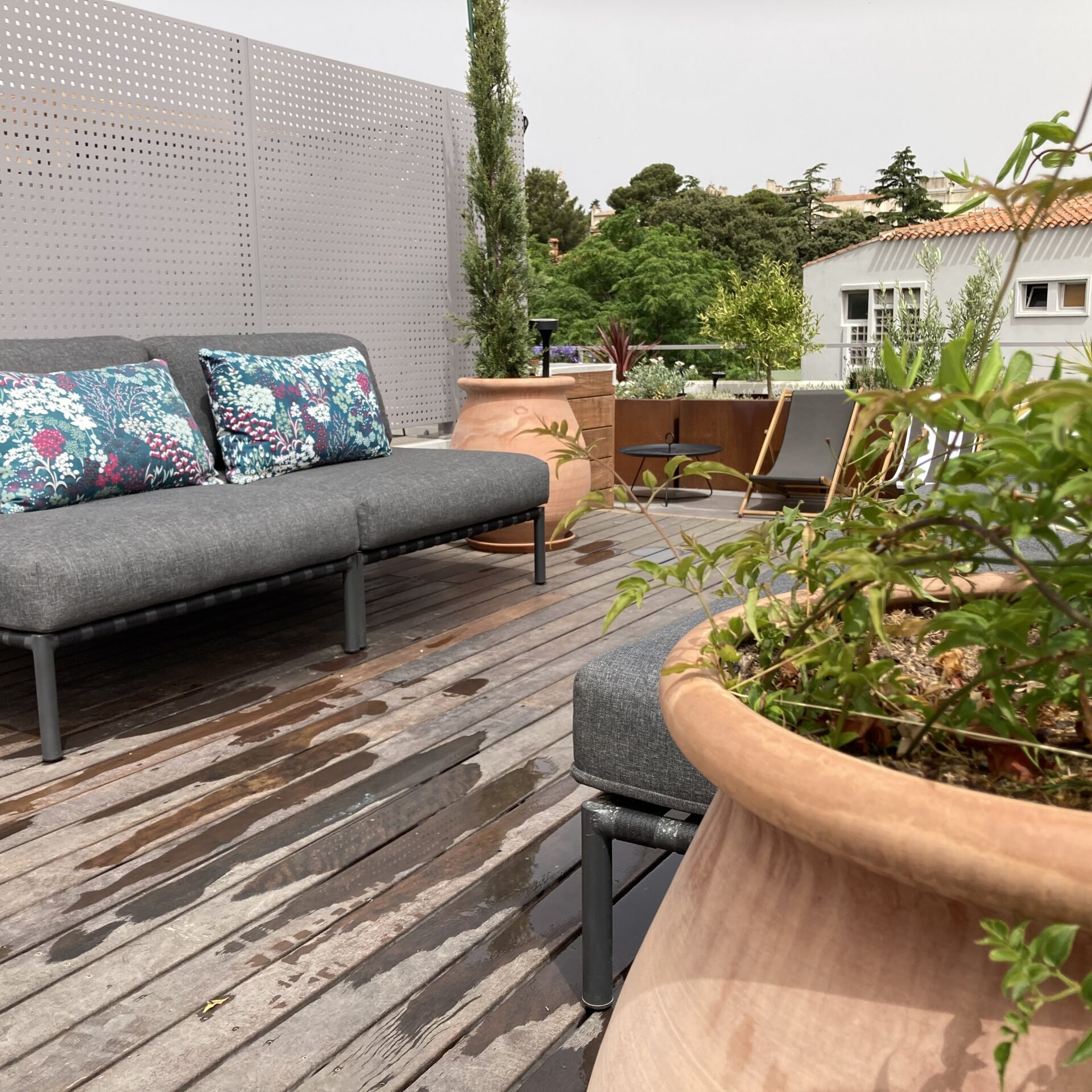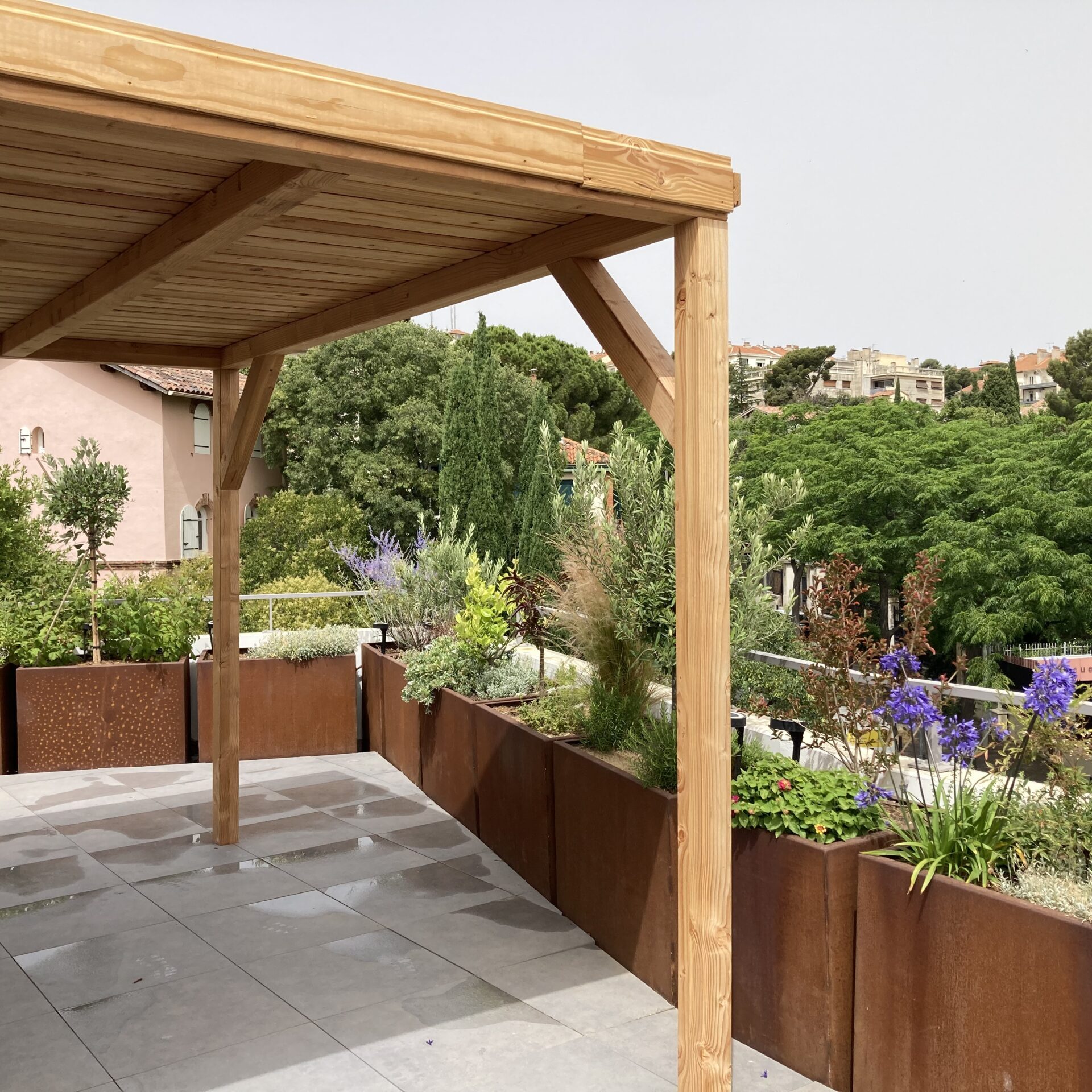 Des bacs en acier Corten sur tout le pourtour de terrasse, une végétation méditerranéenne qui a fait l’objet d’une attention particulière pour offrir un étagement des floraisons, des hauteurs différences, des plantes adaptées au vent et au soleil estival.