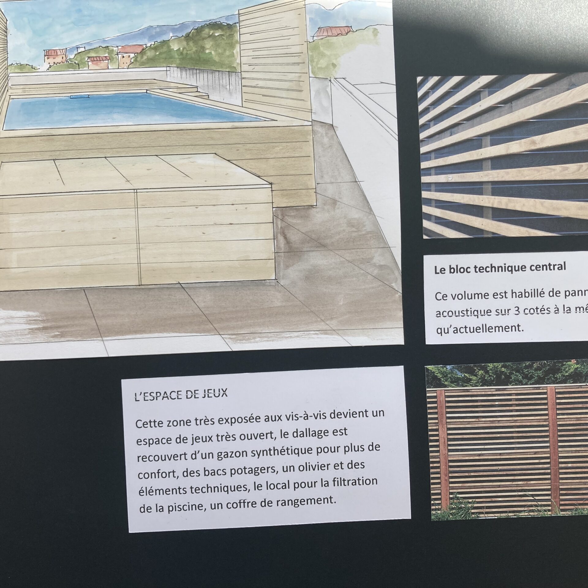 Le module technique, une armoire de rangement, le barbecue prennent place derrière la spa de nage, une zone très exposé aux vis-à-vis.