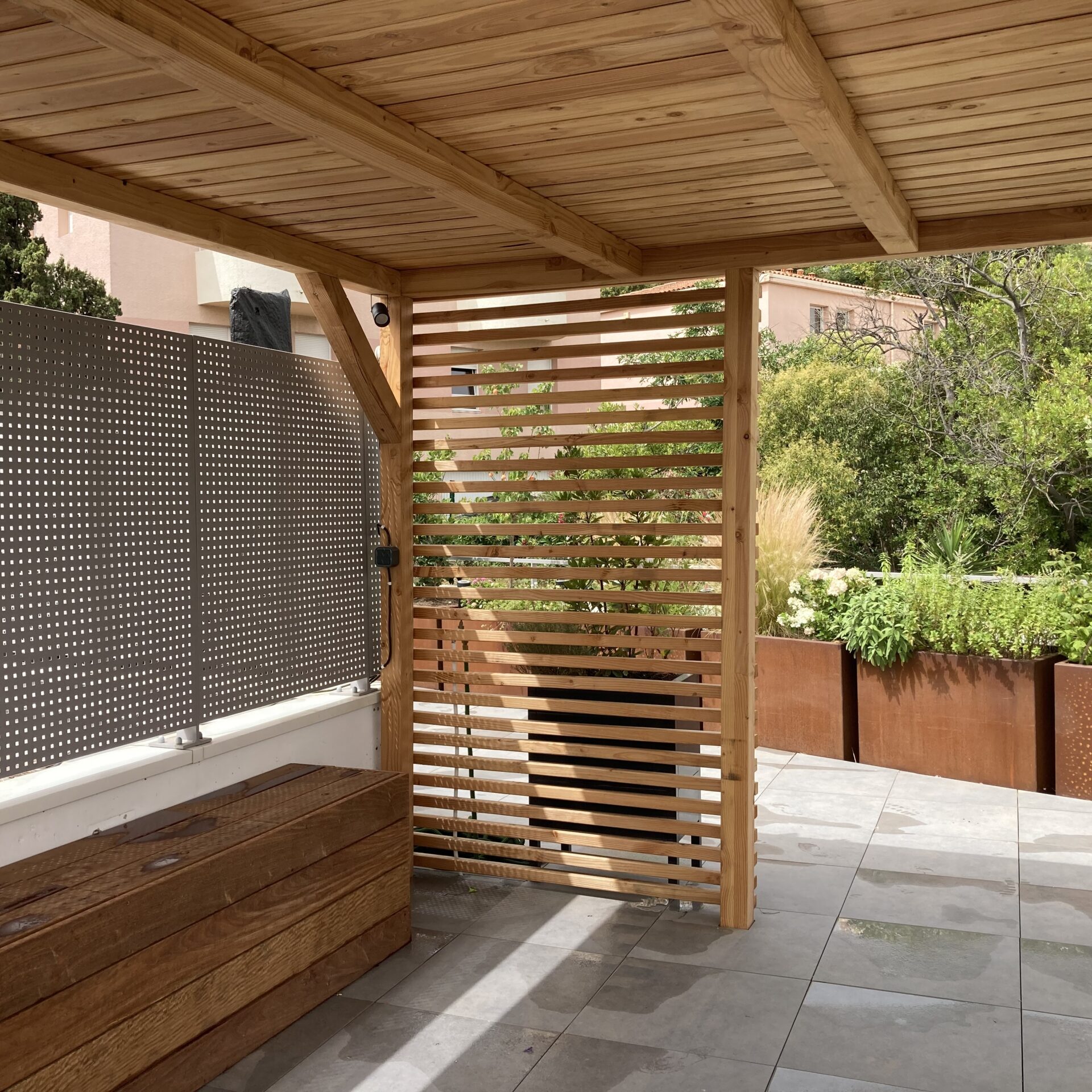 La pergola autoporteuse en bois de l’espace repas étanche protégée des vis-à-vis de l’immeuble voisin par un bardage bois sur un coté et ouverte sur la ville.