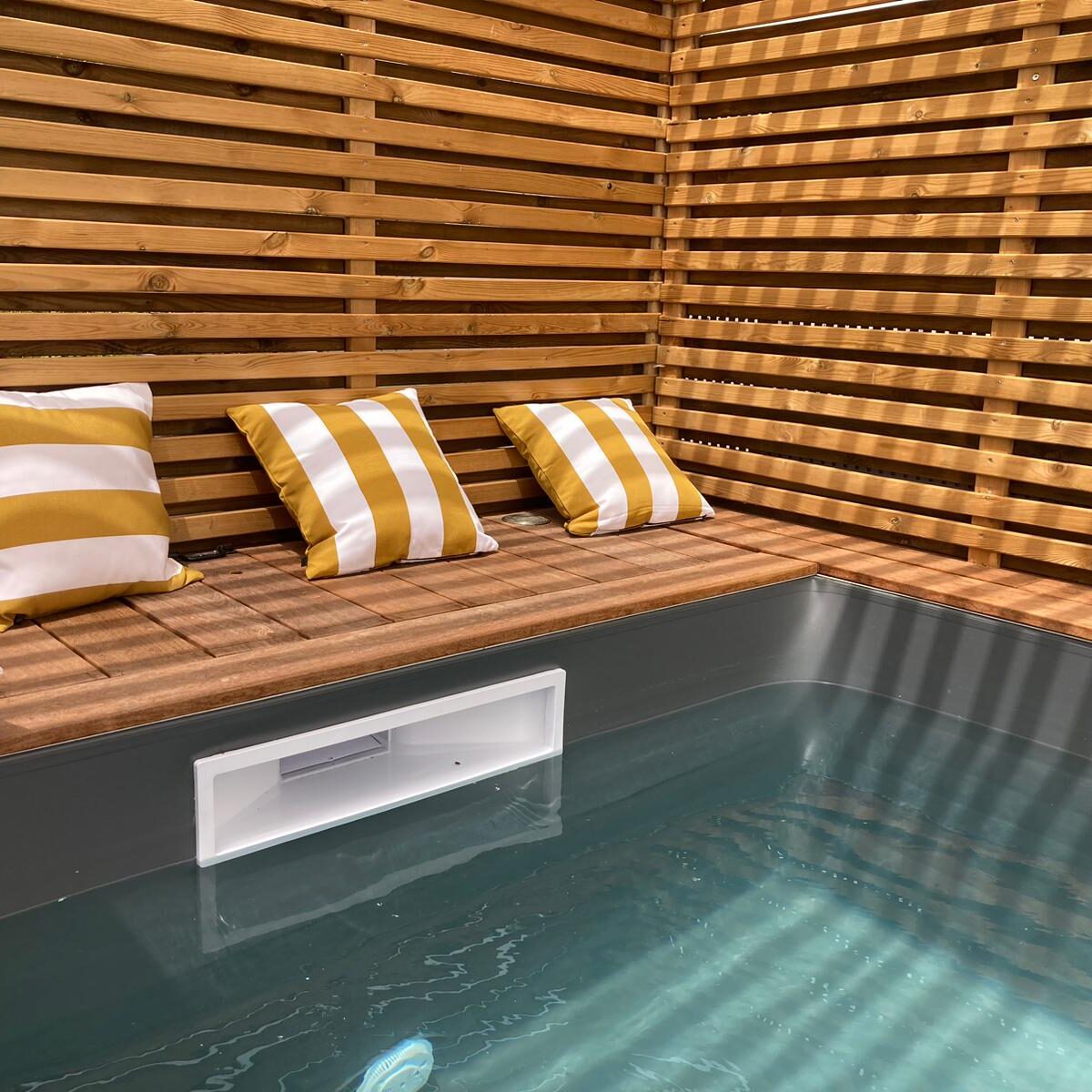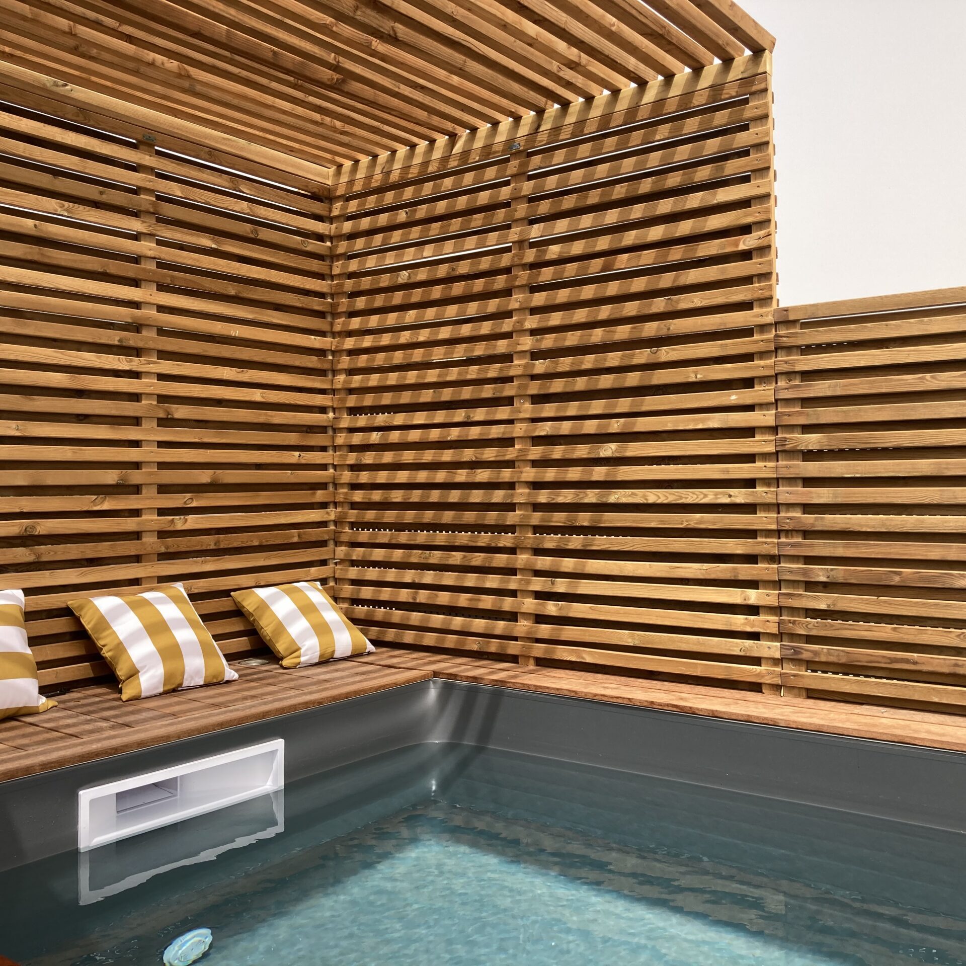 Le spa de nage de 5 x 2 mètres avec sa banquette immergée, une petite plage en bout, un espace intime protégé des regards par une pergola en tasseaux de bois ouverte sur l’horizon, l’accès par des escaliers se fait par la terrasse salon.