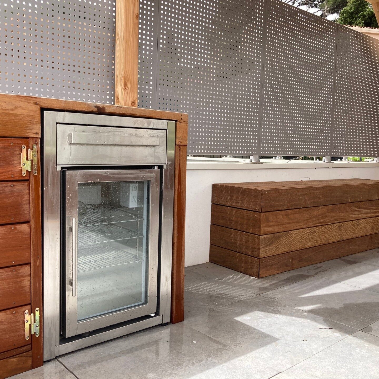 La cuisine d’extérieur, un long module en bois exotique réalisé sur mesure comprenant un réfrigérateur, un évier, des rangements, un plan de travail.