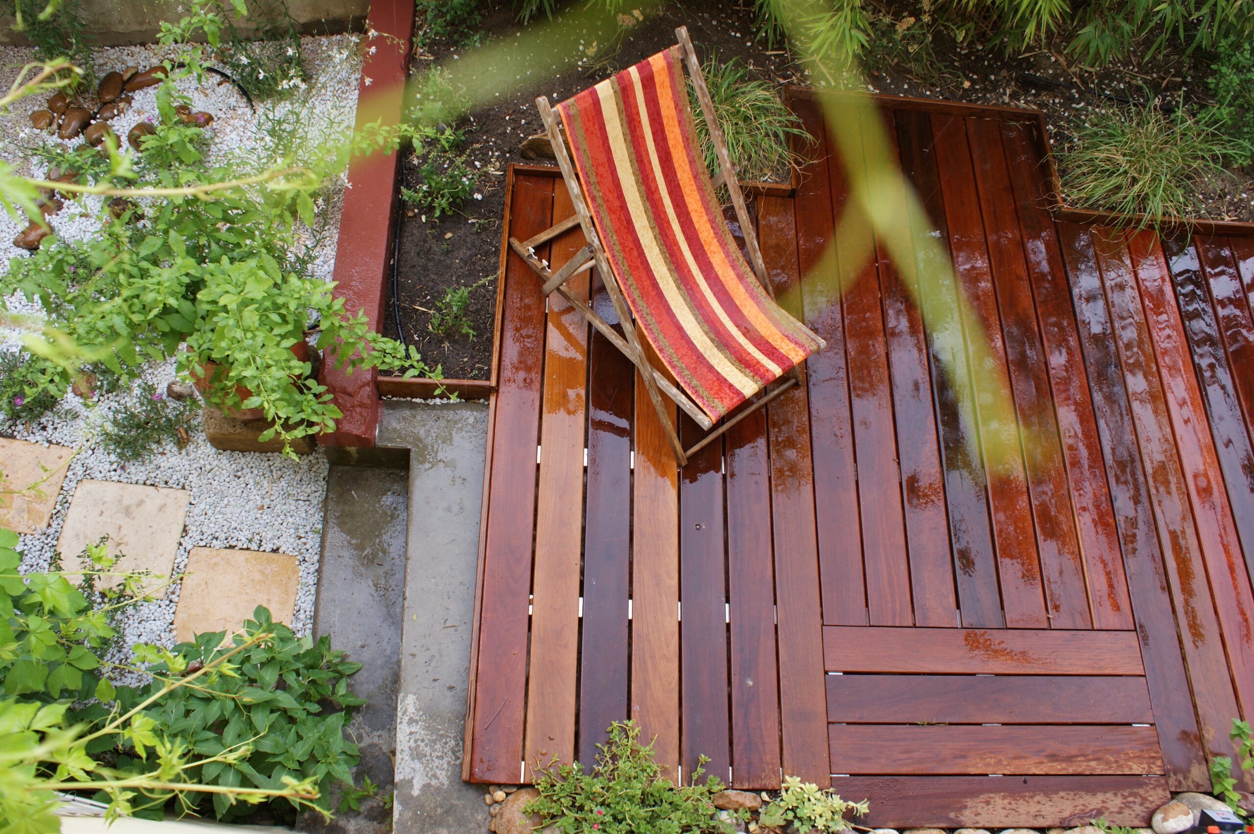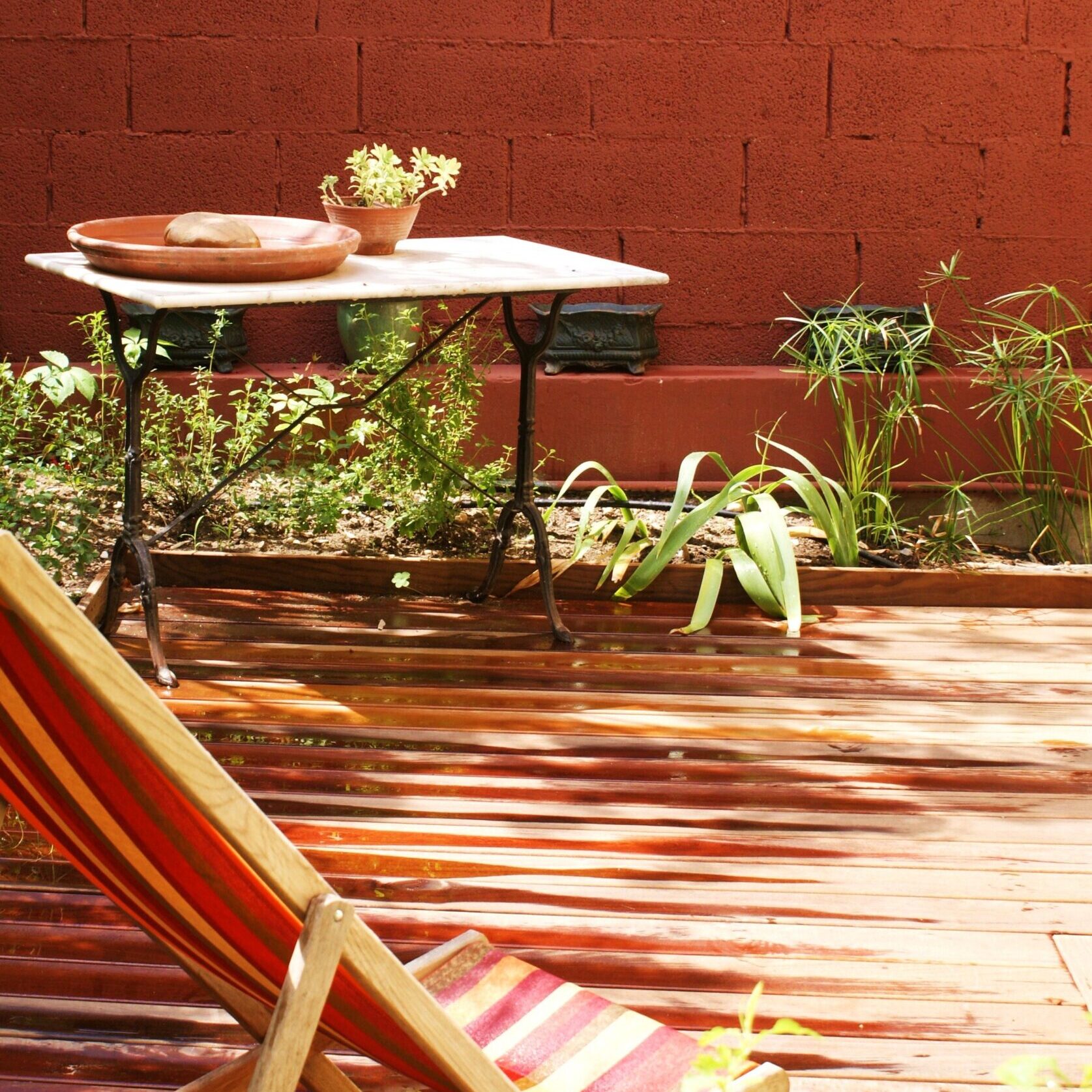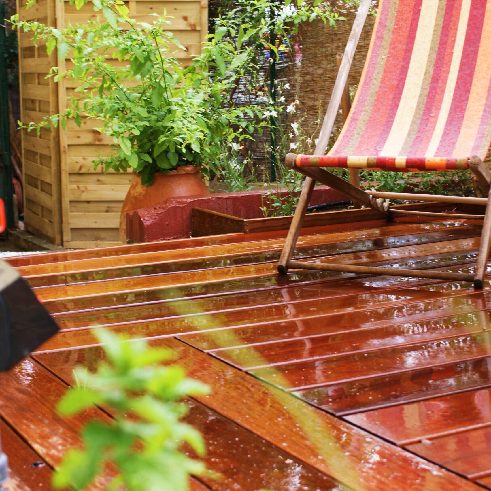 La terrasse en bois exotique, un espace de vie pour se détendre, déjeuner à 2, à 4 convives, dans un écrin de verdure aux couleurs ocre des murs.
