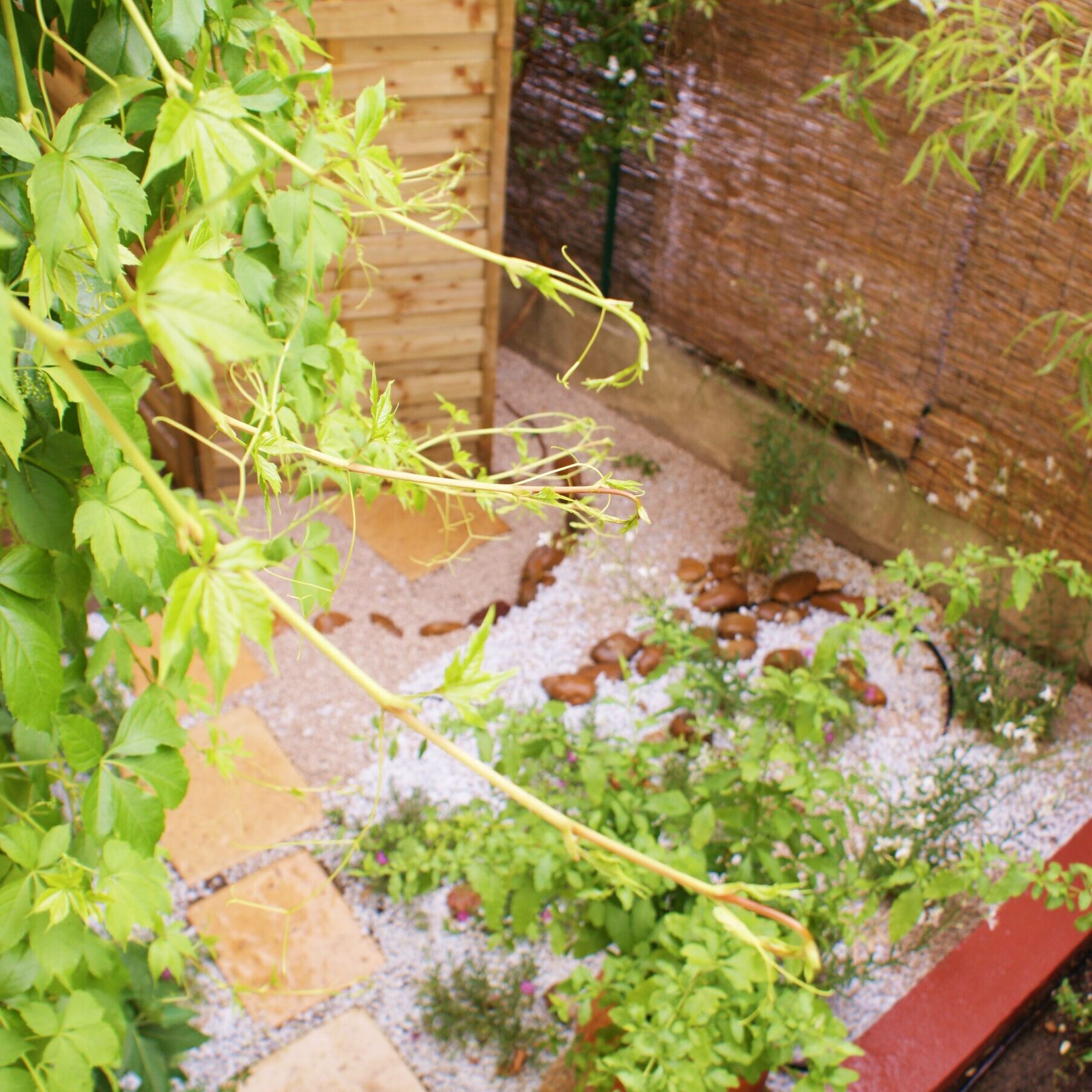 Ce jardin a été réalisé avec un petit budget pour une rénovation globale par le remploi des pots, des végétaux existants…