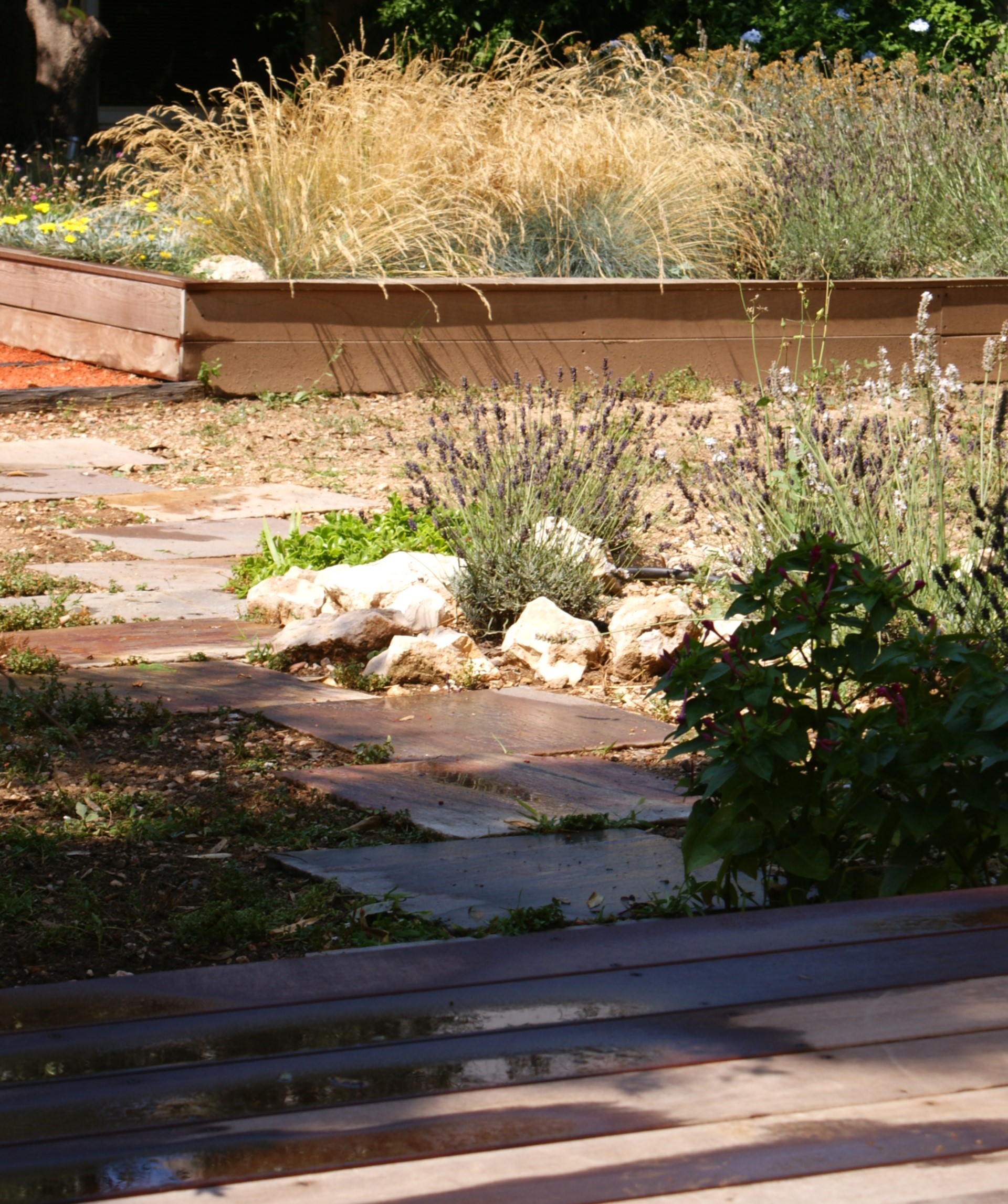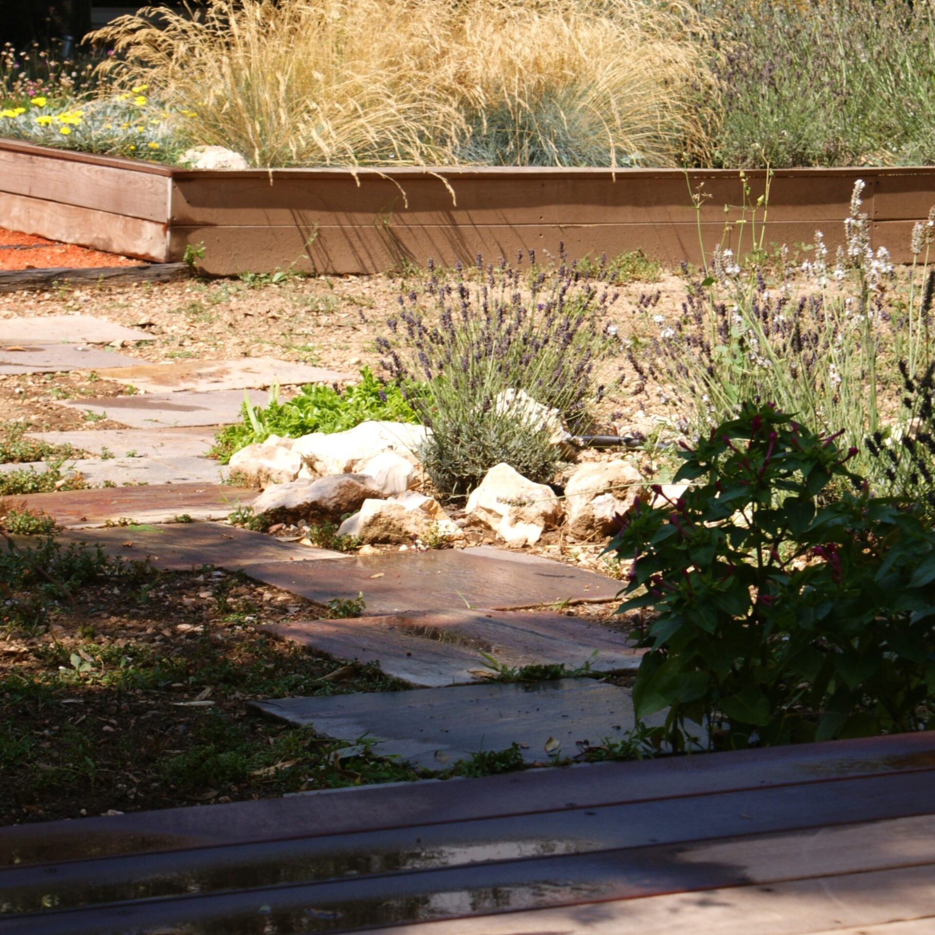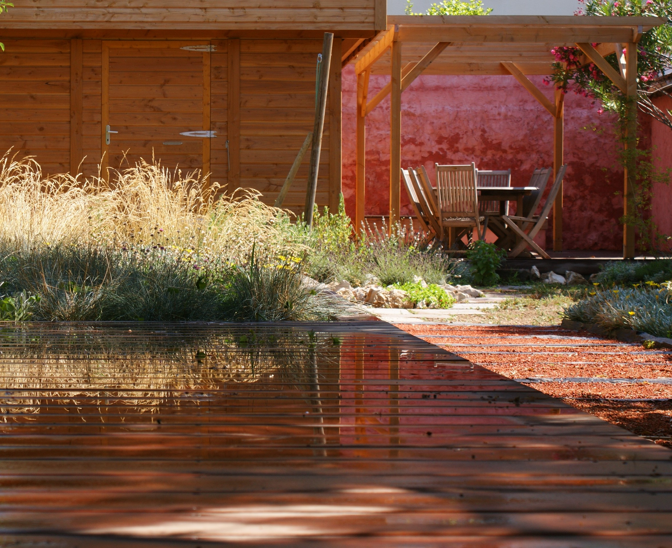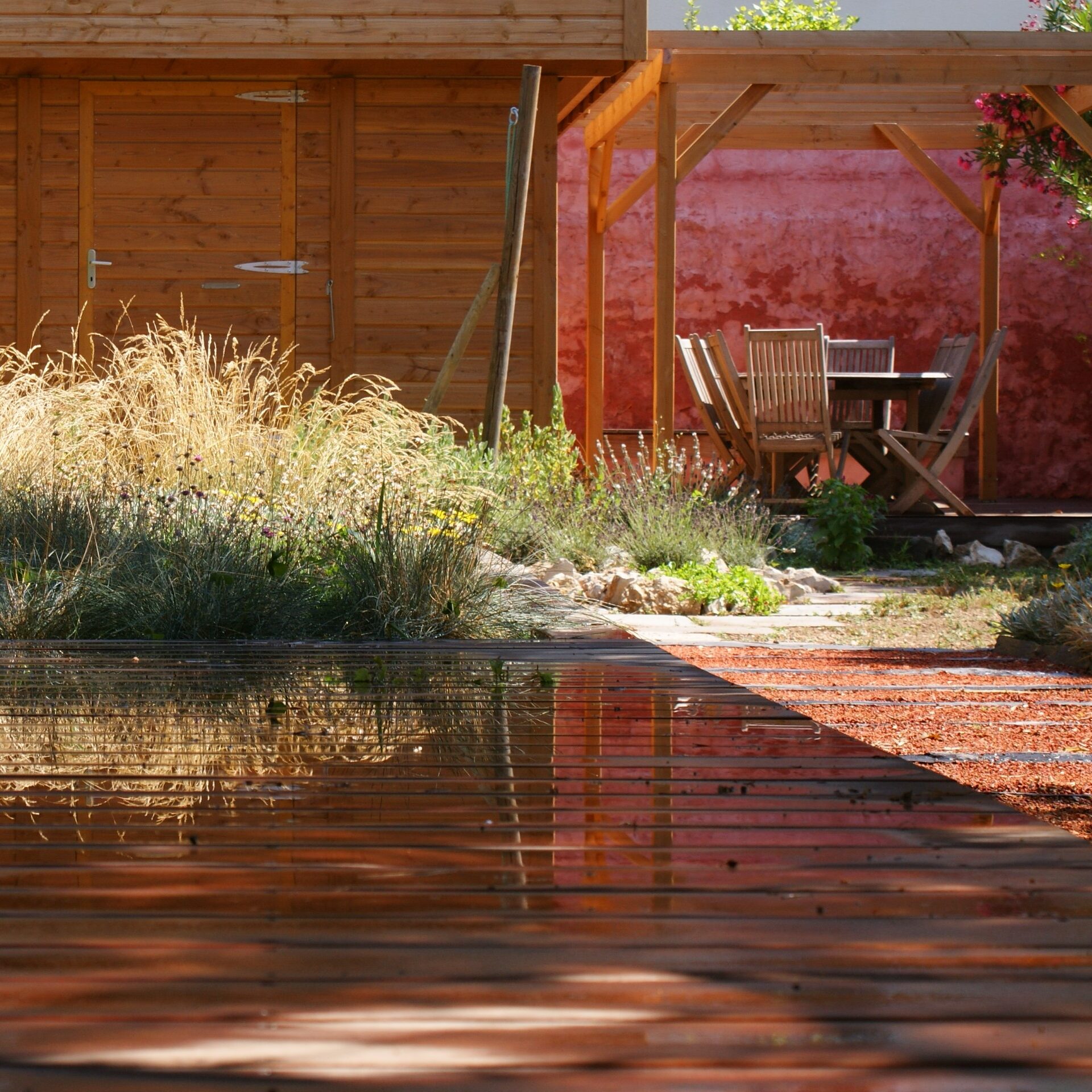 La terrasse principale en bois exotique se trouve au niveau de la baie vitrée du séjour, prolongée par un parterre de graminées et de vivaces rampantes, apportant mouvement et douceur.