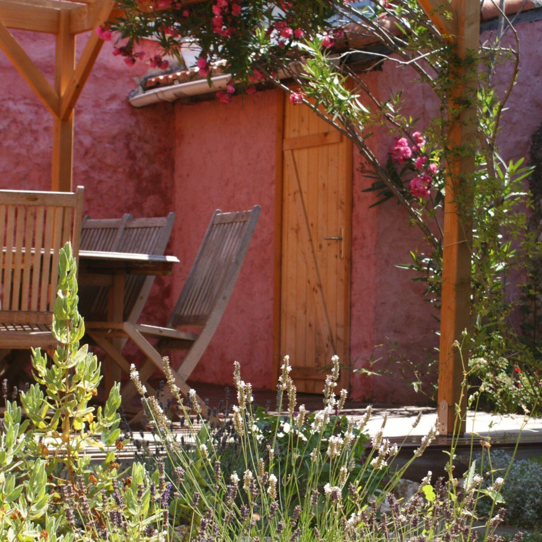 L’espace de vie, adossé au mur mitoyen, se compose de deux terrasses en bois : l’une pour les repas en famille, l’autre dédiée à la détente, avec des poteaux pour hamacs, sous la pergola.
