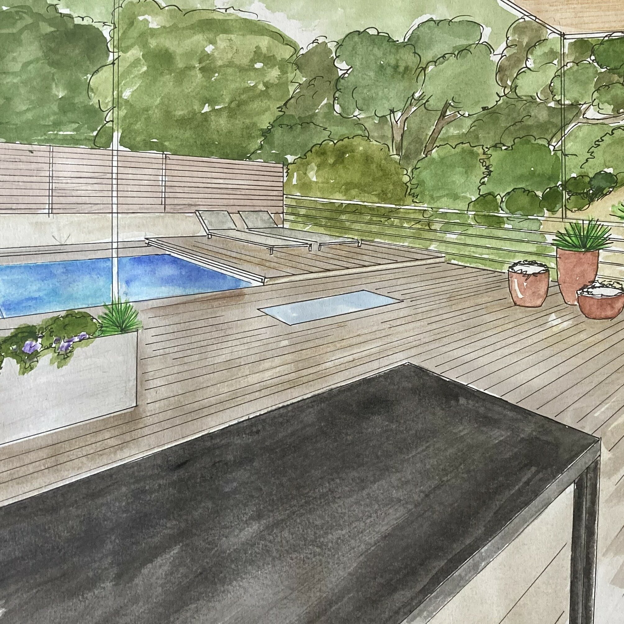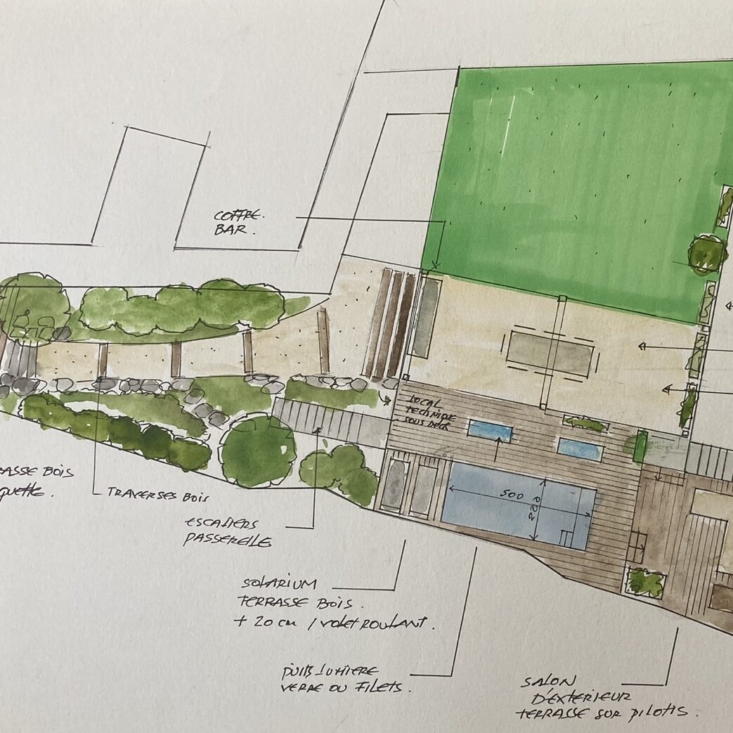 Le projet de design extérieur, l’installation d’une piscine dans le prolongement de la terrasse panoramique de plus de 120 m2 au niveau 4, pour créer un espace de vie ouvert sur la mer, le paysage, avec la pergola de l’espace repas, le salon d’extérieur, la cuisine d’été, le solarium…