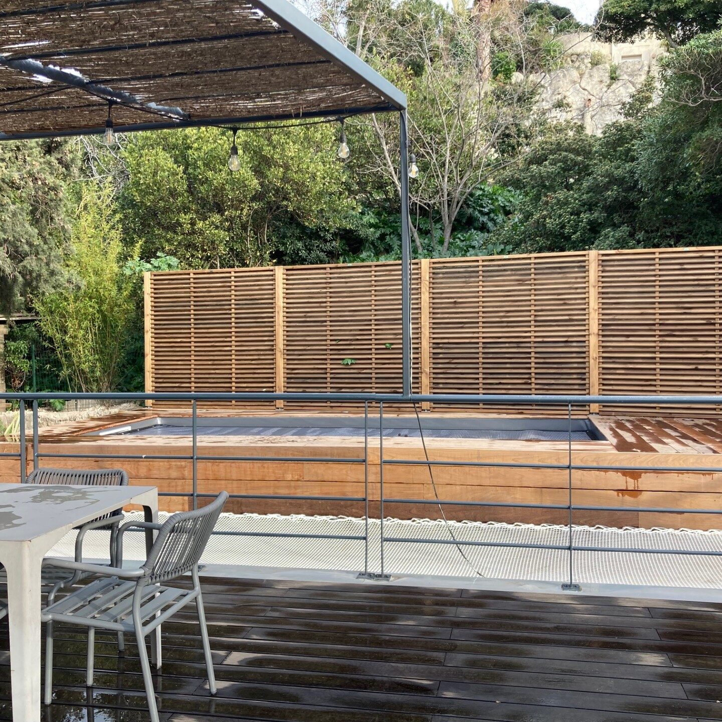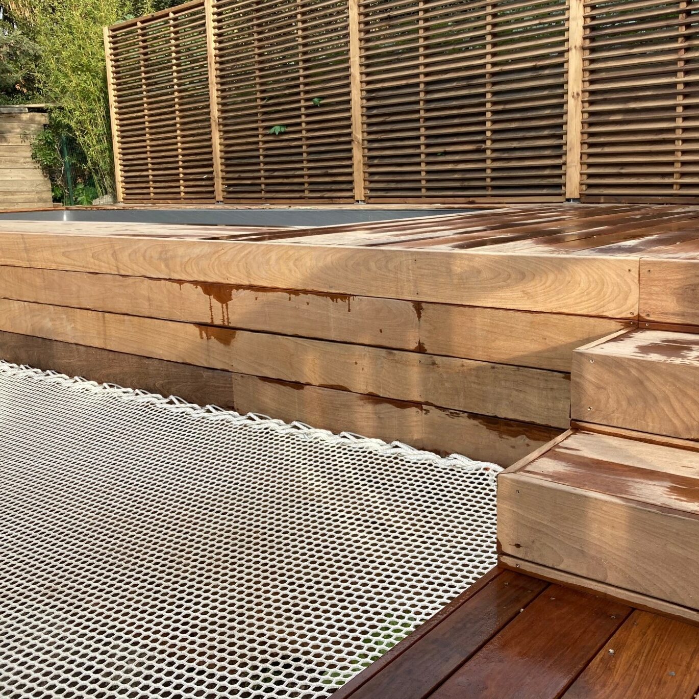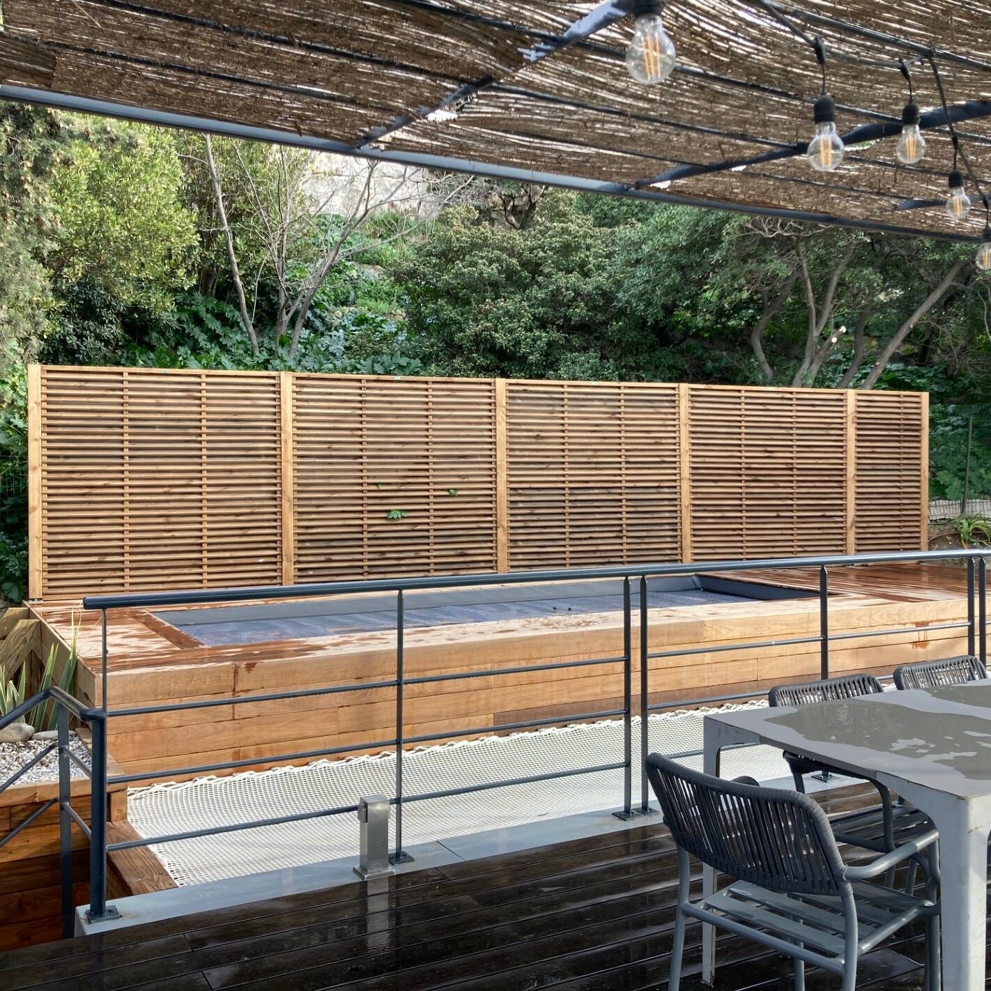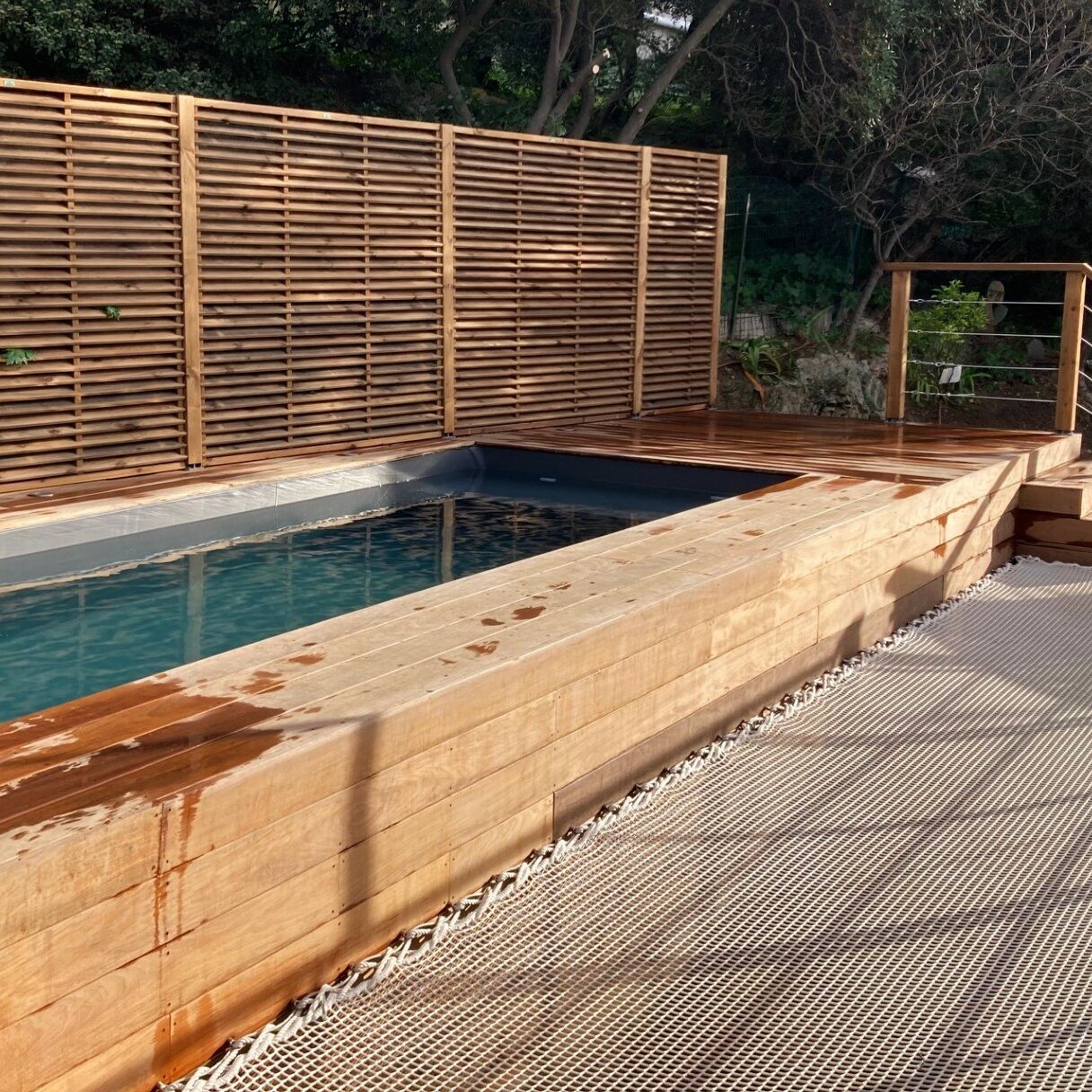 La mini piscine de 5 x 2 mètres en bois, sur une bande étroite, surélevée de 30 cm pour optimiser la vue sur la mer, à droite et à gauche, des terrasses en bois exotiques, des panneaux bois en limite du terrain, un filet de bateau sur le vide du séjour laisse entrer la lumière dans le séjour, dans le vide, des végétaux exotiques habillent le bardage bois de la piscine.