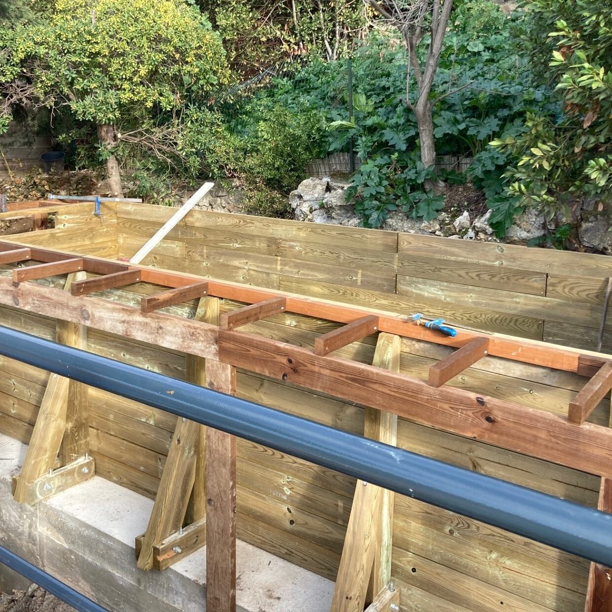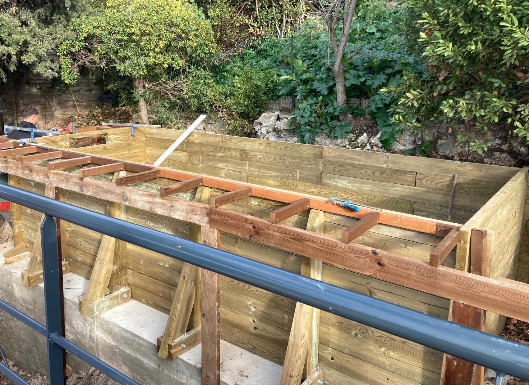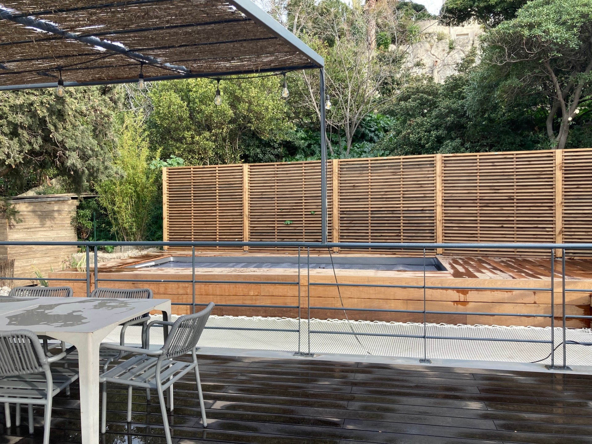 Un chantier difficile et exigeant, des travaux de terrassement en partie dans la roche, la réalisation d’une dalle béton supportant le poids de la mini piscine en structure bois, l’acheminement des matériaux de la ruelle jusqu’au niveau 4.