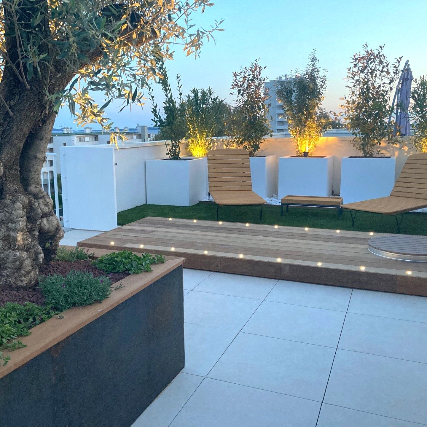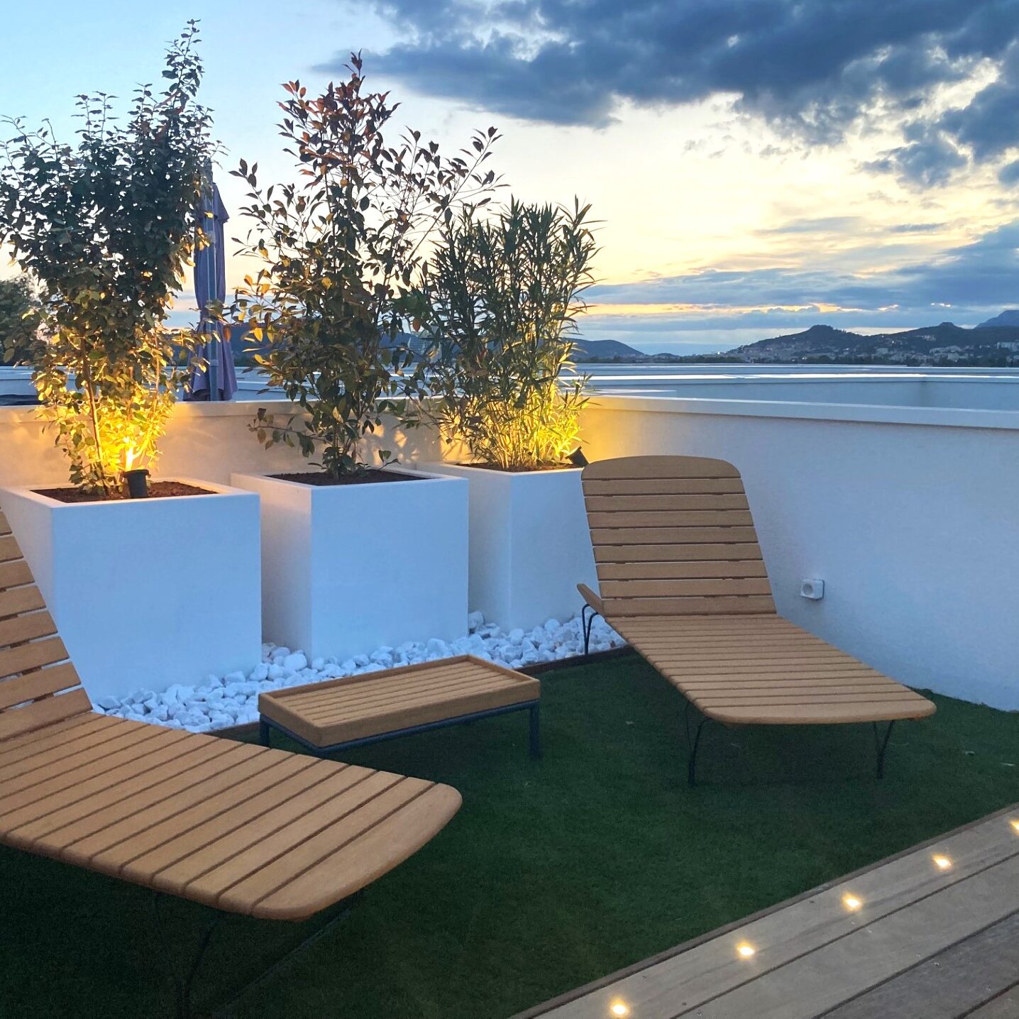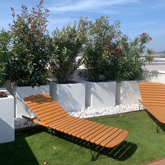 Le solarium, les bains de soleil protégés de la vue sur la terrasse voisine par des bacs plantés d’arbustes persistants, le sol en gazon synthétique.
