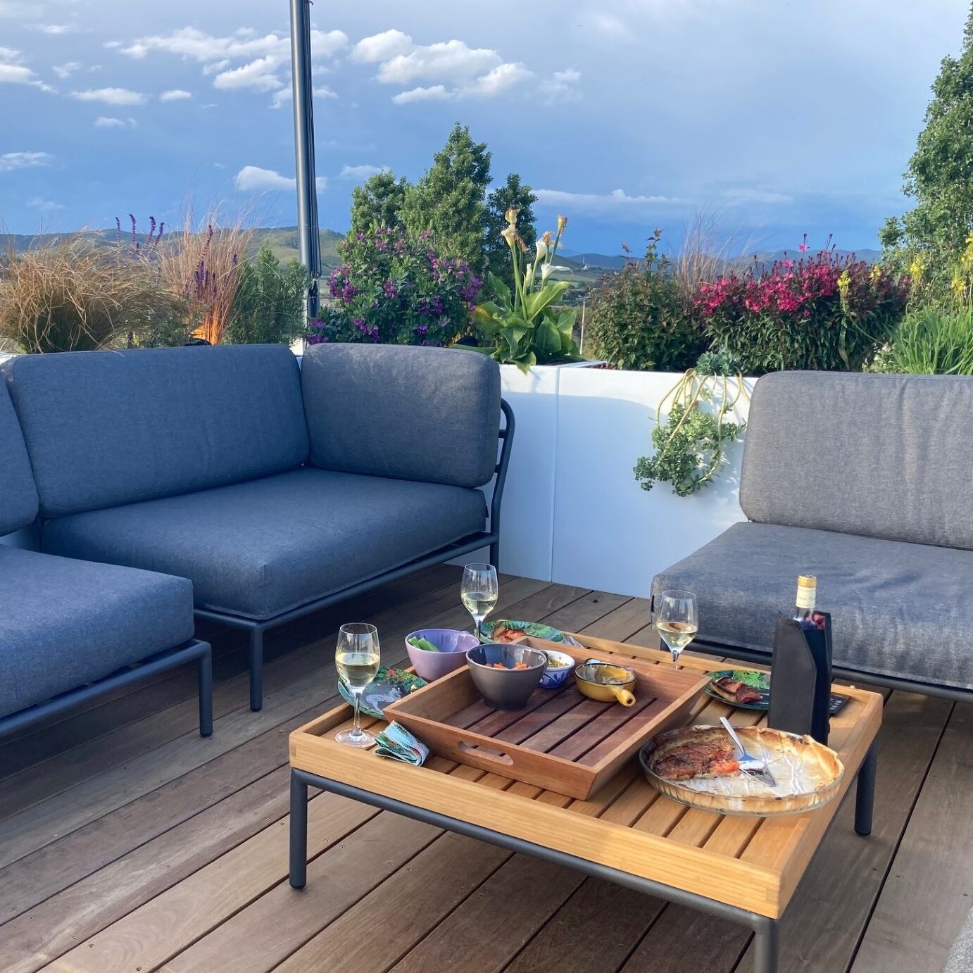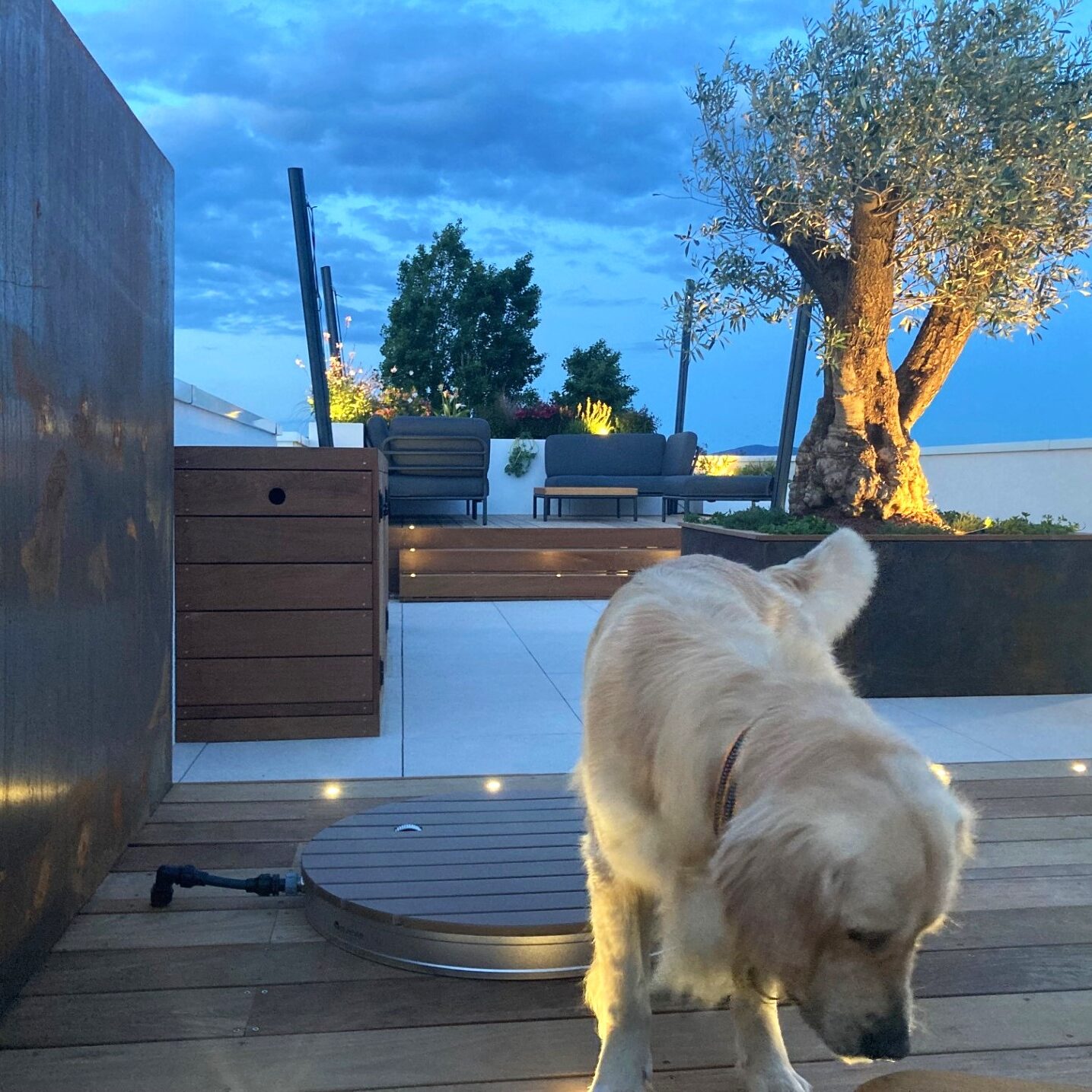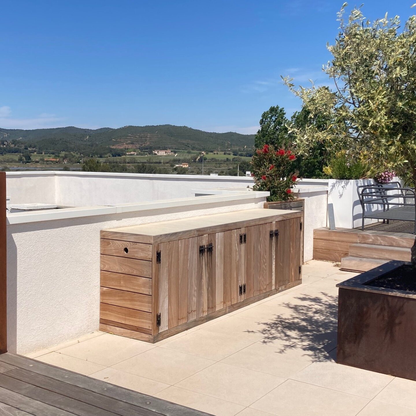 L’espace de réception, au centre, le meuble de rangement en bois exotique à la fois, bar, placards pour le barbecue, la vaisselle, le bac de l’olivier en acier Corten.