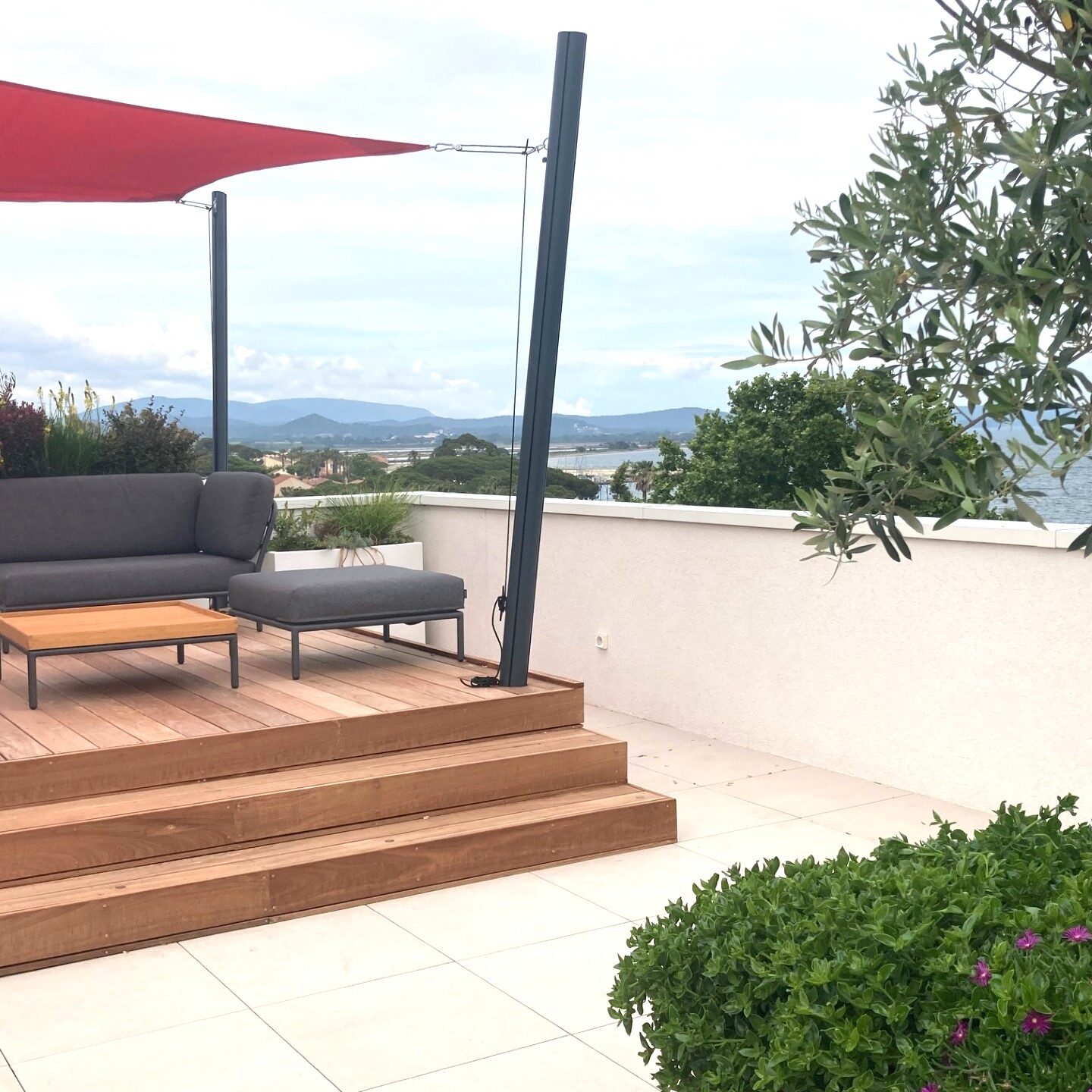Les mats de la voile d’ombrage sont amovibles pour répondre au règlement de copropriété et se rangent sous l’estrade