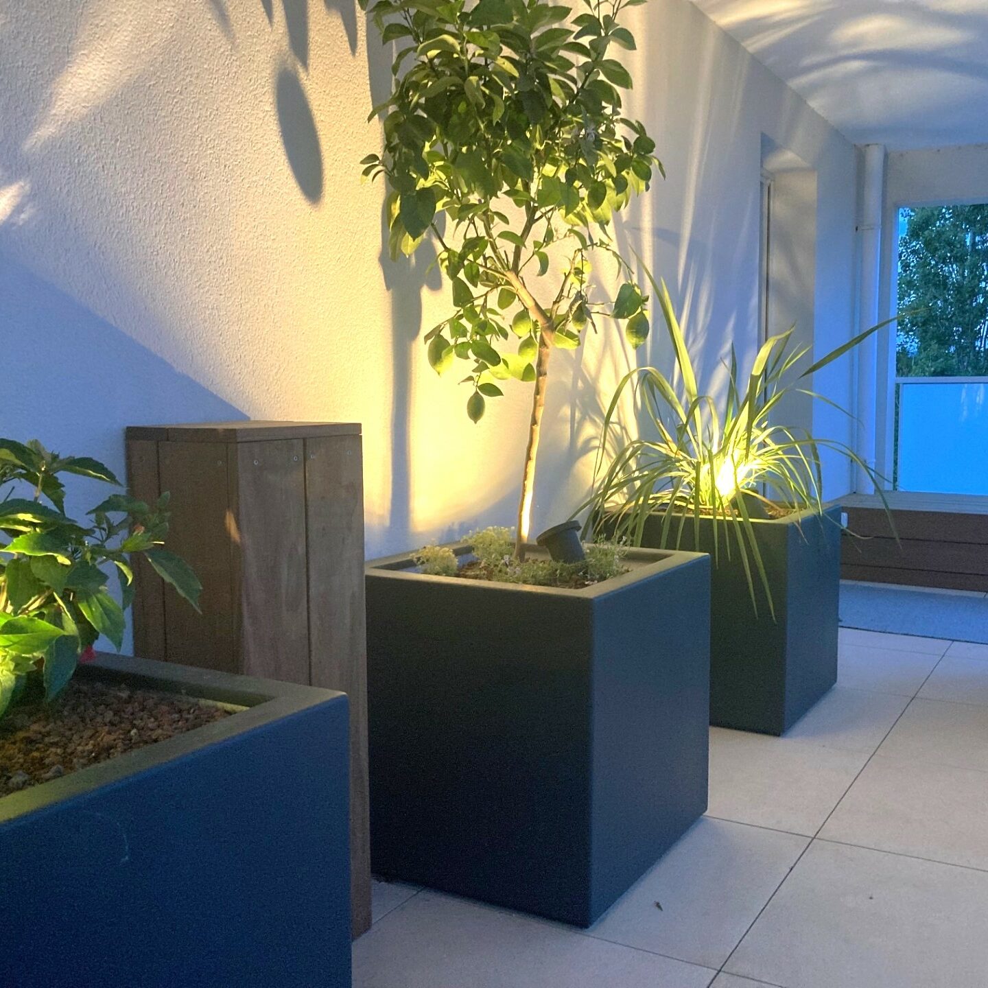 Les bacs blanc pur de la marque ADEZZ, végétalisé de plantes méditerranéens, petits arbustes et vivaces aux floraisons étalées