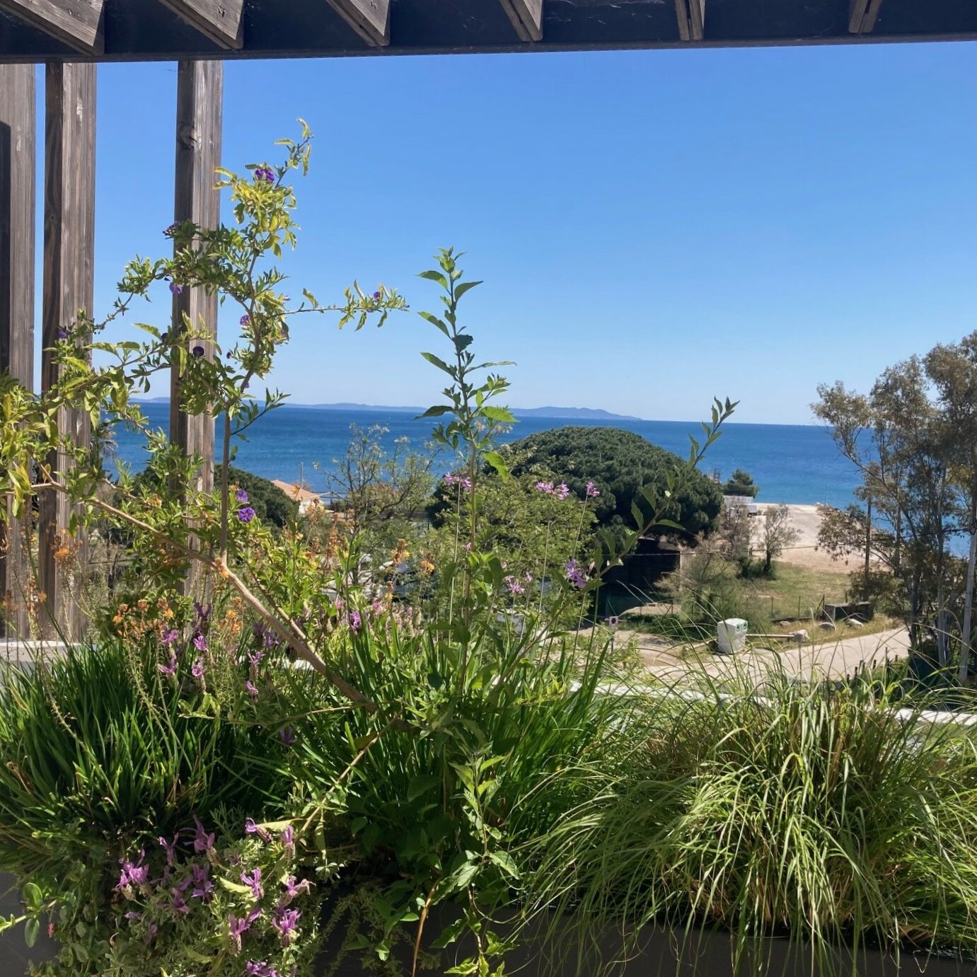 L’espace repas ouverte sur l’horizon, une grande table rectangulaire, des bacs étroits pour limiter l’emprise au sol, un coffre de rangement.