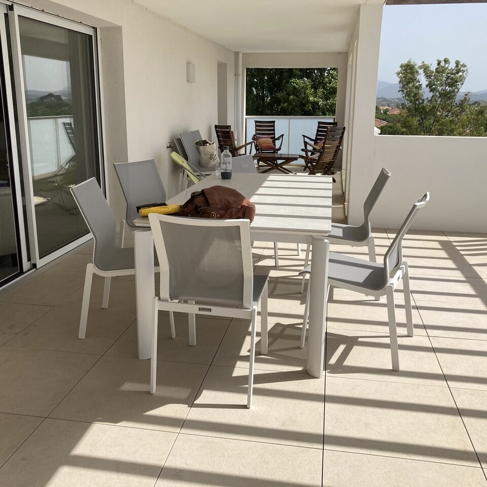 La terrasse a été segmentée en plusieurs espaces de vie, l’espace repas, un petit coin salon.